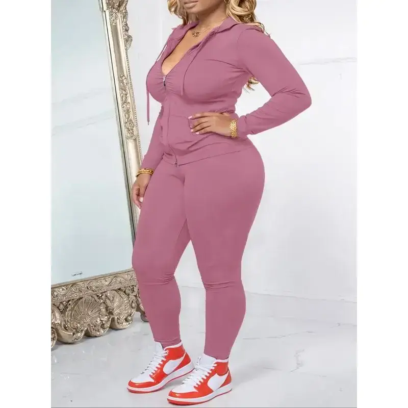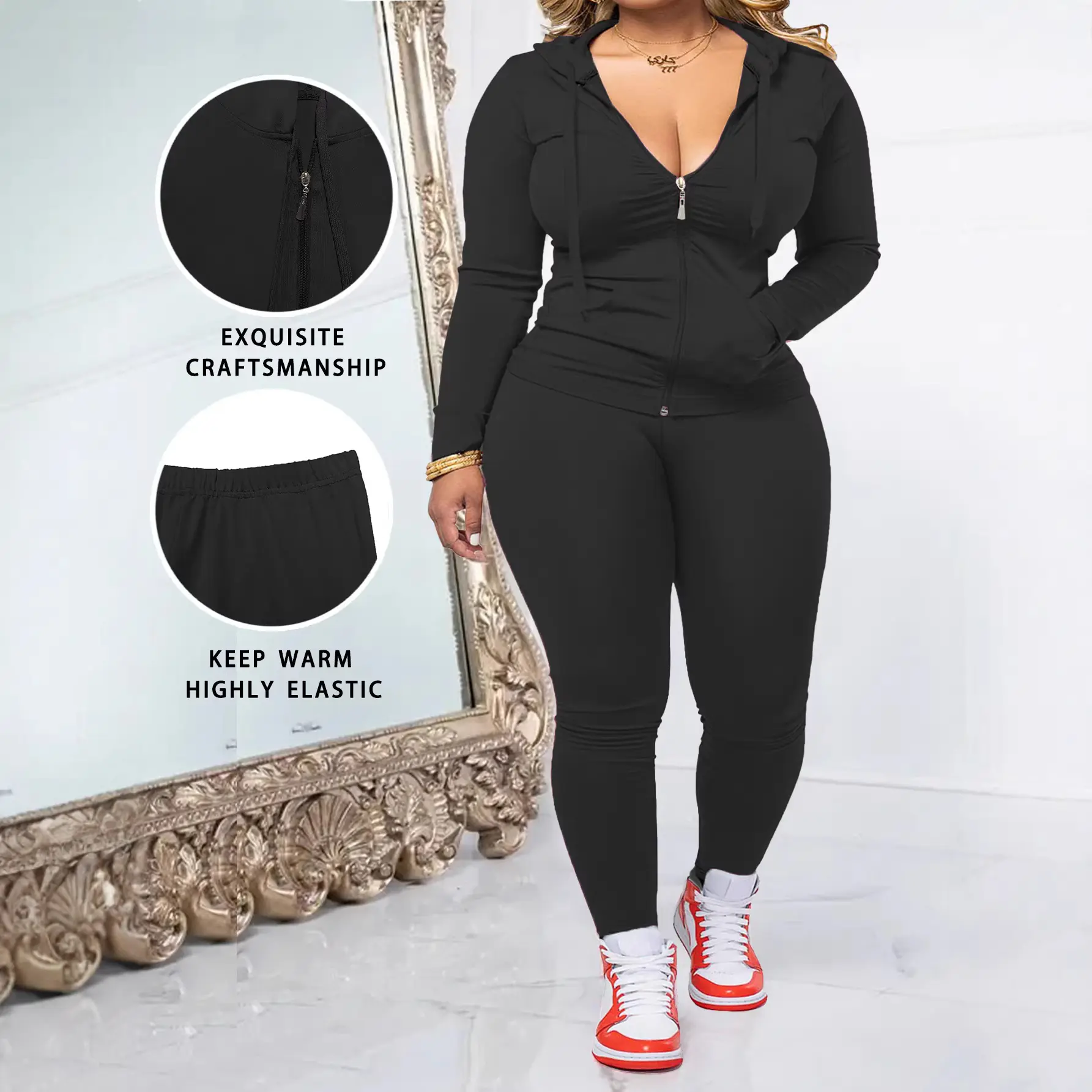 ��Oversized Fit��: Features a relaxed oversized fit, allowing for full range of motion during workouts and leisure activities. ��Knit Fabric��: Crafted from moderate thickness knit fabric, providing warmth and softness for fall and winter wear. ��Practical Zipper��: Includes a functional zipper on the long-sleeve jacket, enhancing convenience during wear and layering. ��Chain Print��: Adorned with a fashionable chain print, offering a unique visual element that distinguishes it from typical workout outfits. ��Matching Set��: Comes as a two-piece set, pairing a fitted bodysuit with pants for a coordinated look in active wear.