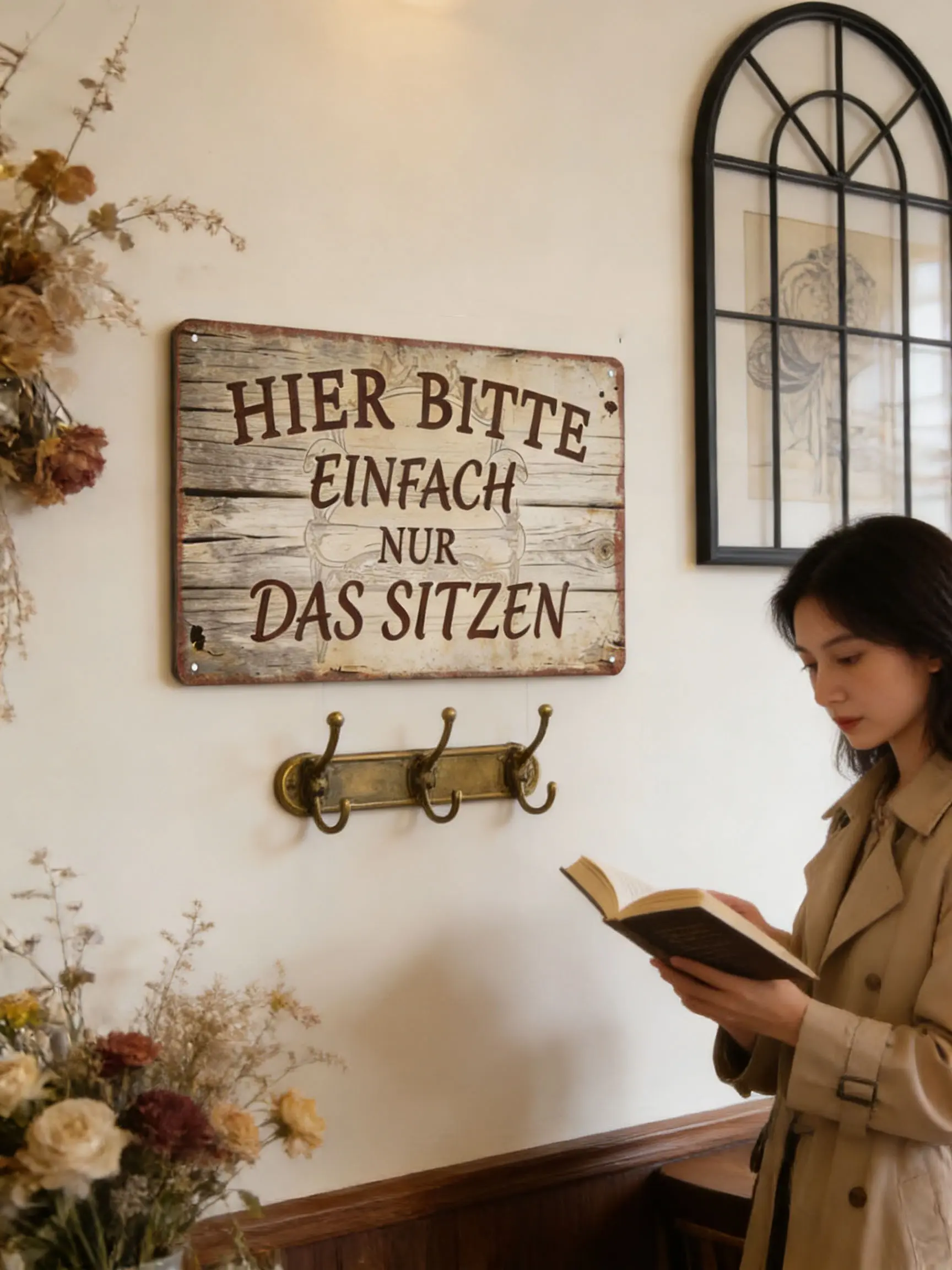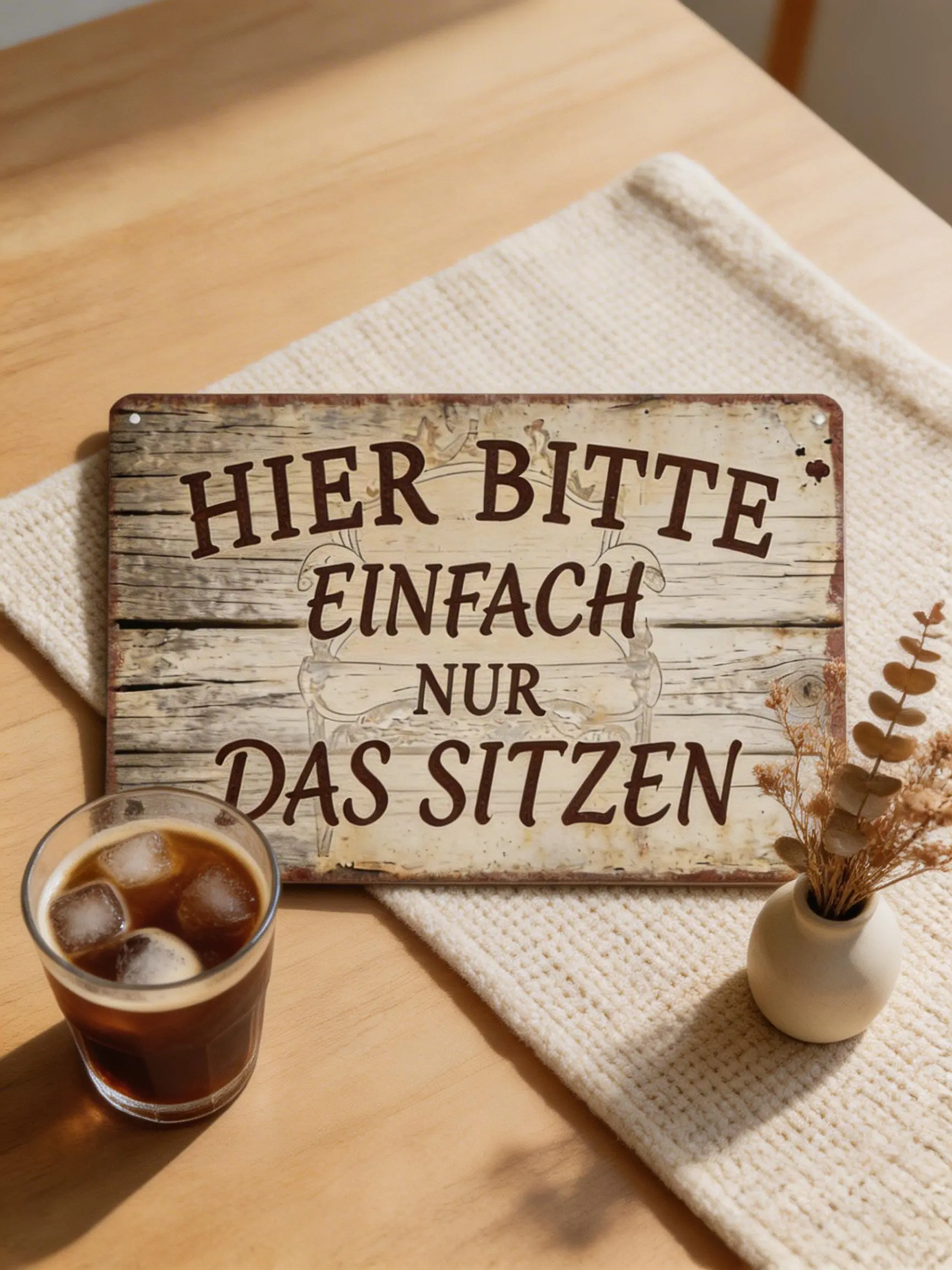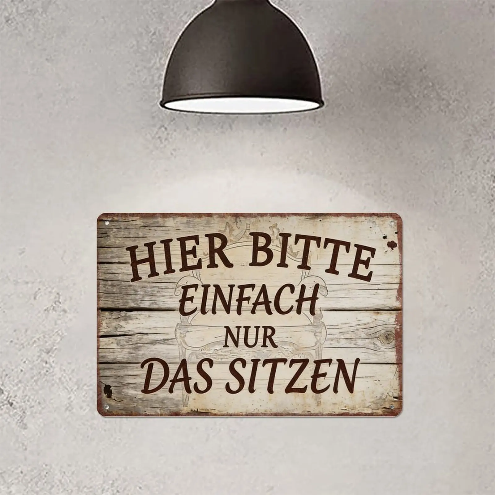 ·Funny German Sign: "Hier Bitte Einfach Nur Das Sitzen" – a humorous metal sign perfect for German speakers. Ideal for home bars, cafes, or living rooms. Adds a vintage, distressed wood style to any space. Dimensions: 8×12 inches (20×30cm).