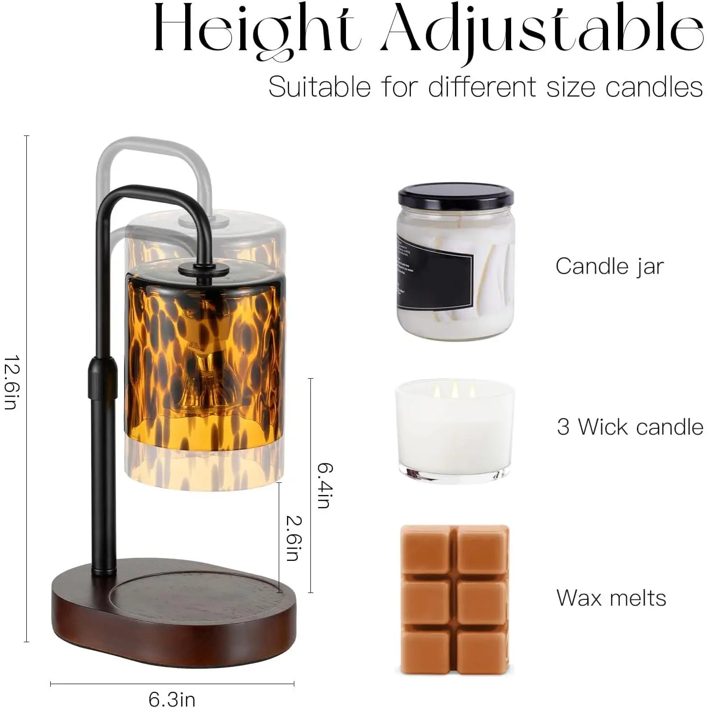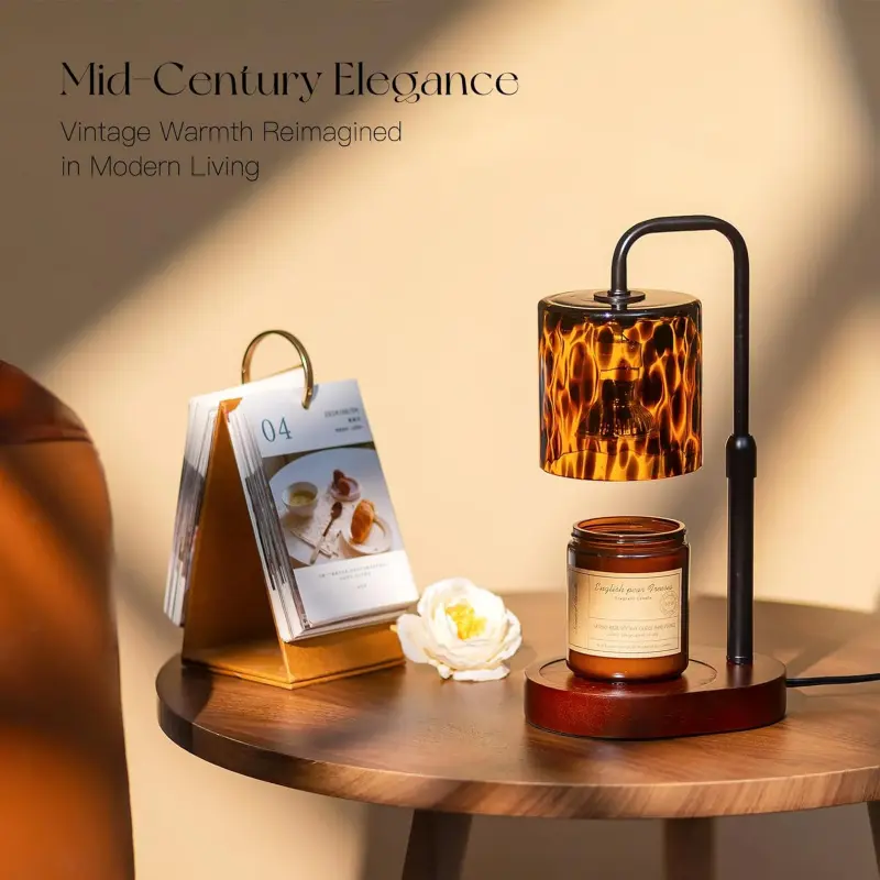 IDEAL GIFT: Featuring a unique tortoise shell design, the vintage appearance and practical performance make the Candeldo candle warming lamp a perfect gift for moms, sisters, friends, and candle enthusiasts on Christmas, birthdays, Mother’s Day, and Valentine’s Day. VERSATILE DECOR: The Candeldo candle lamp blends vintage charm with modern elegance, making it a perfect fit for mid-century style interiors. Featuring a translucent glass lampshade with a graceful leopard-print swirl design, candle warmer lamp casts a soft, ambient glow that enhances any room. A stylish addition to your bedroom, office, or living space. TIMER AND DIMMER: Candeldo electric candle warmer has 3 timer setting of 2 hours, 4 hours and 8 hours so that you can turn it on and feel free to forget it. The candle lamp has 4 brightness settings, allowing you to adjust the intensity of the heat on the candle. NO FIRE AND NO SMOKE: Candeldo candle wax warmer can warm up your scented candles and disperses the scent without having to light the candle, so you don't have to worry about forgetting to put your candle out before going to bed. Lamp candle warmer is also a great safe option for families with young children or pets. HEIGHT ADJUSTABLE: Candeldo wax warmer lamp has the function of height adjustable, allowing you to adjust the height according to your needs. Candle warmer light makes candles last much longer than traditional burning, saving a bunch of candle money to you.