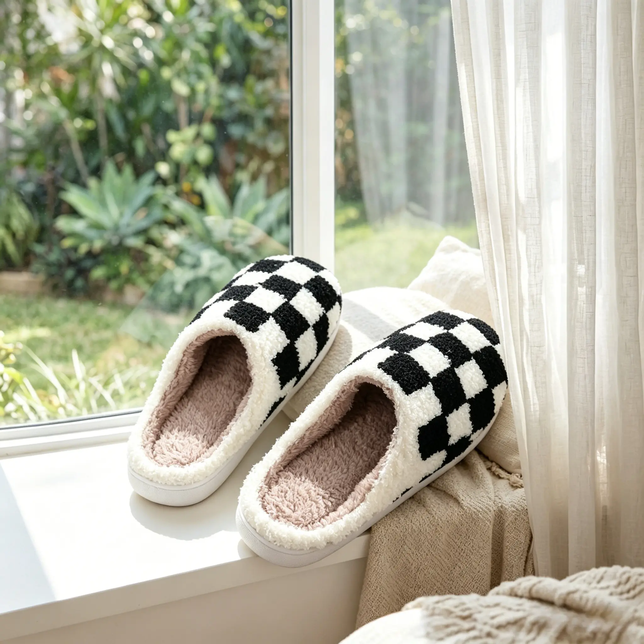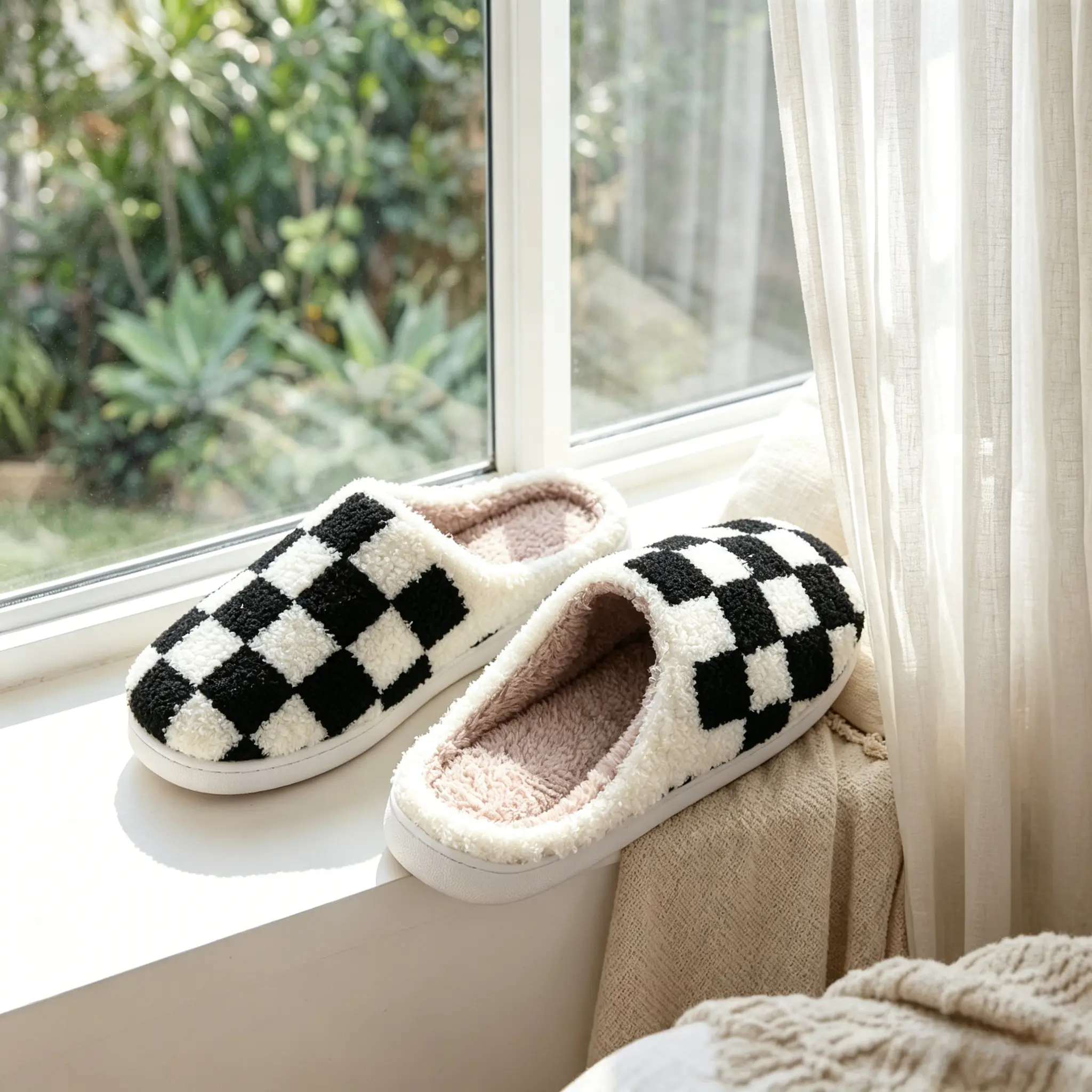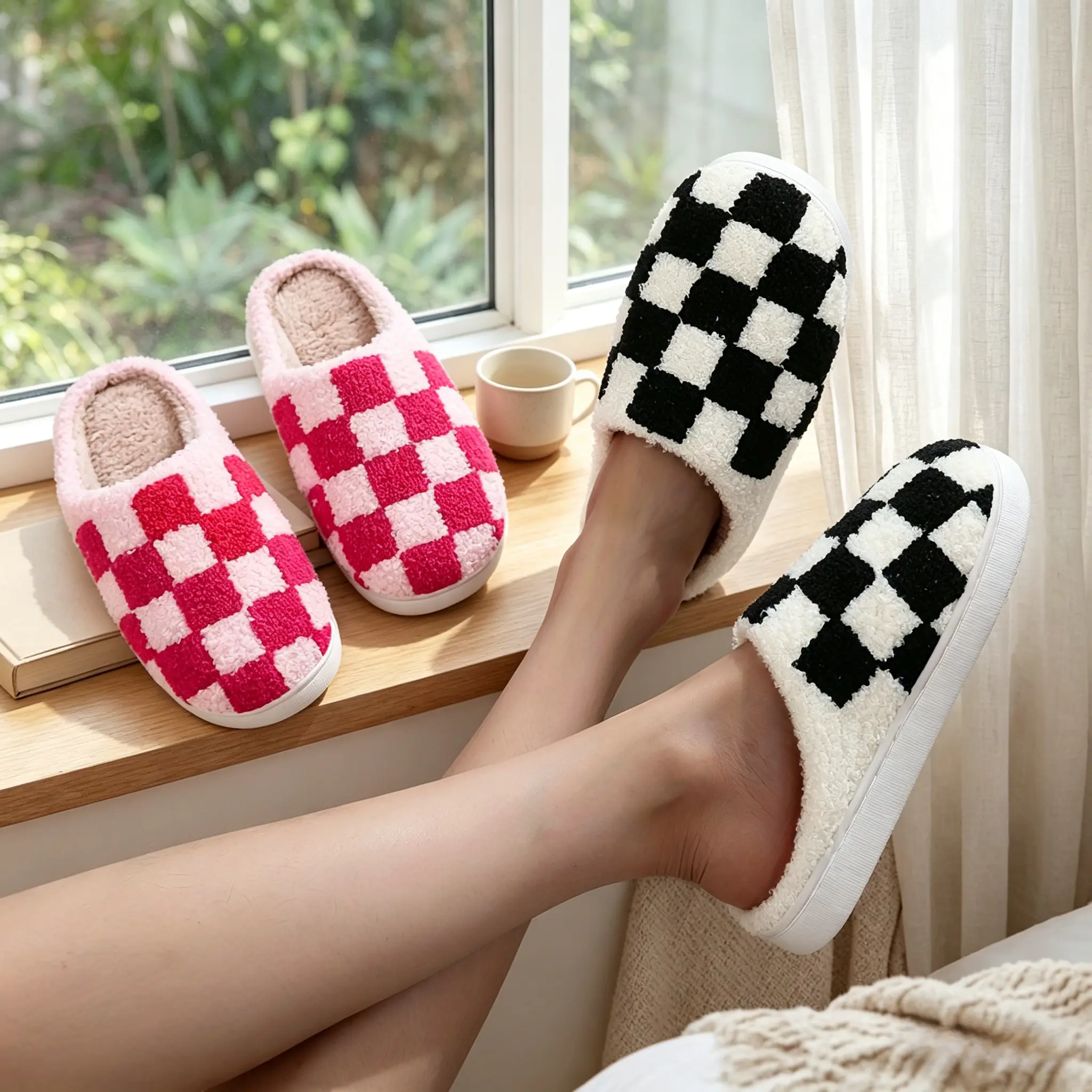 These checkered fuzzy slippers are perfect for indoor use. They offer a cozy, soft feel that keeps your feet warm. Ideal for couples, these slippers enhance your home's ambiance with their stylish design. The black plush lining adds an extra layer of warmth, making them a delightful choice for chilly days.