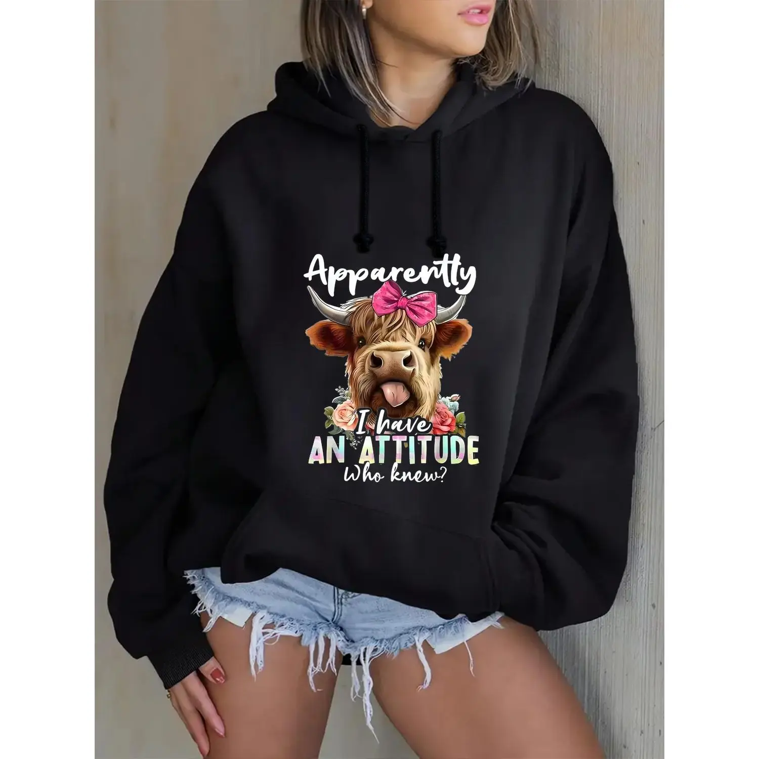 5. 180g[100%cotton]Apparently I Have an Attitude Cow Graphic Hoodie / Crewneck / T-Shirt – Fun Highland Cow Top for Women, Cute & Trendy Oversized Fall Winter Streetwear cute highland cow design highiand cow hoodie