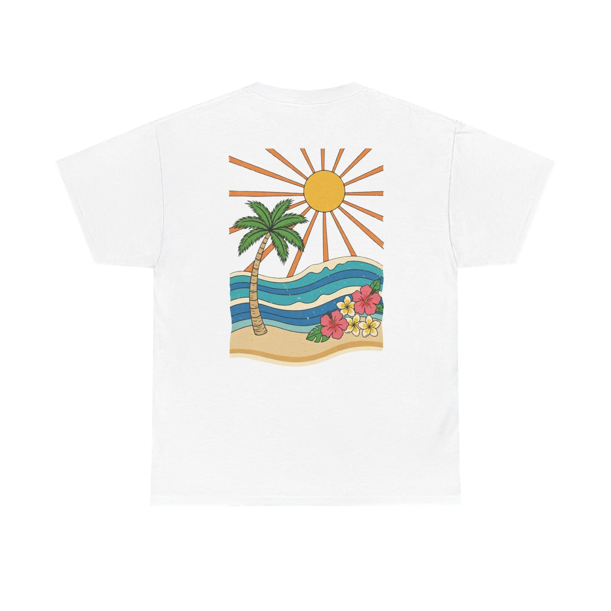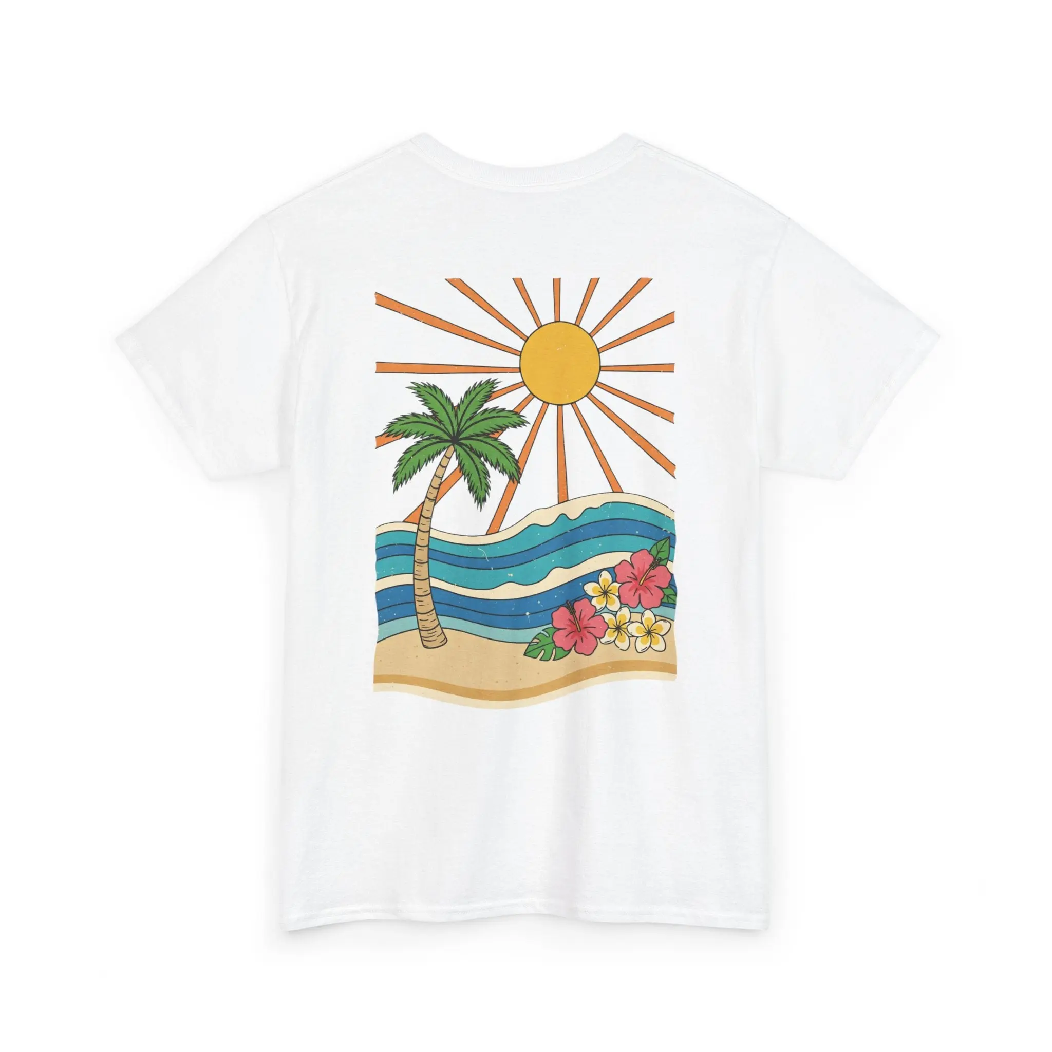 A soft, breathable cotton tee with a gentle beach-vibe design that feels like a slow afternoon by the shore. The front keeps things subtle with a small, hand-drawn sea turtle over the heart. On the back, warm sunbeams, swaying palms, rolling waves and island blooms create a nostalgic, retro postcard scene. Wear it pulled over boardshorts after a morning surf, layered under an open shirt for a bonfire, or tossed on for a roadside coffee on a coastal drive. The relaxed shape and smooth fabric let the art take center stage while staying comfortable all day. For people who collect salty mornings and sun-warm evenings, this tee slips into that rhythm effortlessly.