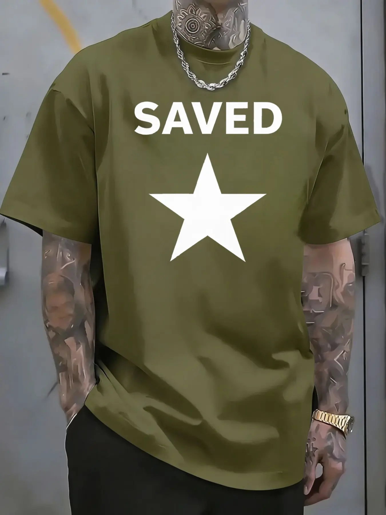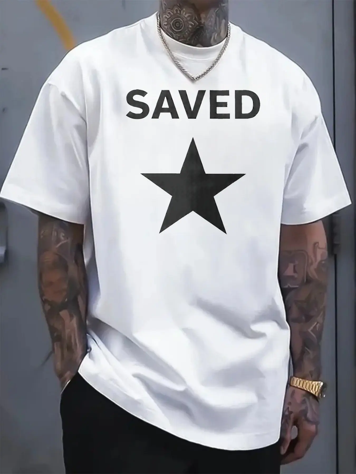 Men's T-shirt SAVED with white star print pattern, trendy short-sleeved casual street wear, versatile top for daily use