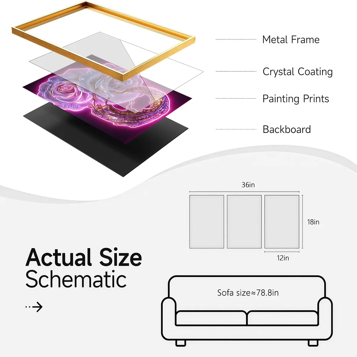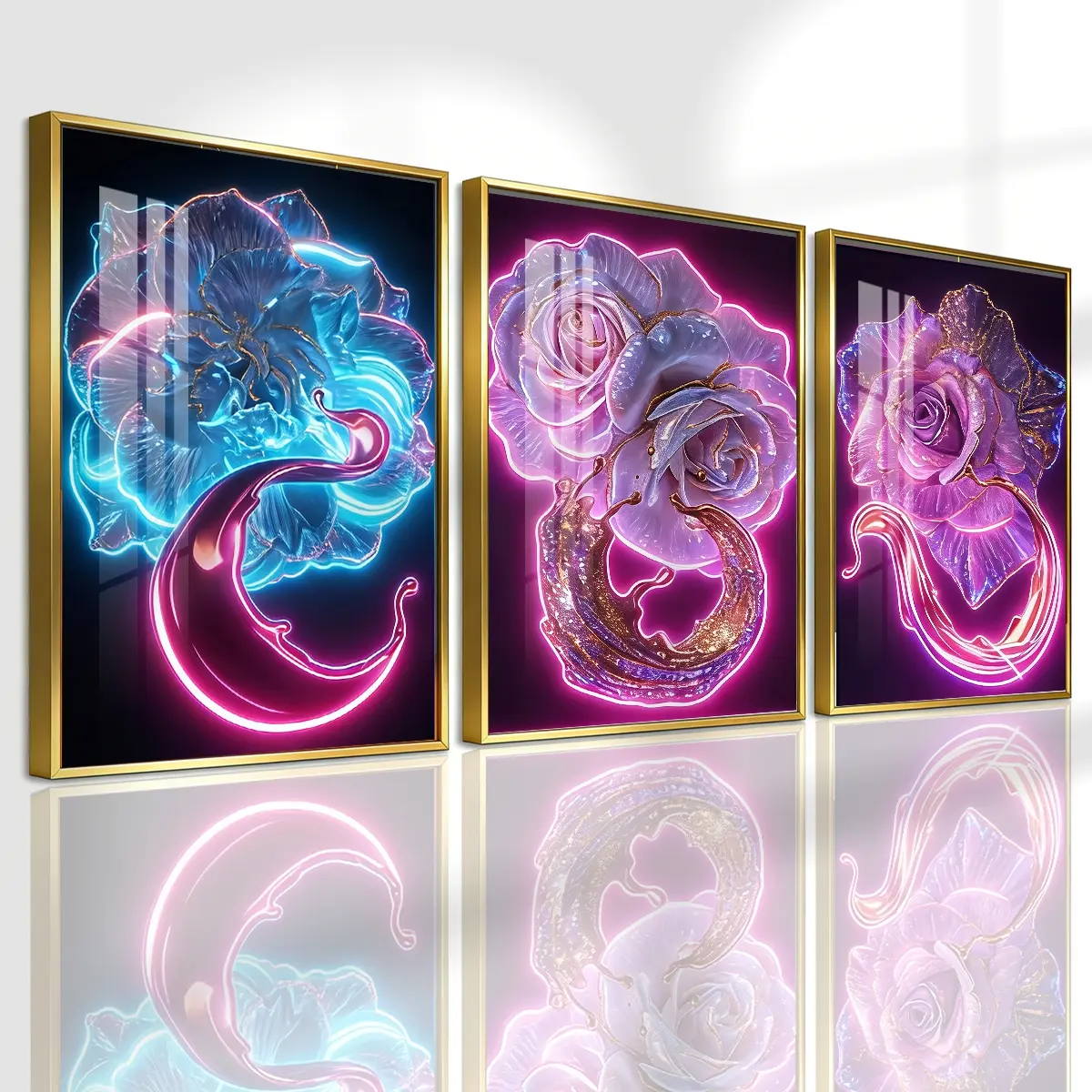 3 Counts Aluminum Alloy Framed Painting, Neon Glowing Roses And Petals Pictures, Home Decoration For Living Room, Bedroom, Office, Restaurant, Hallway Wall Decor, Odorless Print Artwork, Luxury Perfect Gift For Friends And Family
