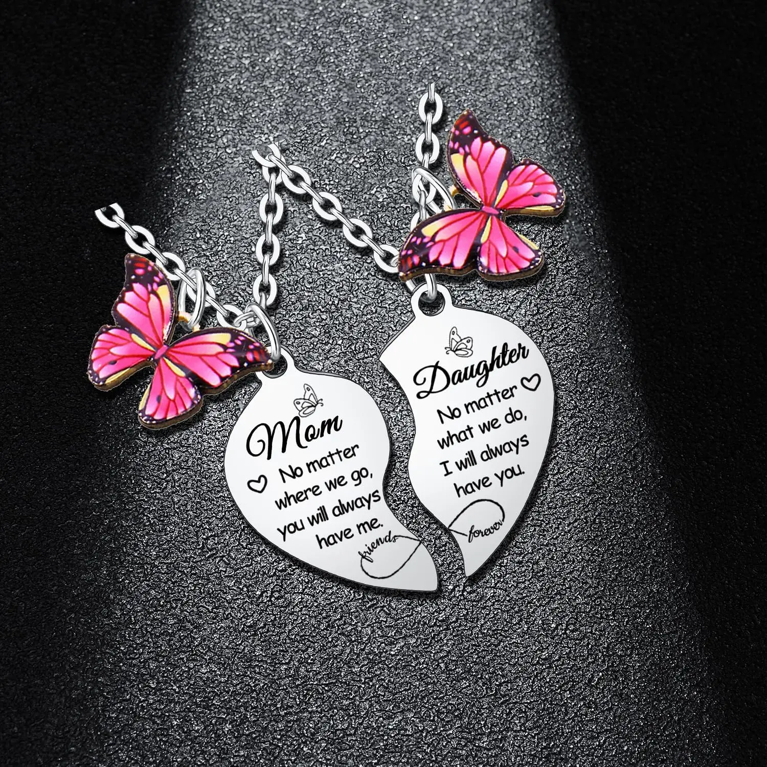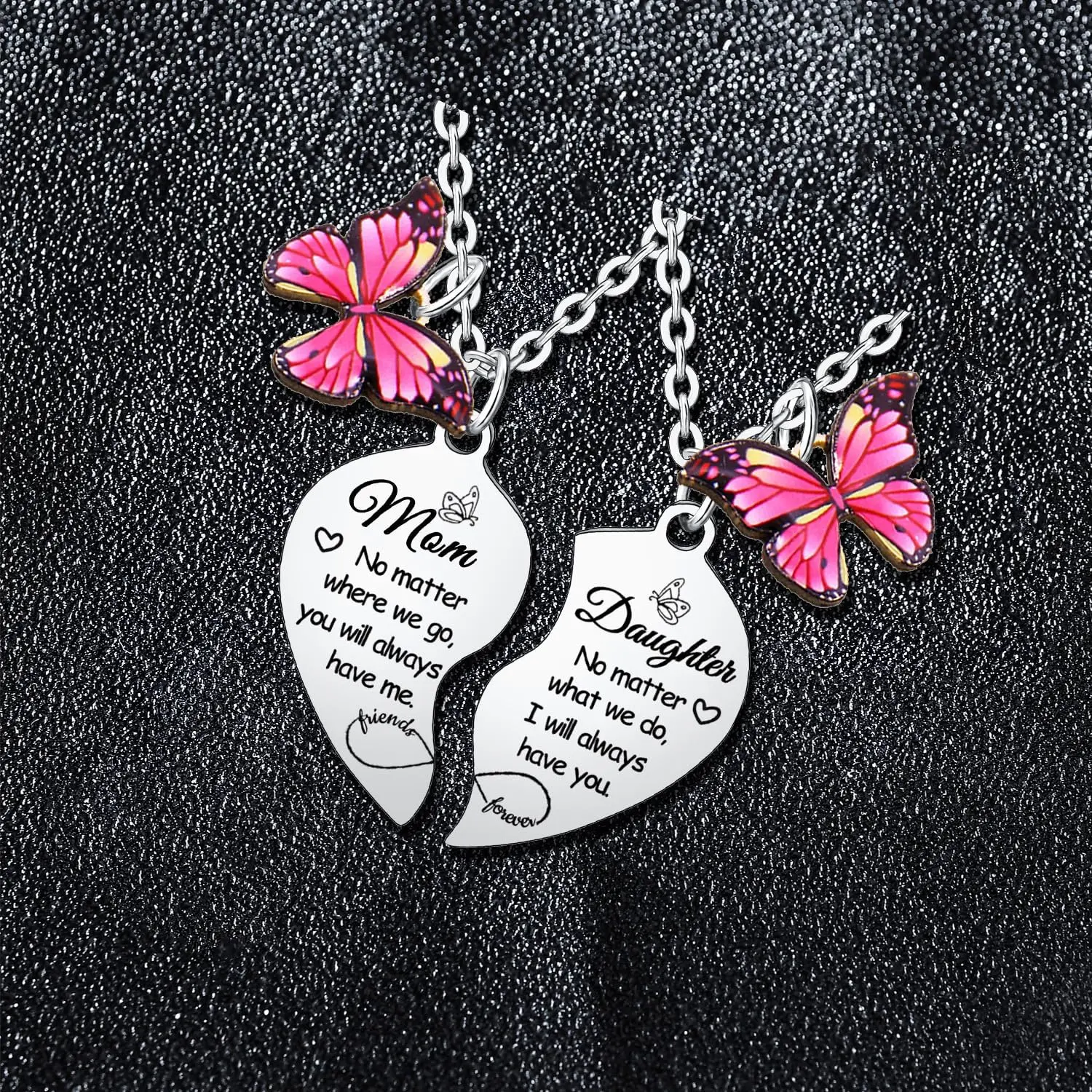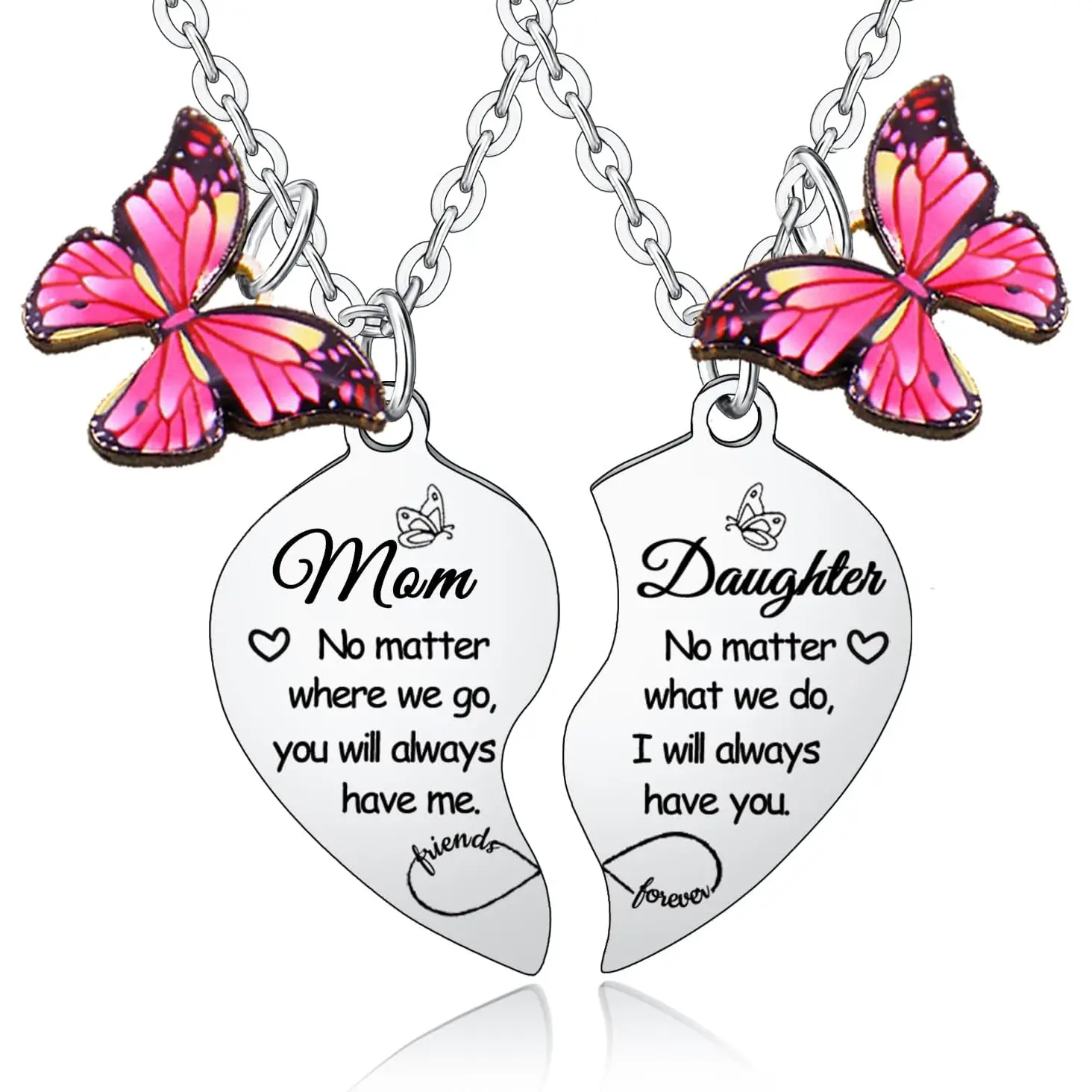 Mom necklace/ Mother daughter necklace/ Mom and daughter necklace: The mother and daughter necklaces is engraved with the thoughtful and heartwarming word : "Mom, no matter where we go, you will always have me. Daughter, no matter what we do, I will always have you. Friends forever". It is a perfect gifts for your mom. Imagine the look of your mum when she read the meaningful word, she will be touch and leaving tears of emotion and joy. Show your love and appreciation for your dear mum with the mother necklace.