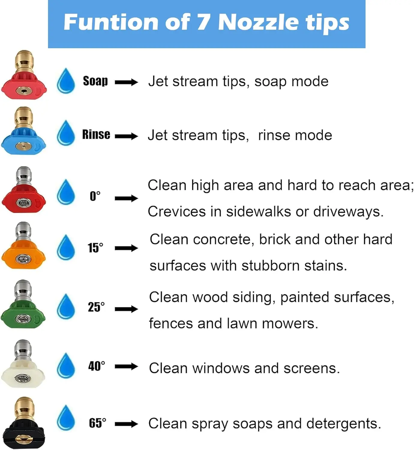 ·Package Included: 1 x pressure washer nozzle holder, 1 x rinse mode nozzle tip, 1 x soap mode nozzle tip. 1 x red nozzle (0°), 1 x yellow nozzle (15°), 1 x green nozzle (25°), 1 x white nozzle (40°), 1 x black nozzle (65°).