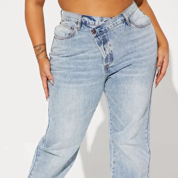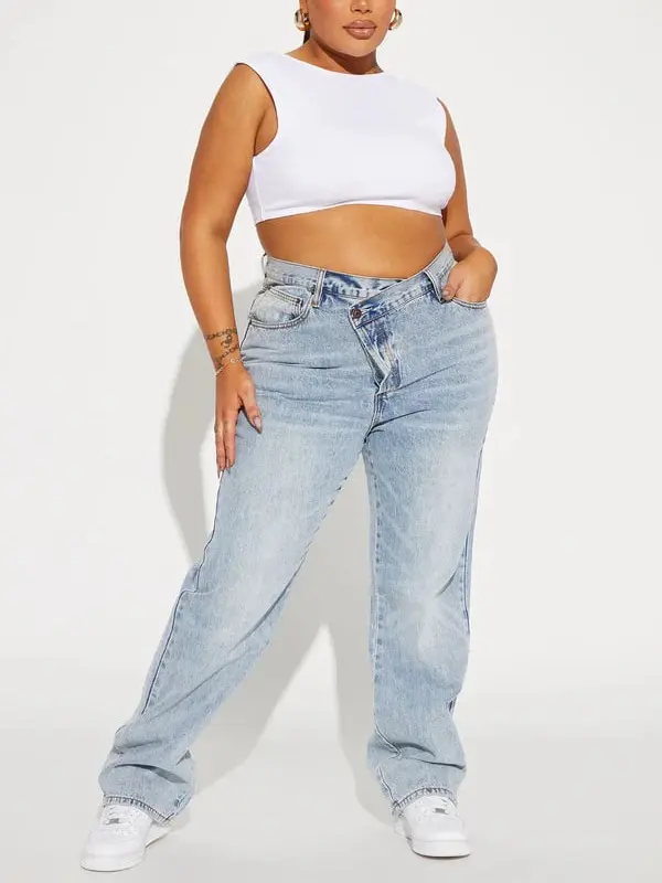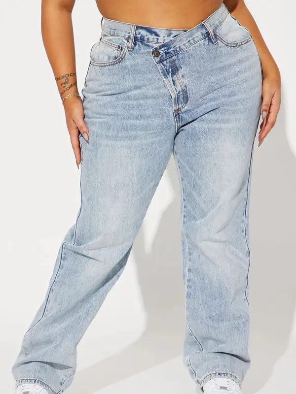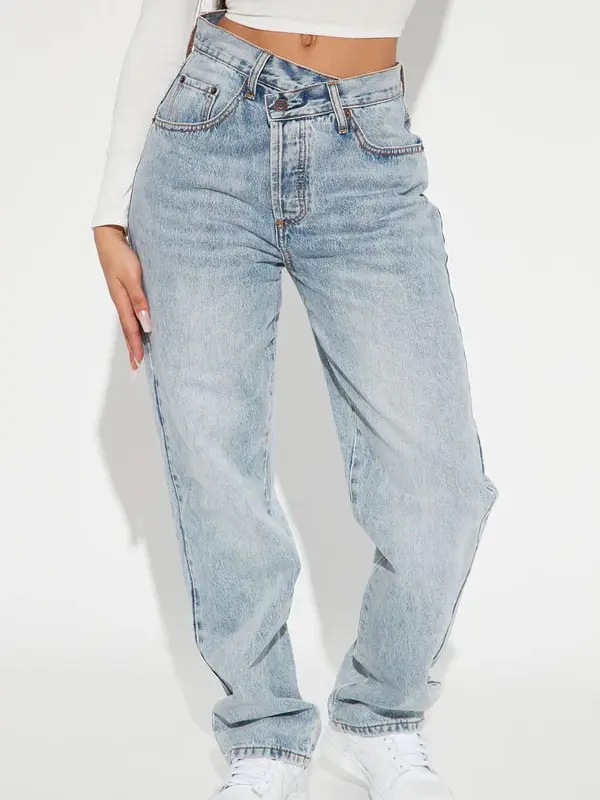 Step Waistband Crossover Jeans - Light Blue Wash