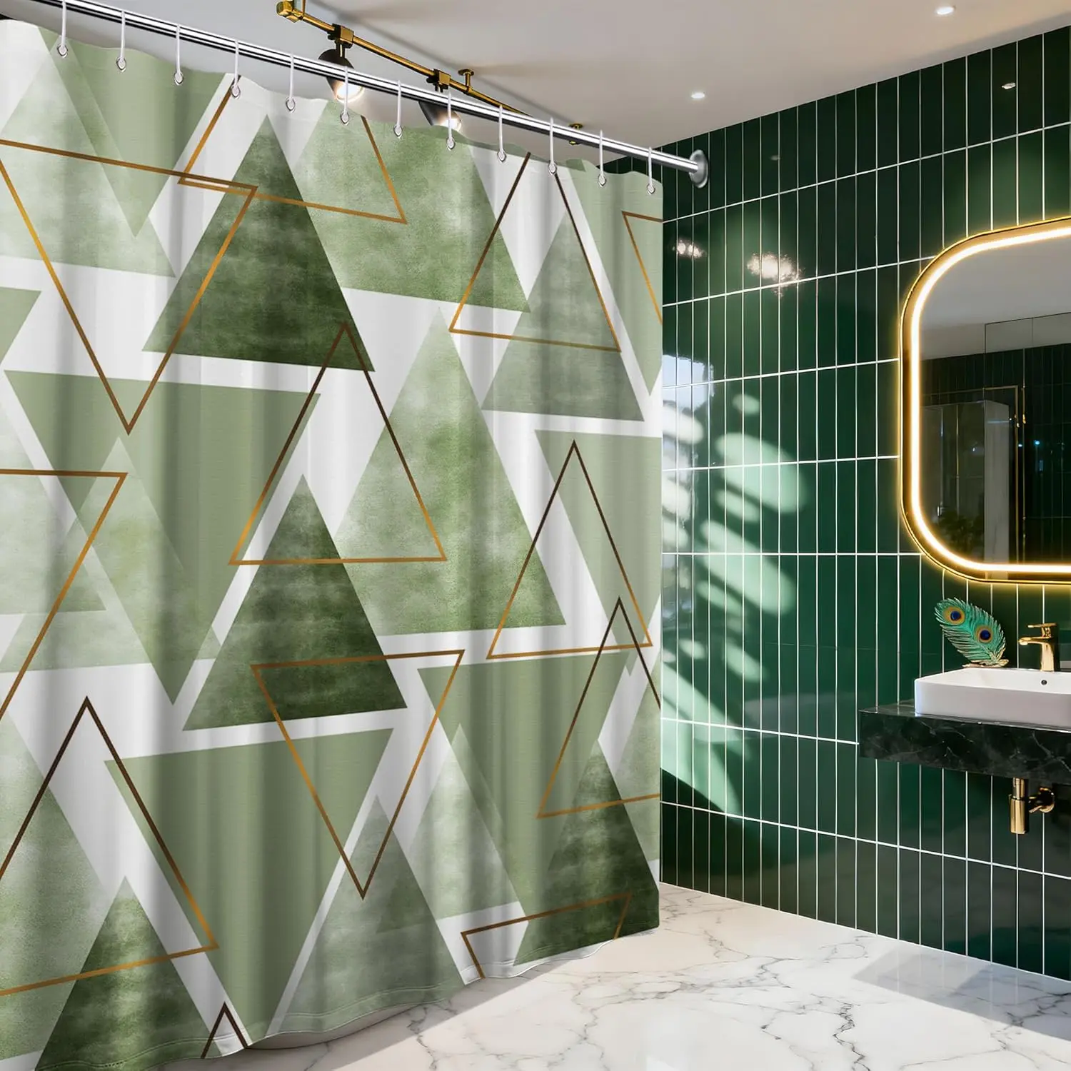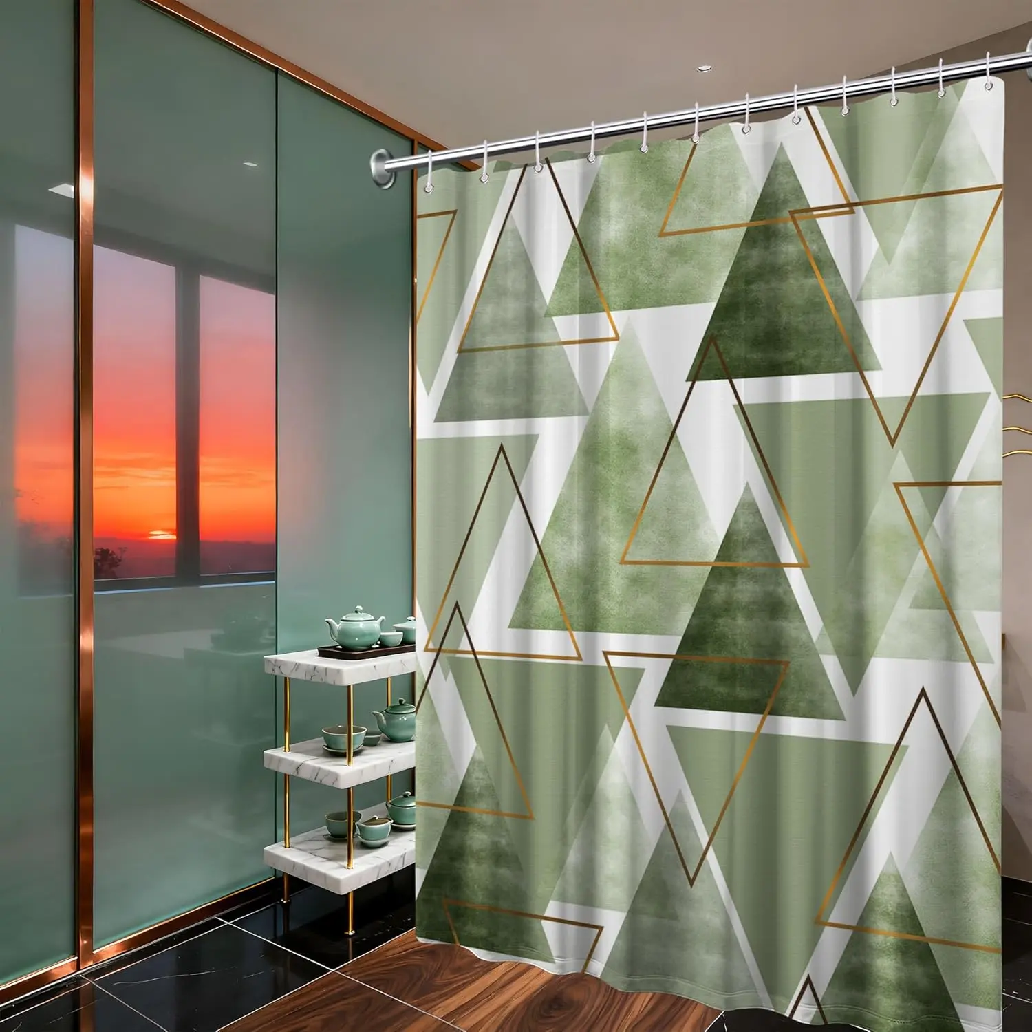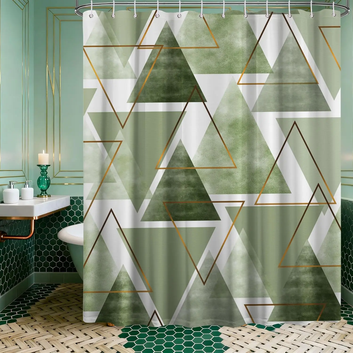 Sage Green and White Geometric Shower Curtain, Modern Olive Green Fabric Bathroom Decor, Includes Hooks for Shower, 1PC
