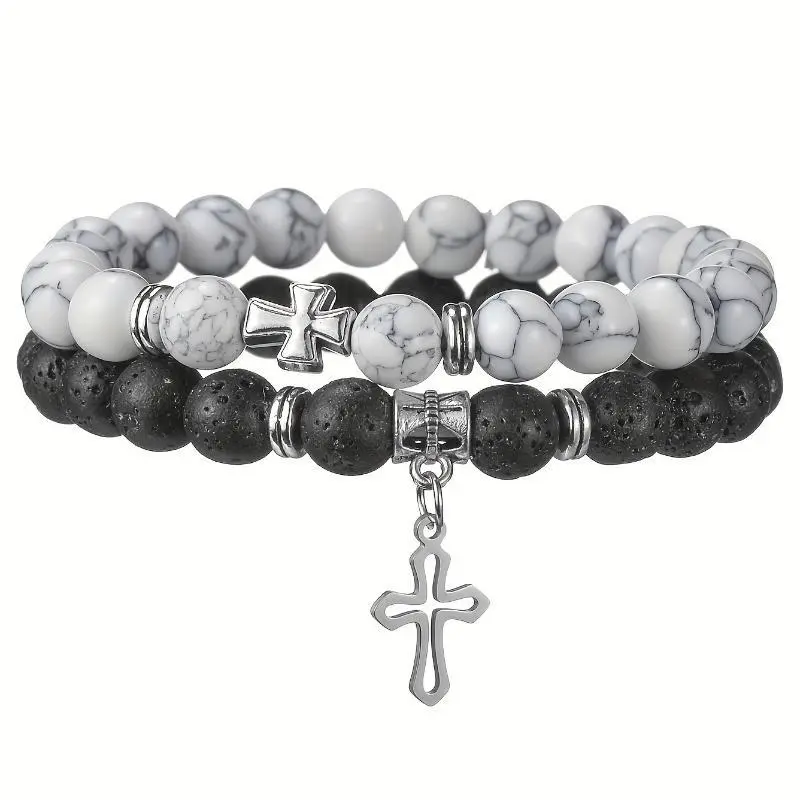 Men's Natural Stone Cross Beaded Bracelet Set (2-Piece) — Vintage White Turquoise & Volcanic Stone Stretch Bracelets | Stylish Religious-Themed Jewelry | An Excellent Gift Choice for Friends and Family.
