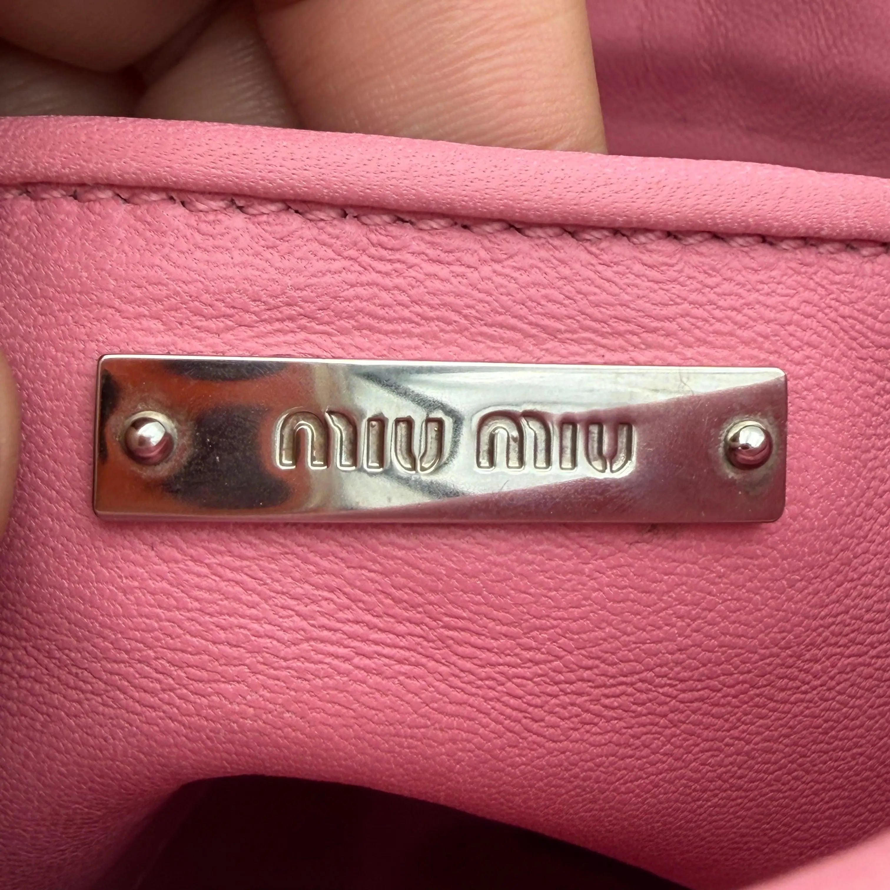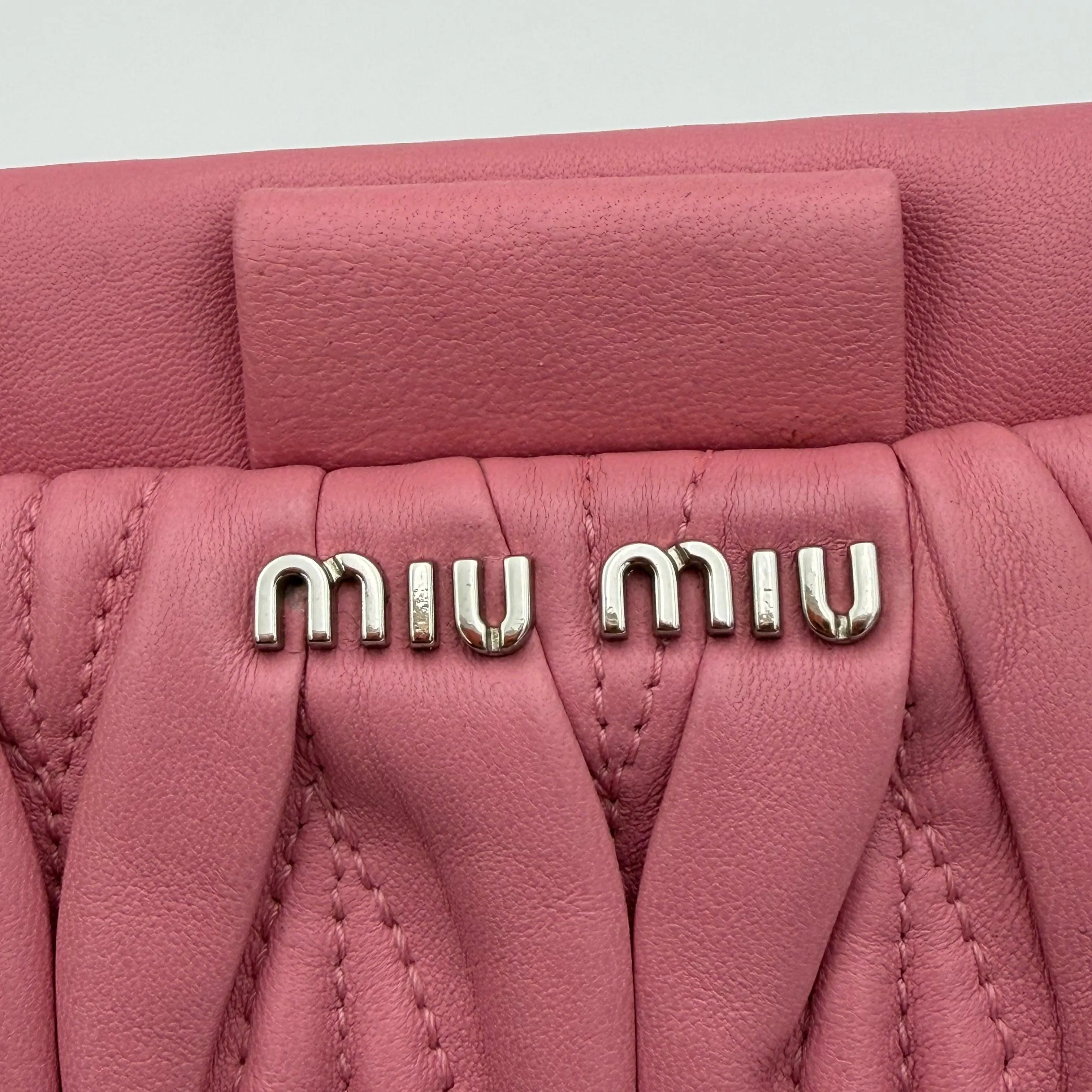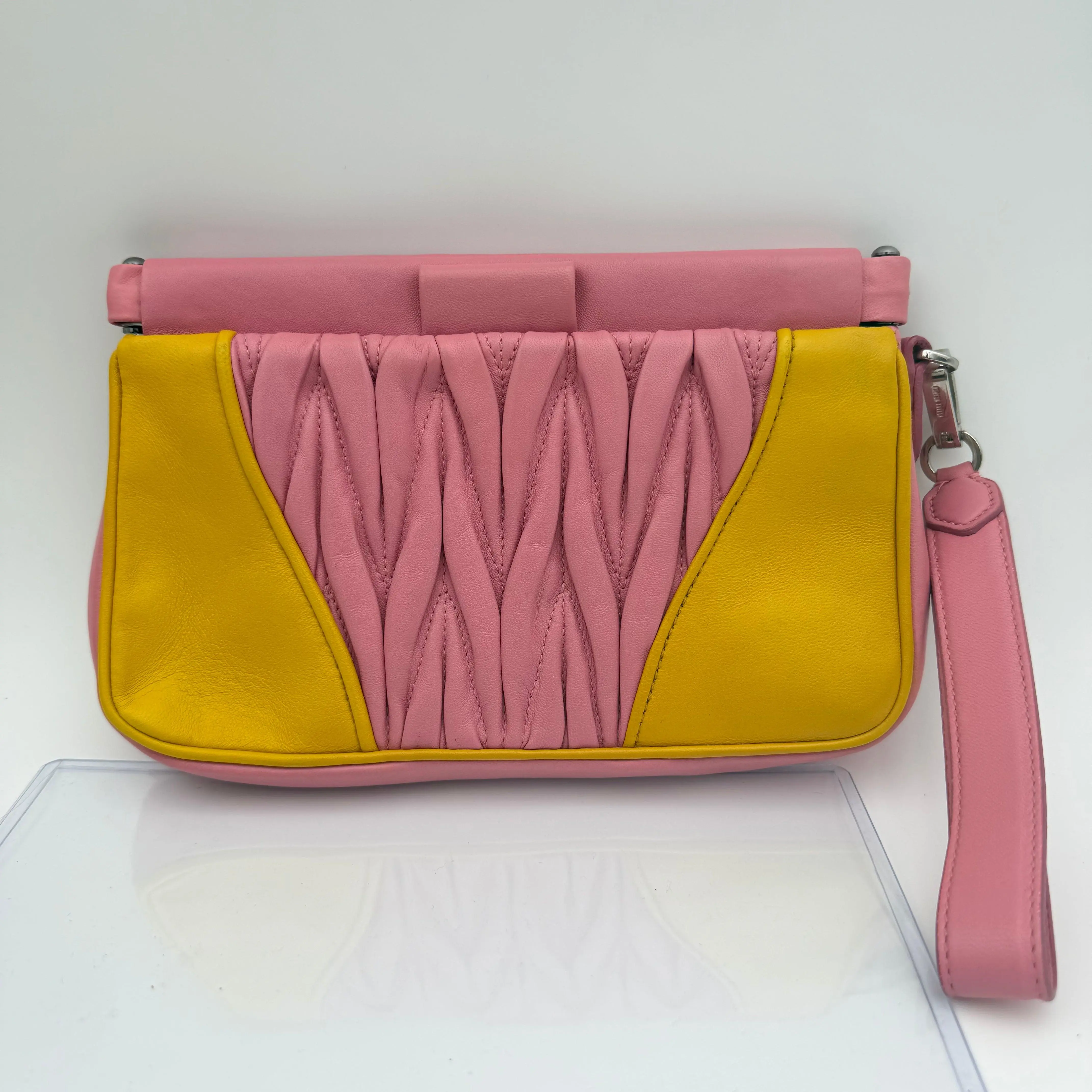 ✨ Elevate your style with the Matelassé clutch bag in Pink! This chic accessory features a vibrant yellow and pink color scheme, perfect for adding a pop of color to any outfit. The clutch is designed with a matelassé texture, offering a sophisticated look. It includes a wrist strap for easy carrying. The "Miu Miu" logo is prominently displayed, ensuring brand recognition.
