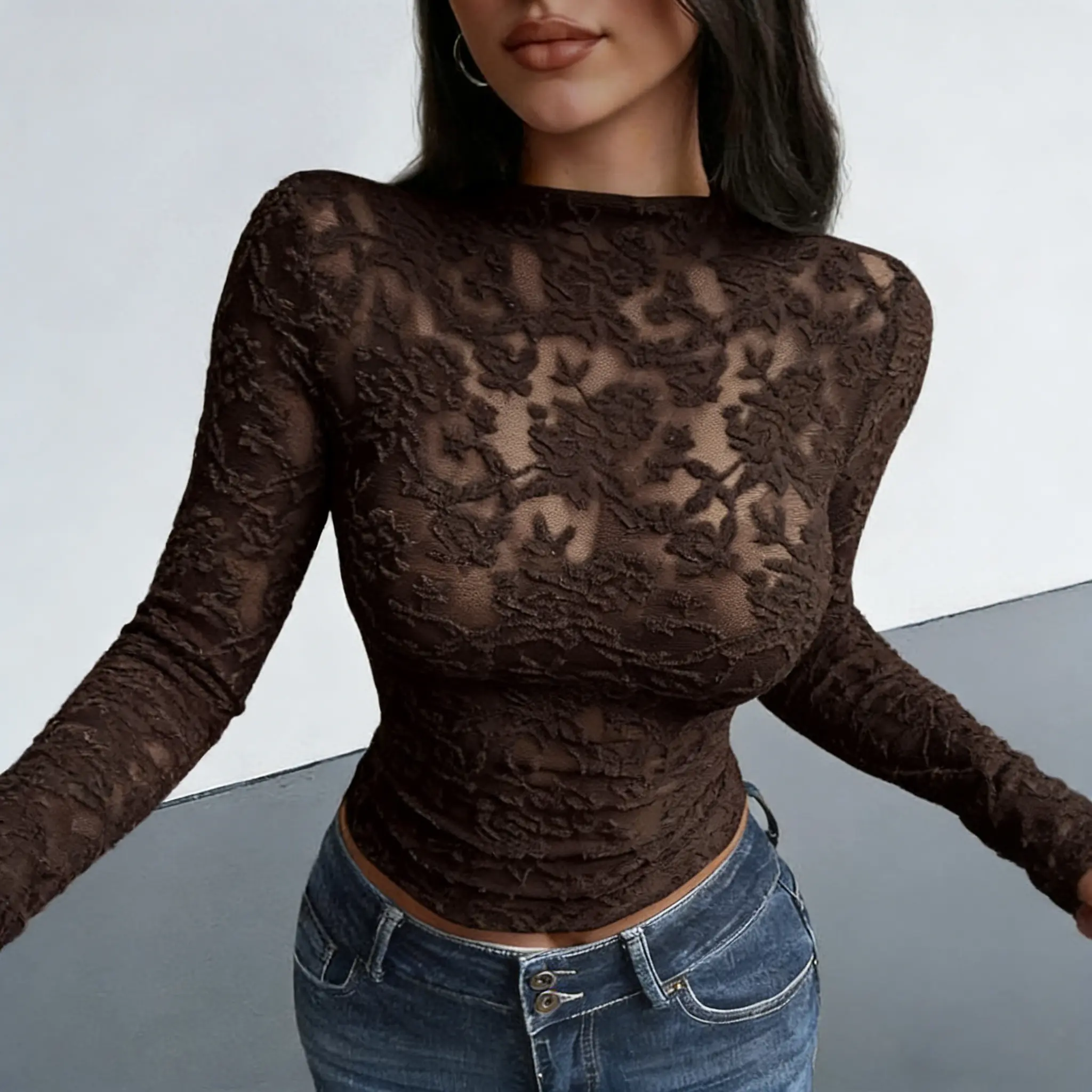 Mesh Long Sleeve Tops for Women Lace Sexy Sheer See Through Crew Neck Floral Shirt Fall Blouses 2026 Party Club Outfits