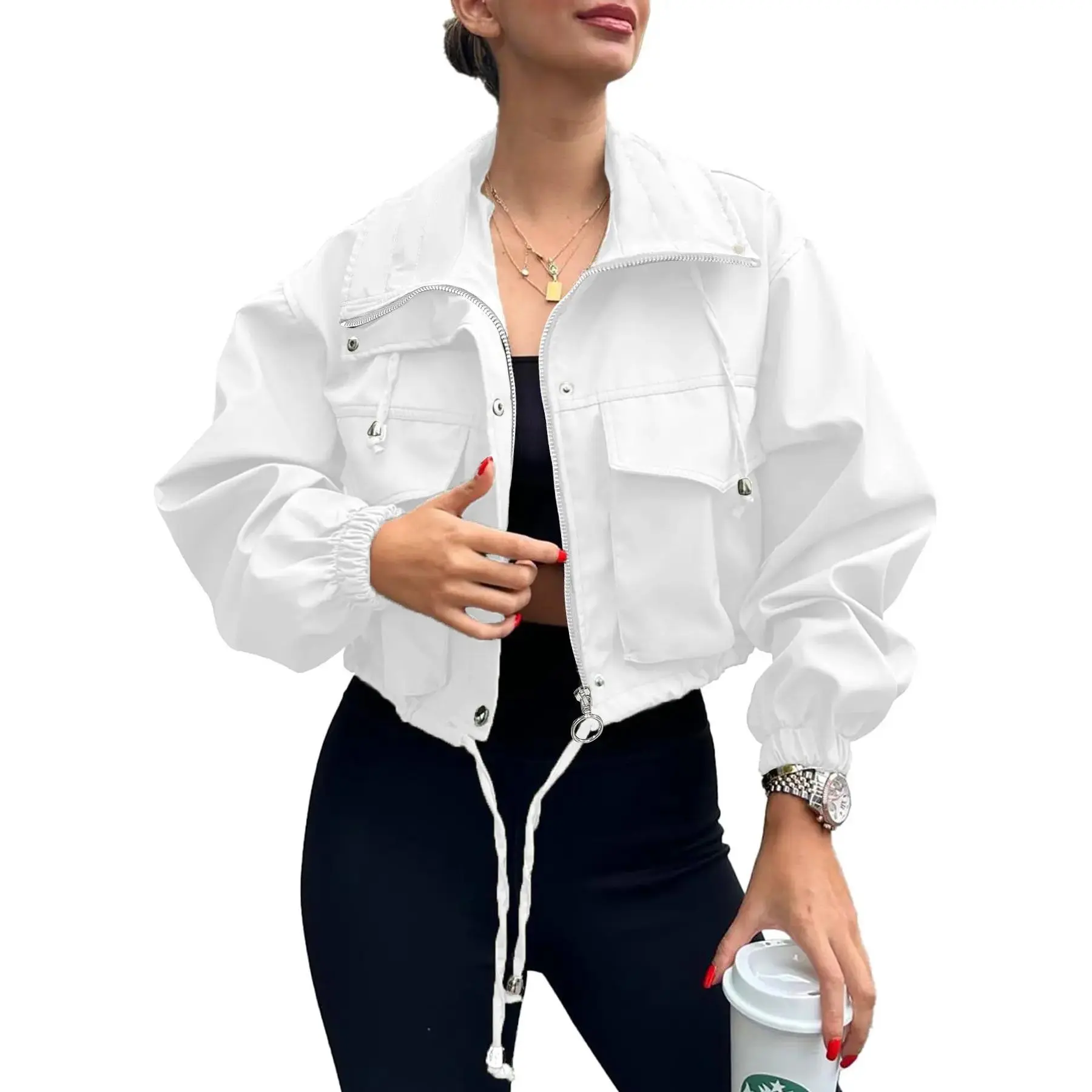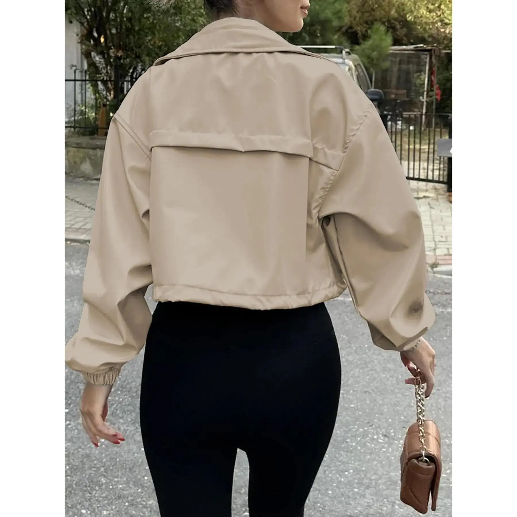 Women's Solid Zip Up Crop Jacket, Fashionable Lightweight Outerwear with Pocket, Ladies' Spring & Fall Clothes