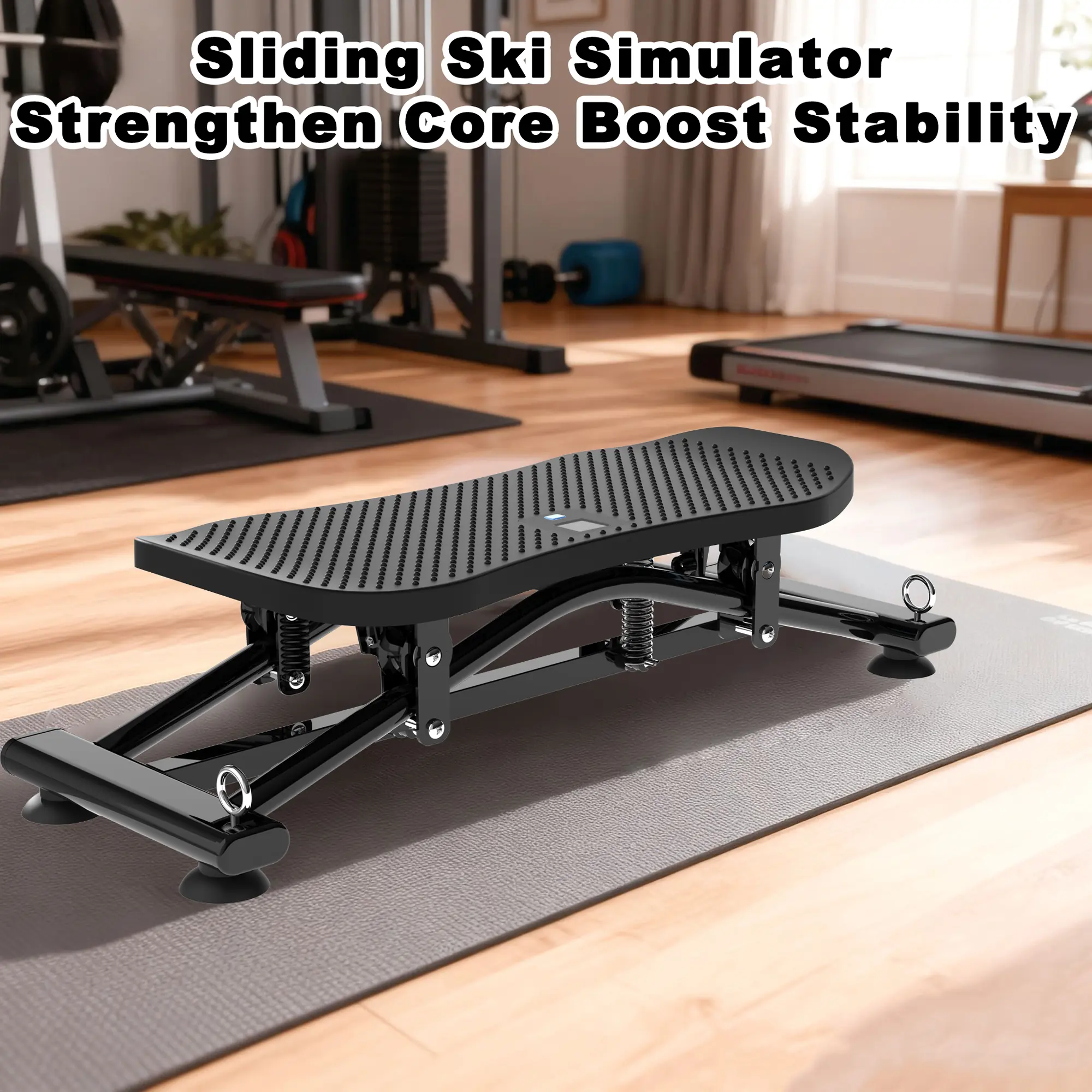 "This sliding ski simulator is a practical indoor fitness equipment for home gym use. The package includes 1 sliding ski simulator main unit and 2 detachable resistance bands. It adopts a sturdy frame, heavy-duty non-slip rubber base, and smooth sliding platform, with a maximum weight capacity of 300 lbs. It fits most fitness levels, from beginners looking for daily cardio workouts to ski lovers wanting to practice basic movements and maintain fitness during off-seasons. Its compact size makes it suitable for small home spaces, easy to move and store when not in use.