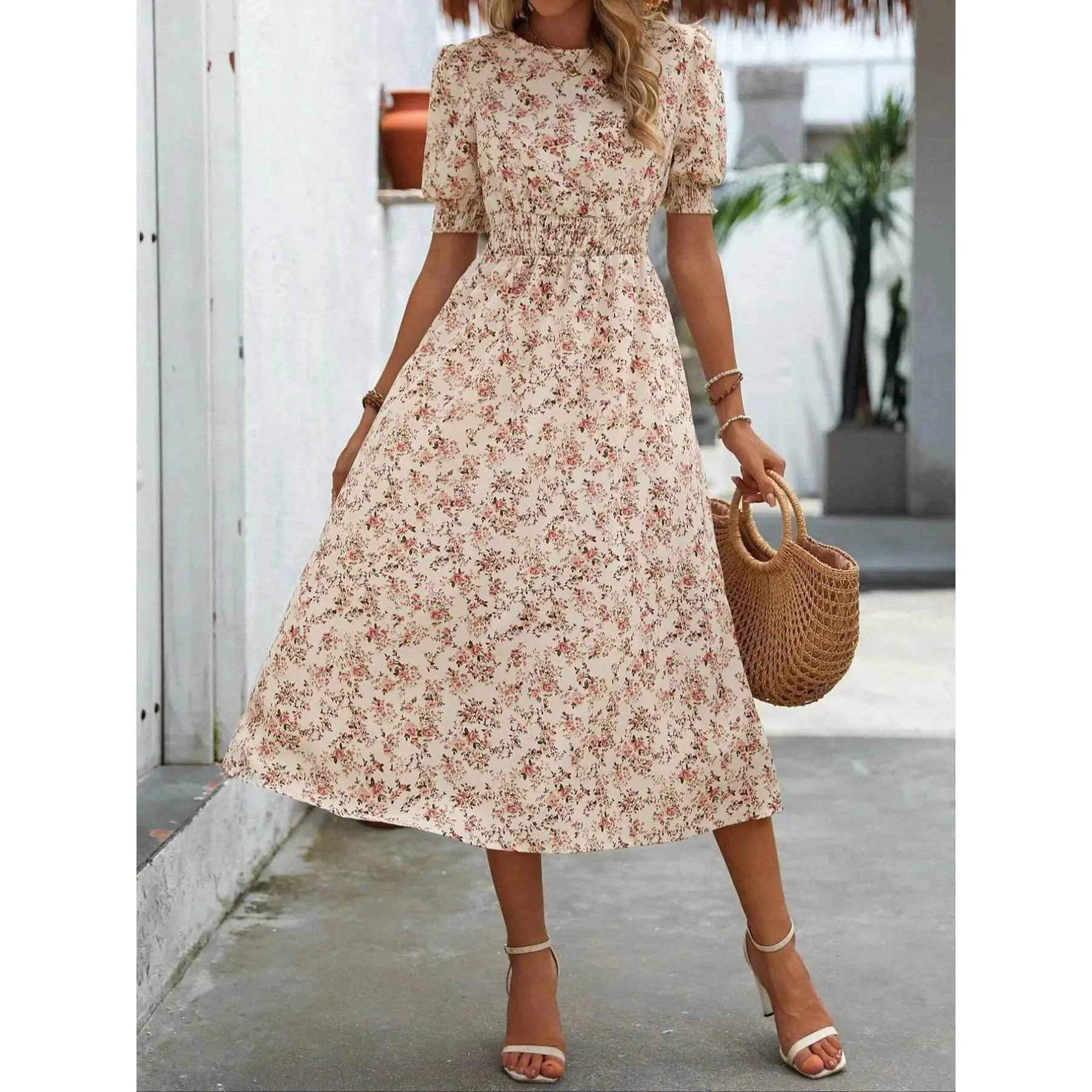 Women's Floral Print Bubble Hem Dress, Round Neck Waist Cinched Design, Boho Style Midi Skirt, Fitted Short Sleeve, All Seasons