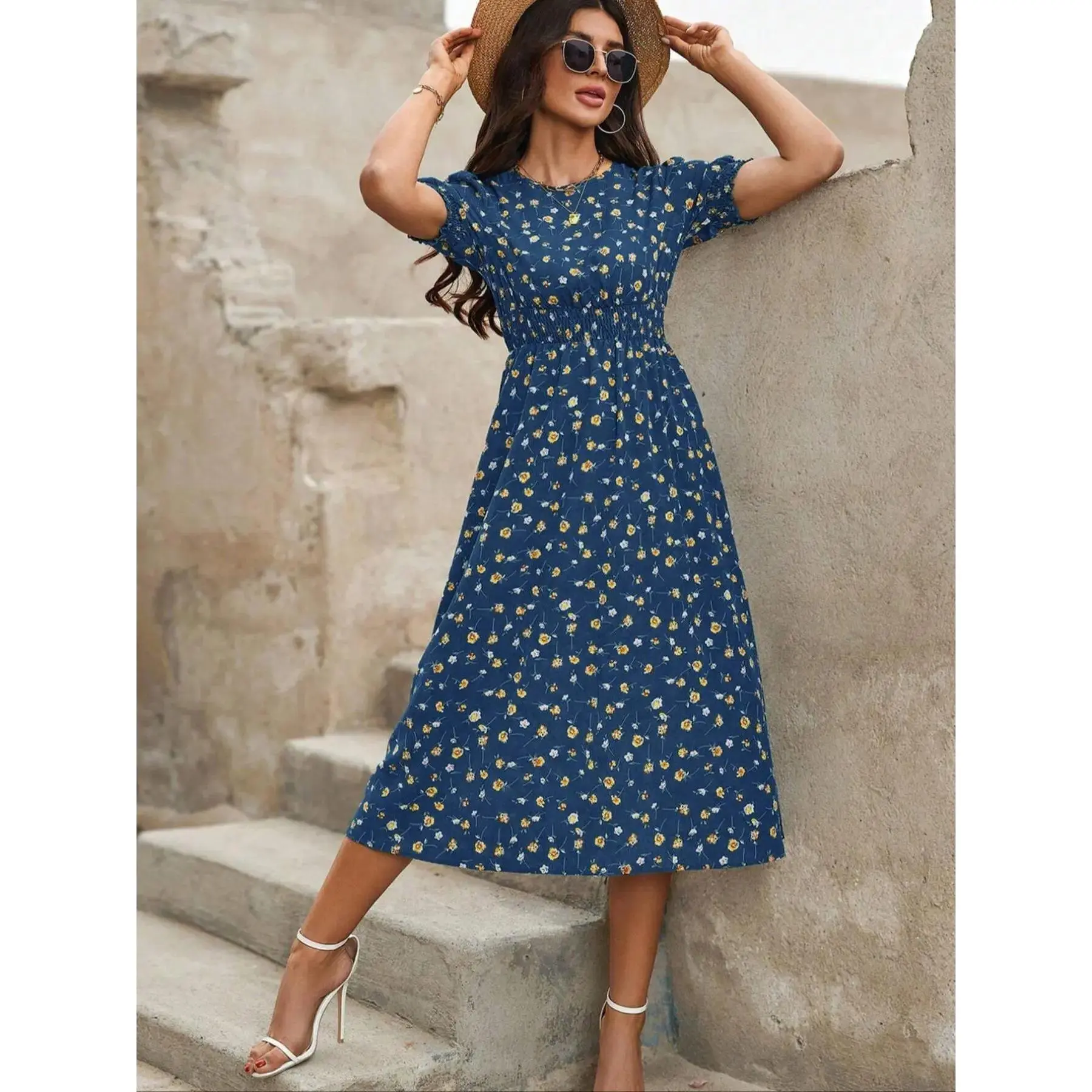 Dokotoo Womenswear Bohemian Summer Dresses 2026 Boho Floral Ruffle Sleeve Smocked Elastic Waist Drawstring Tie Casual Mini Dress Sundress