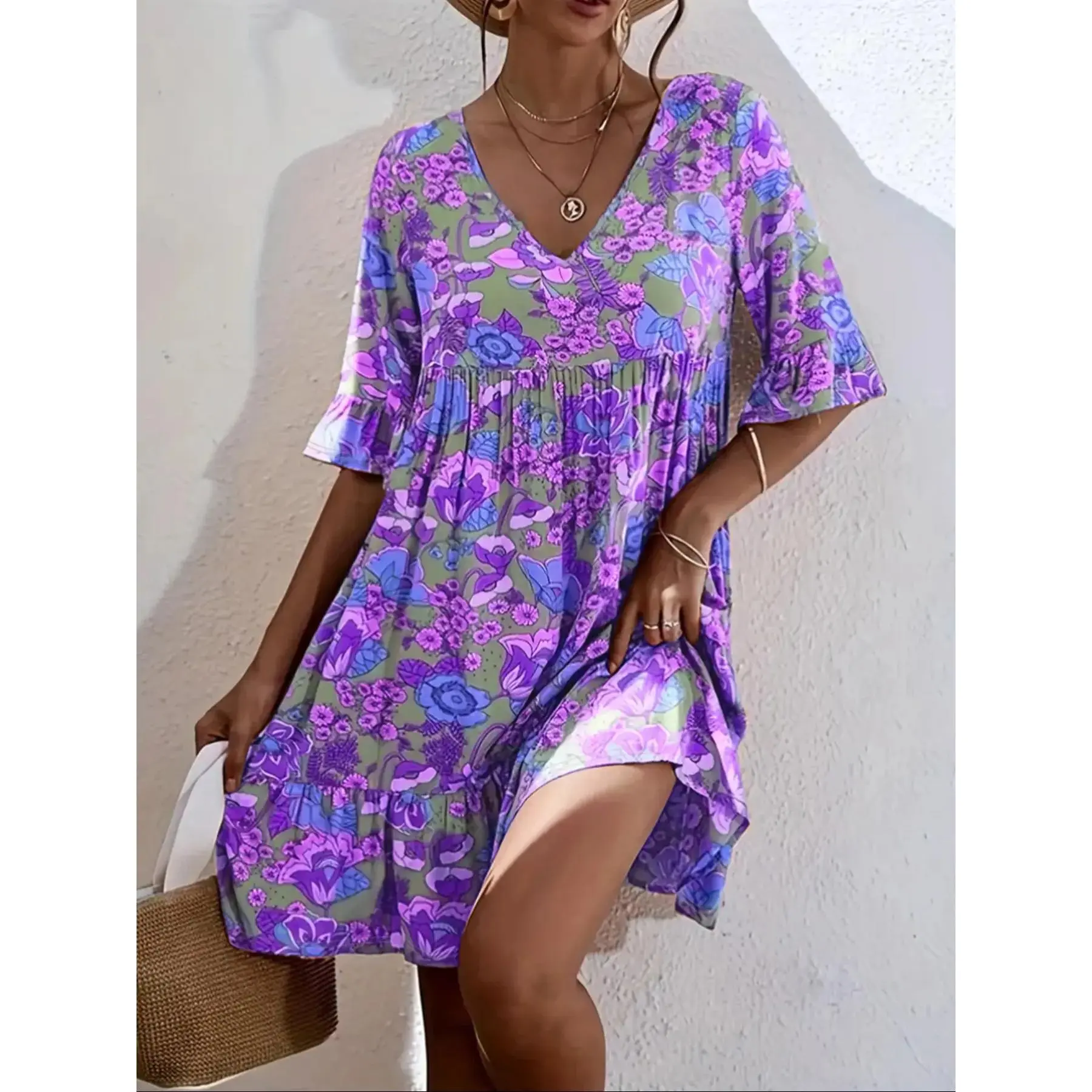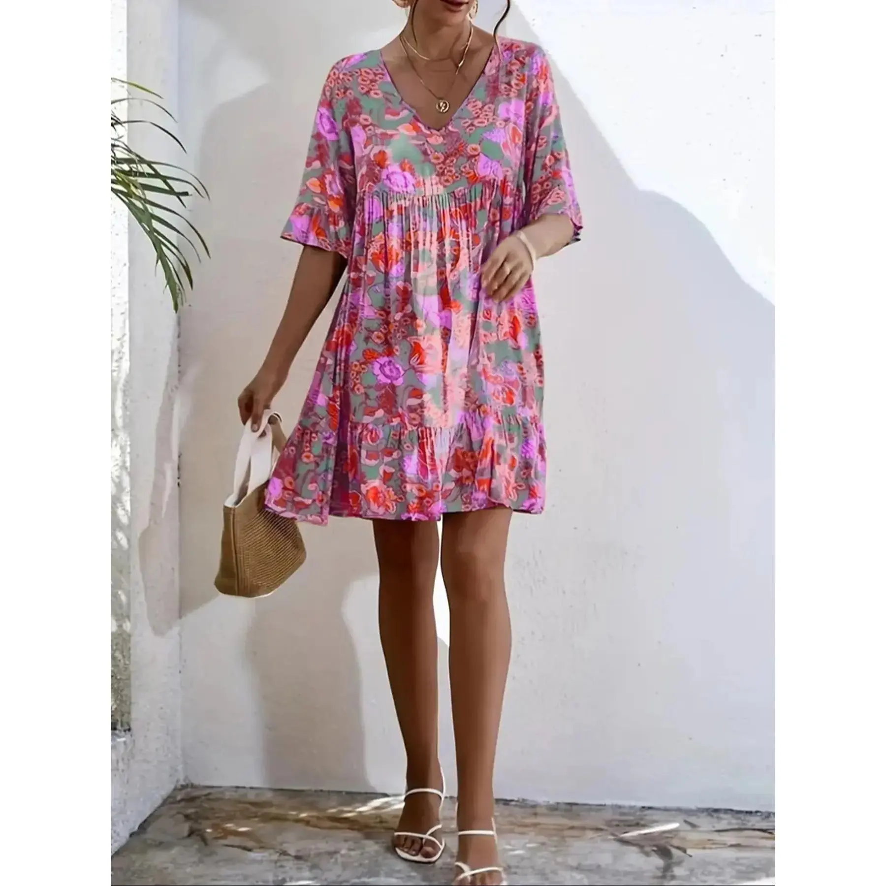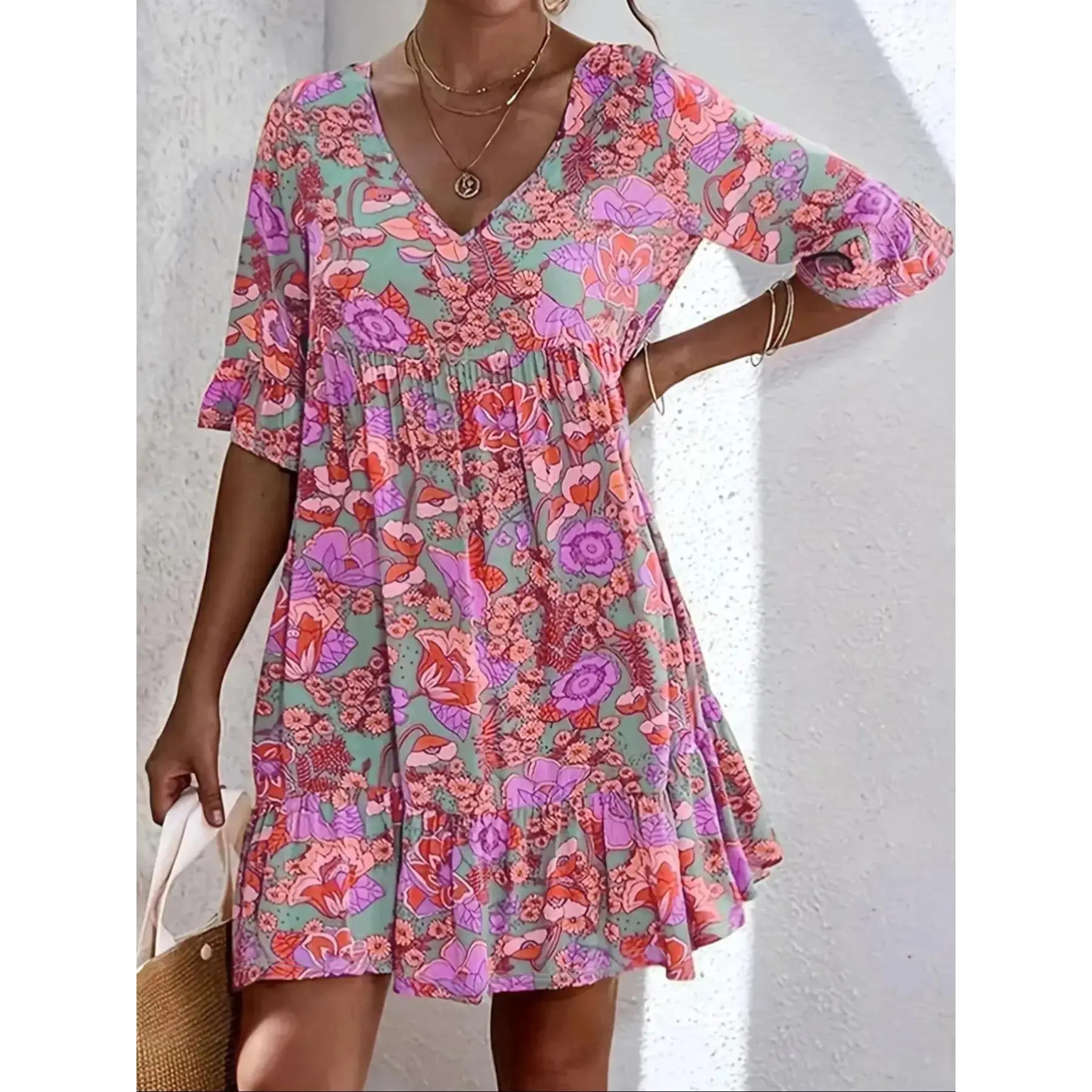 Summer New Plus Size Women's Dress, Vacation Style Casual Versatile Floral Print Bohemian V-Neck Short Sleeve Knee Length