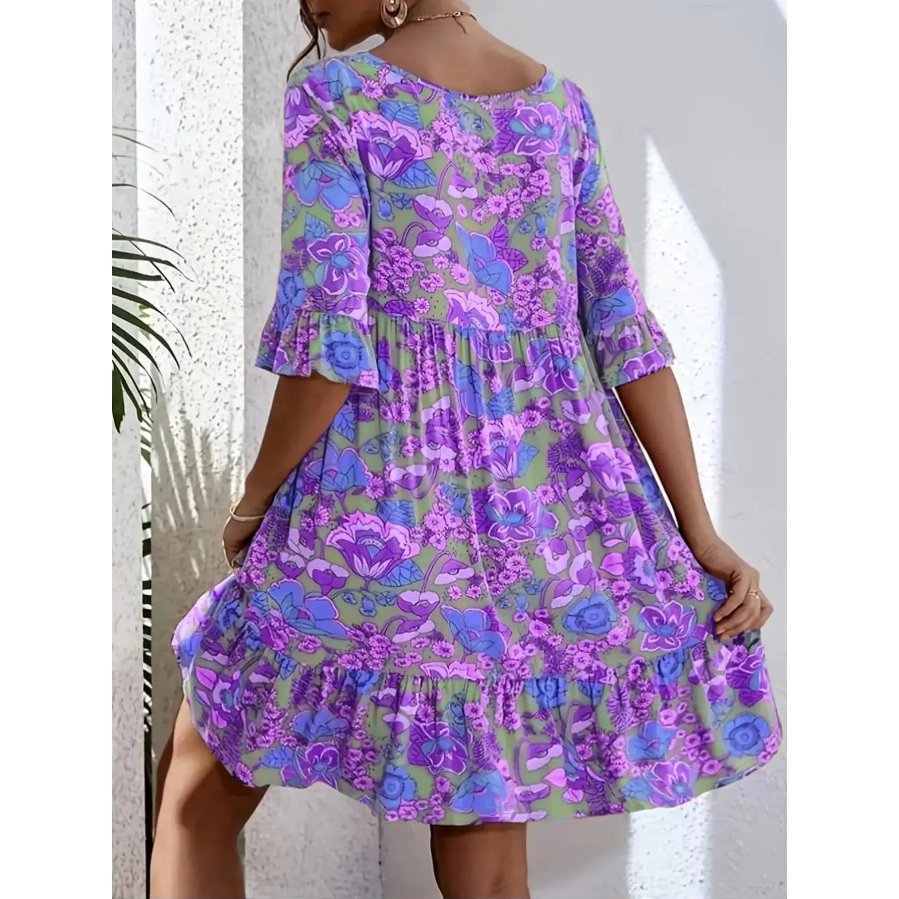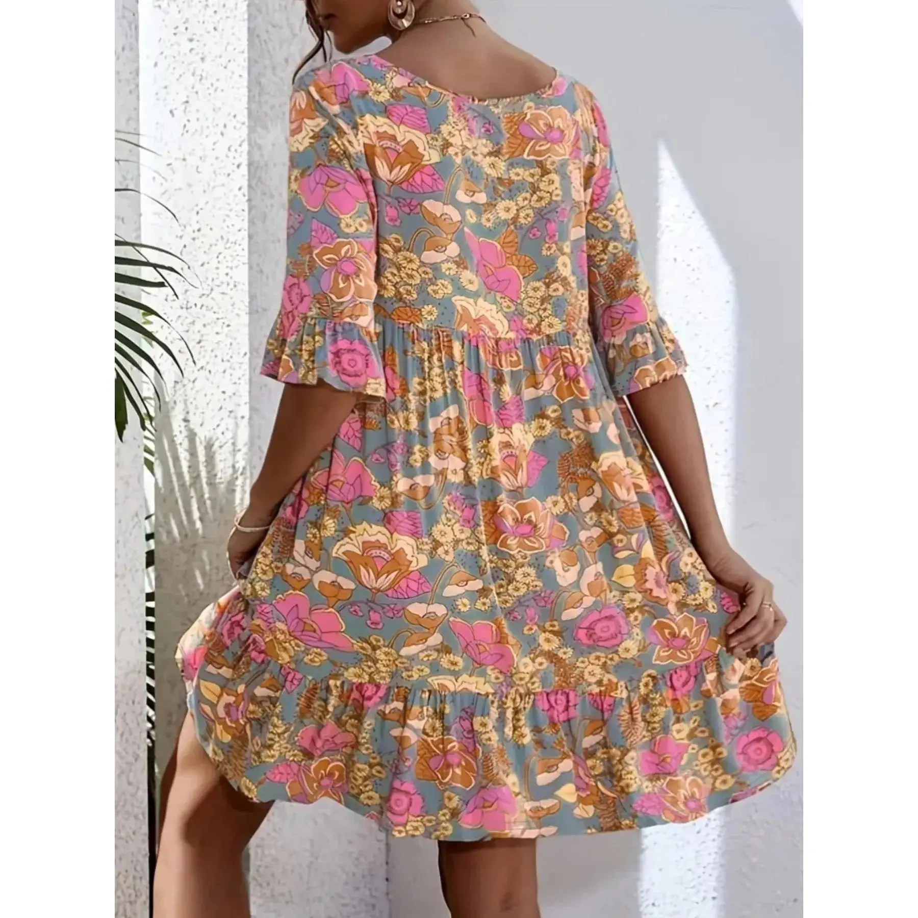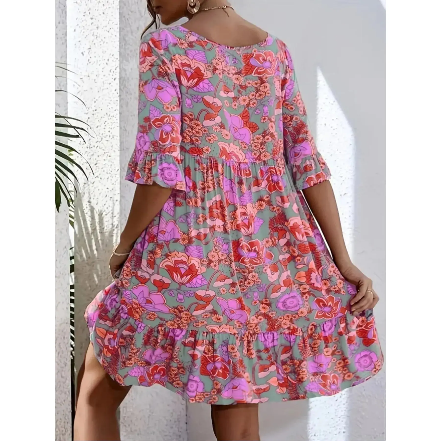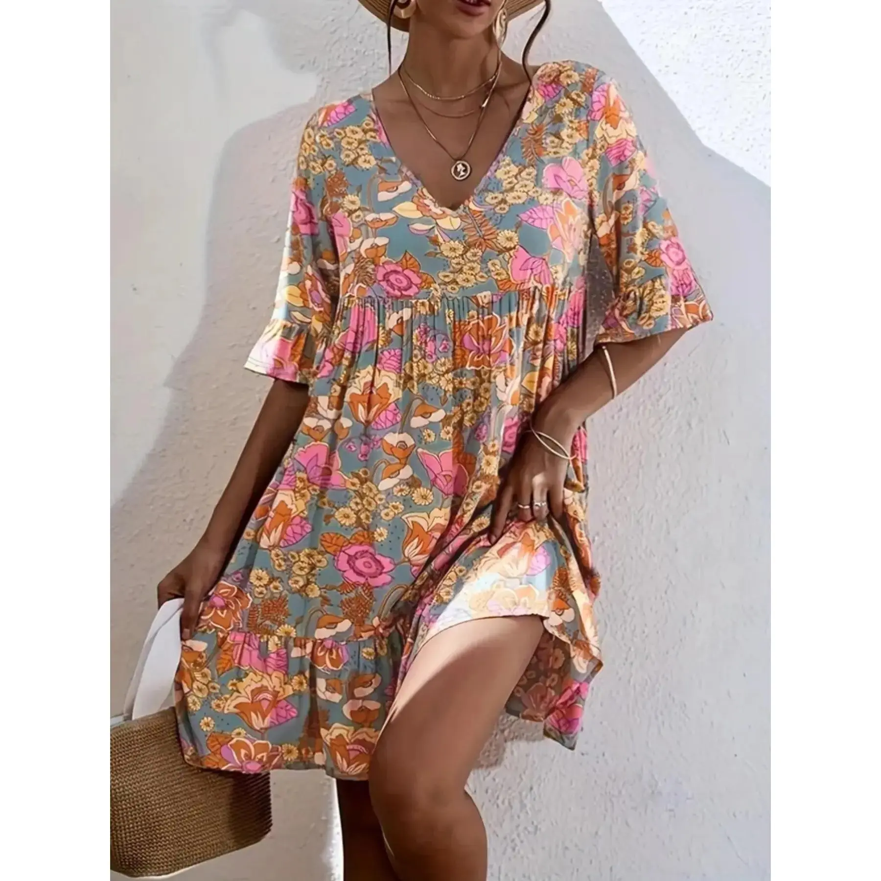 Summer New Plus Size Women's Dress, Vacation Style Casual Versatile Floral Print Bohemian V-Neck Short Sleeve Knee Length