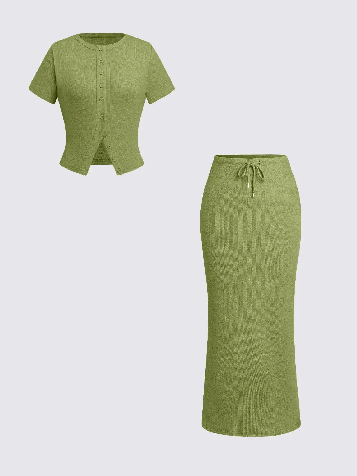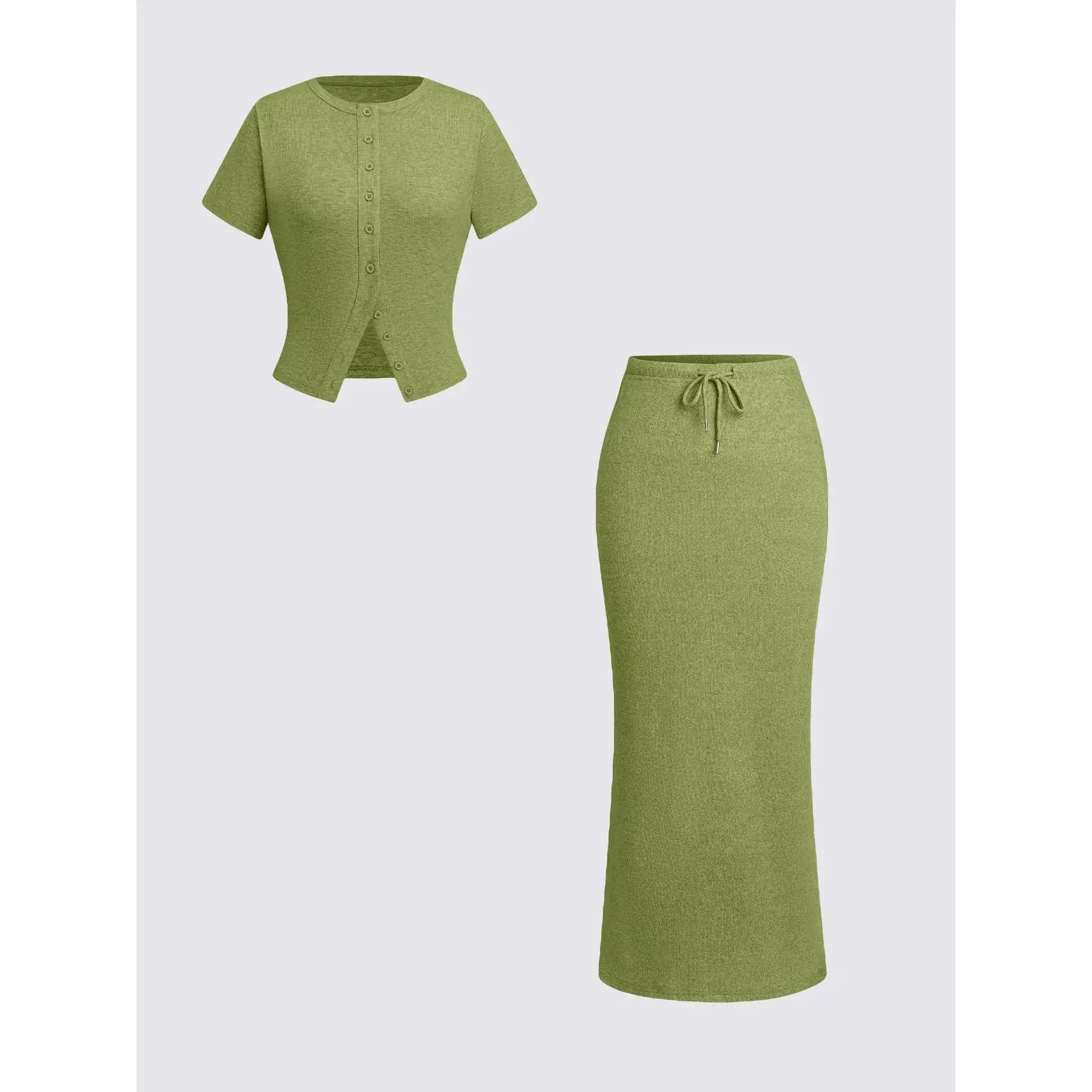 Women's Solid Basic Button Front Tee & Drawstring Split Hem Skirt Two-piece Set, Casual Short Sleeve Round Neck Top & Skirt for Daily Wear, Ladies Two-piece Outfits for All Seasons, Matching Clothing Set Women
