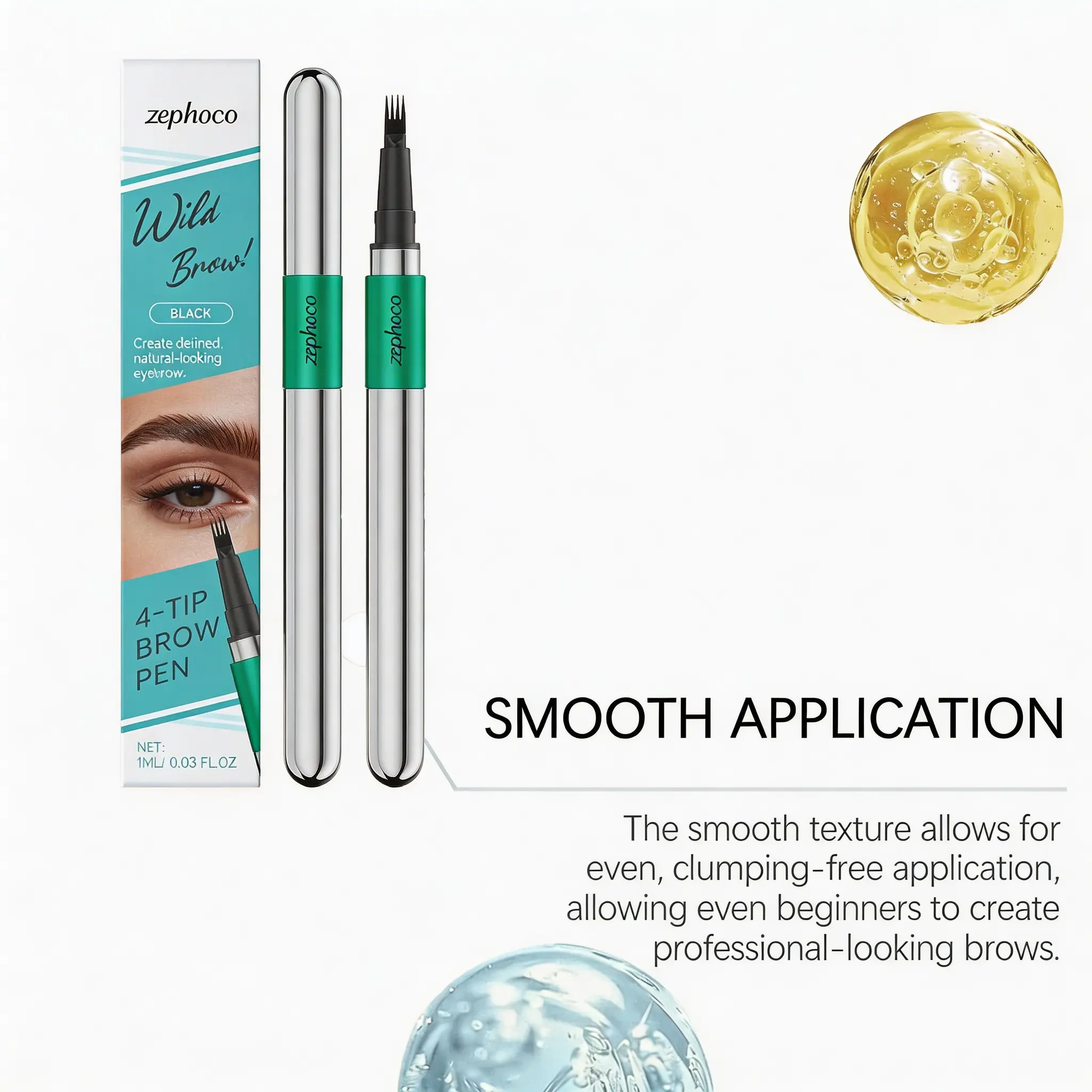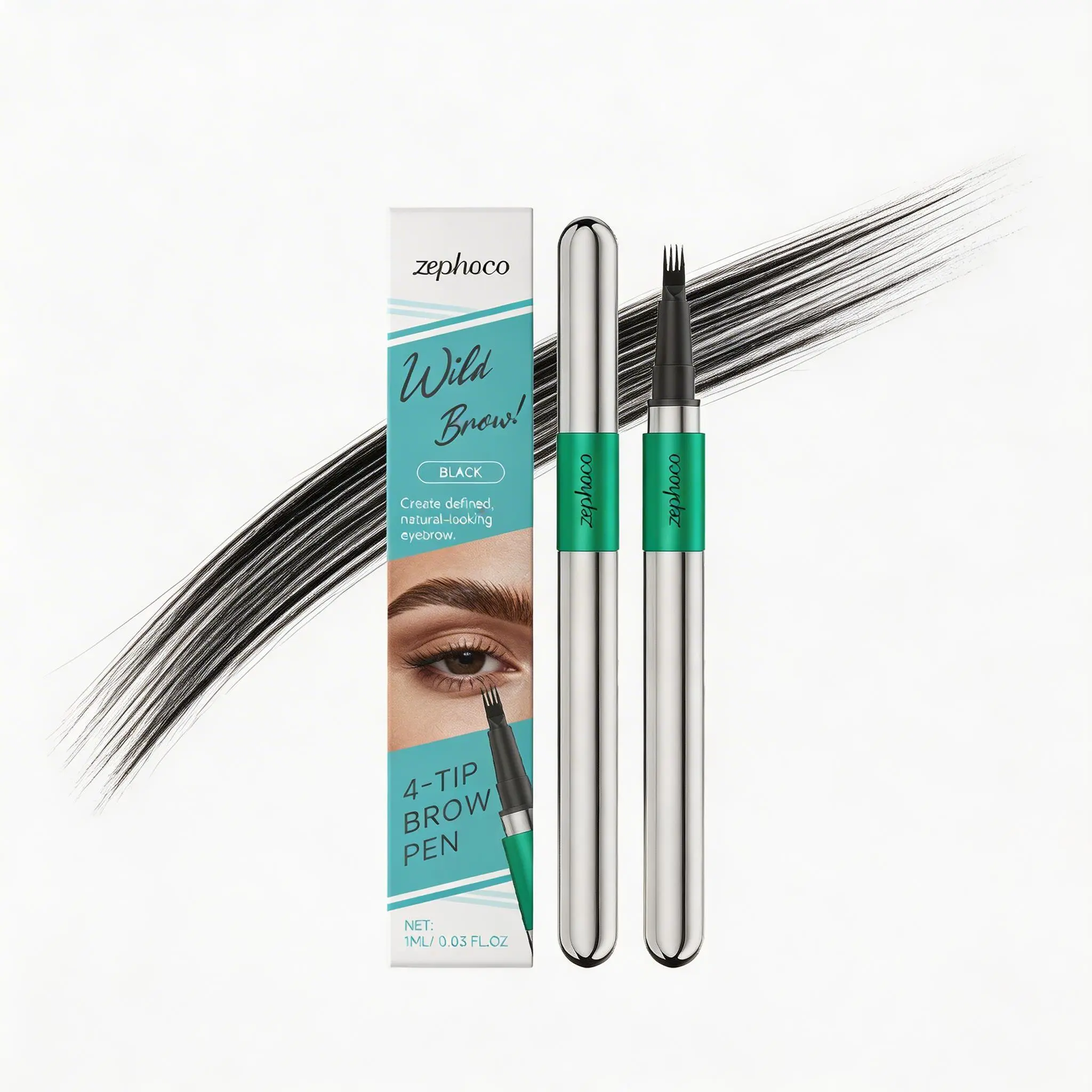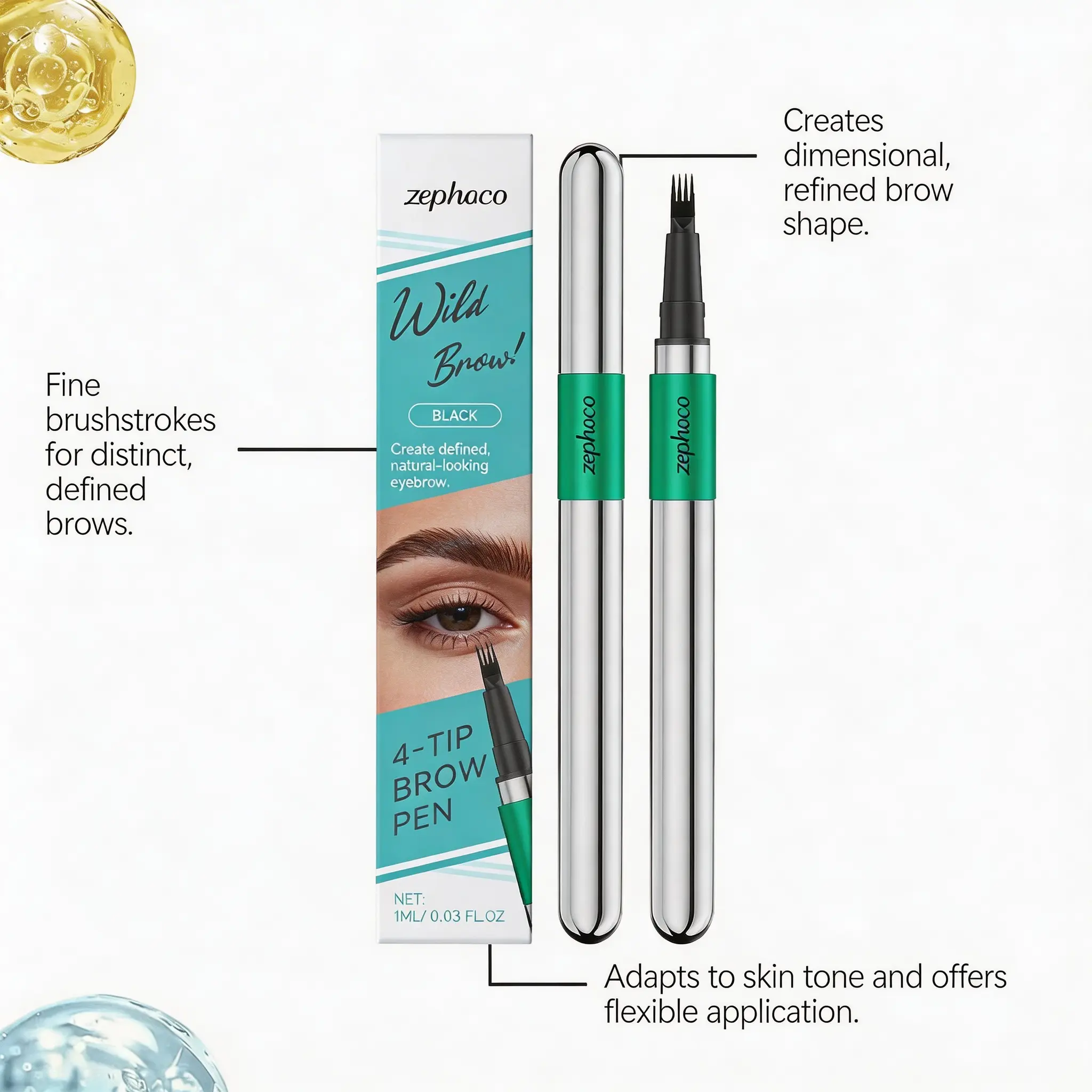 ZEPHOCO 4-Tip Brow Pen Black, VP/DMAPA Acrylates Copolymer Waterproof Film, Ultra-Fine Tip Precise Sculpting, Smooth Clump-Free, Twist-Up Design, Smudge-Resistant All-Day Wear for All Brows