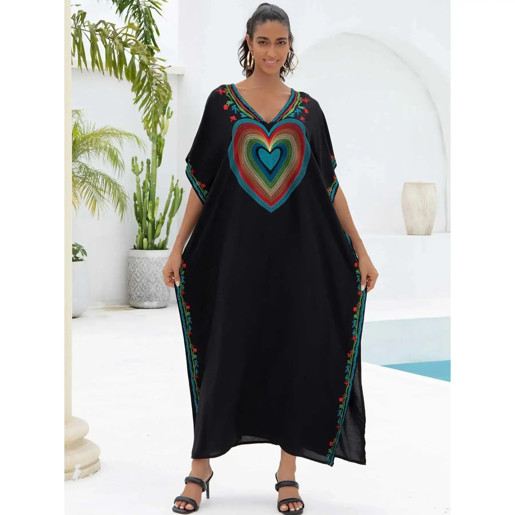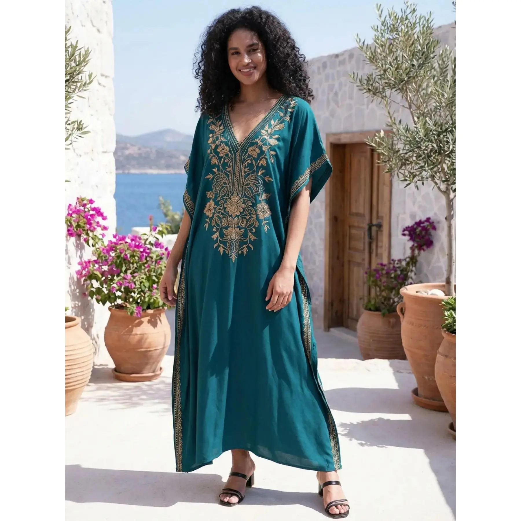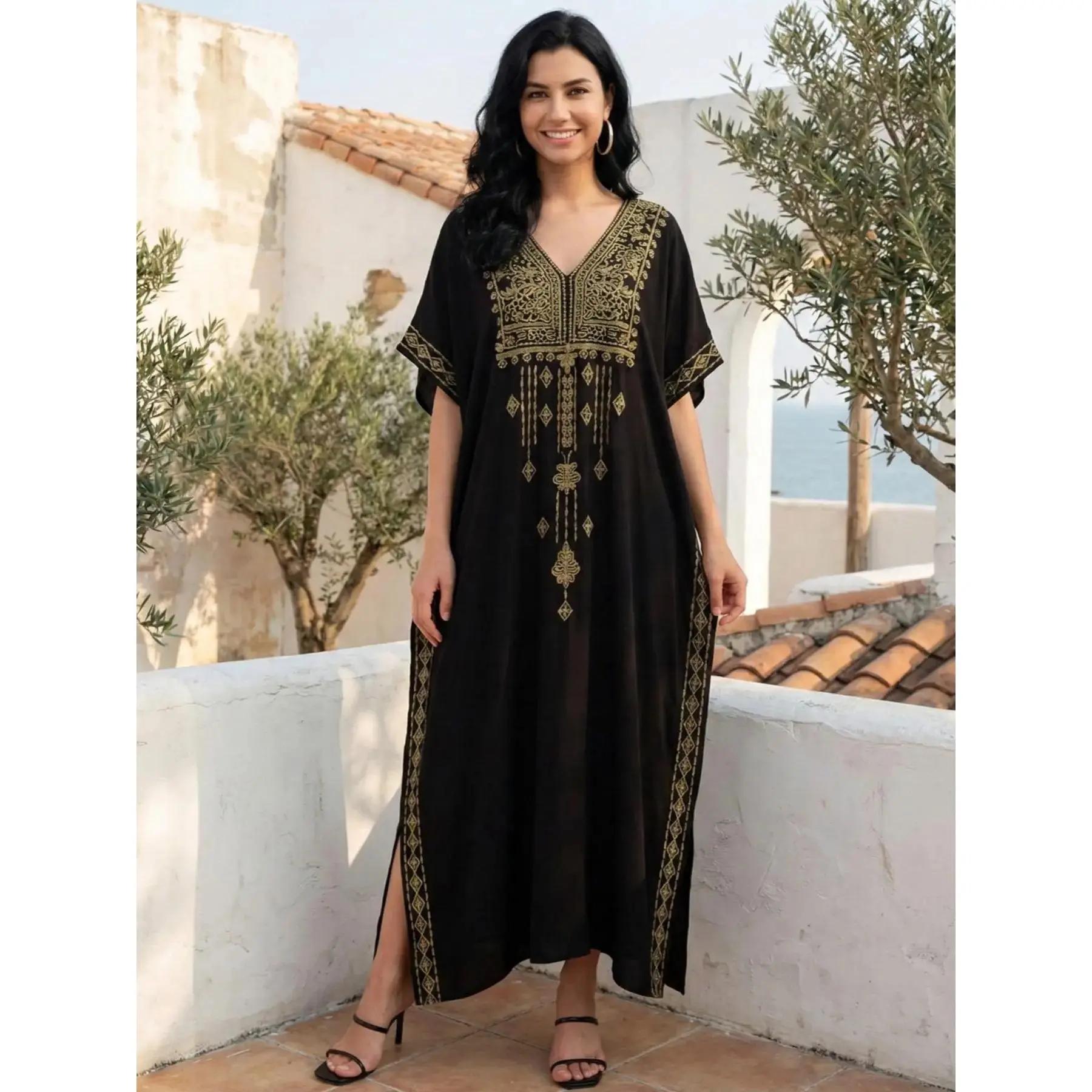 Arabic Clothing-Ethnic Pattern Embroidery Batwing Sleeve Split Hem Kaftan Dress, Modest V Neck Half Sleeve Long Dress for Summer, Women's Clothing for Vacation Holiday Beach Wear