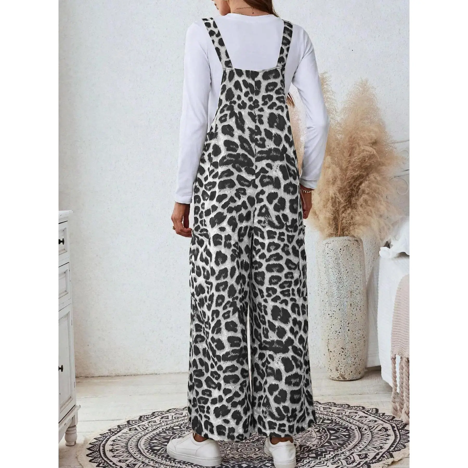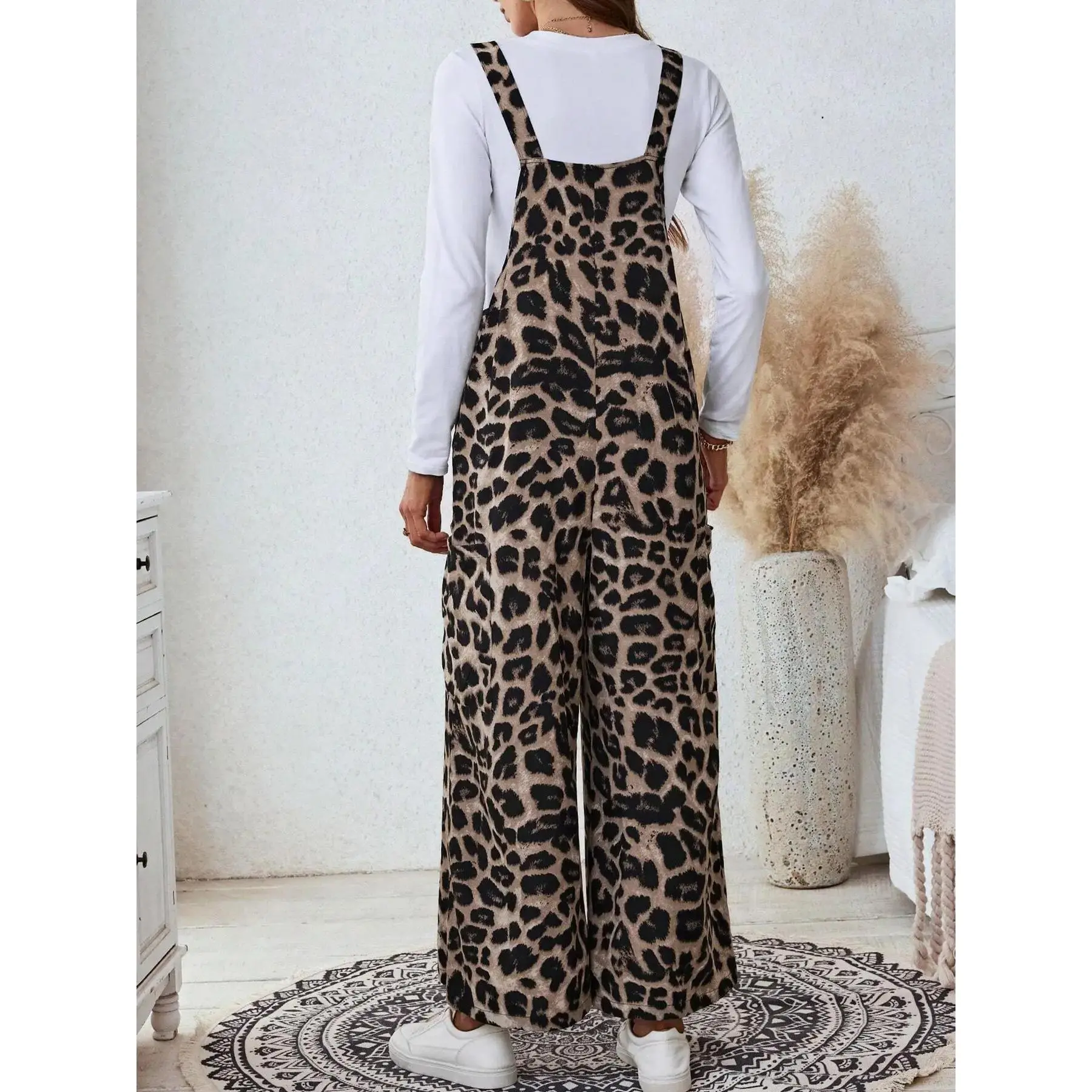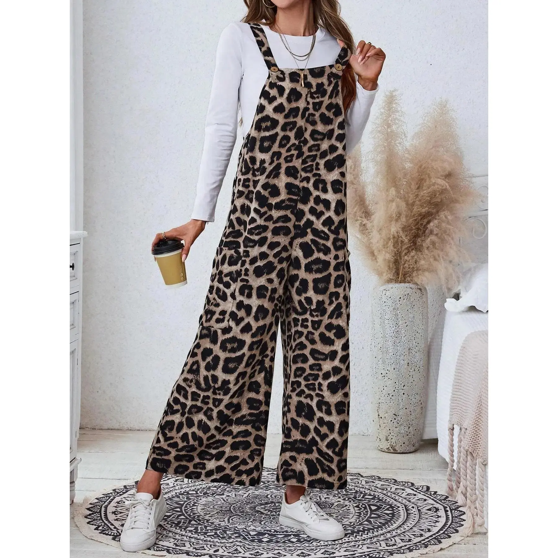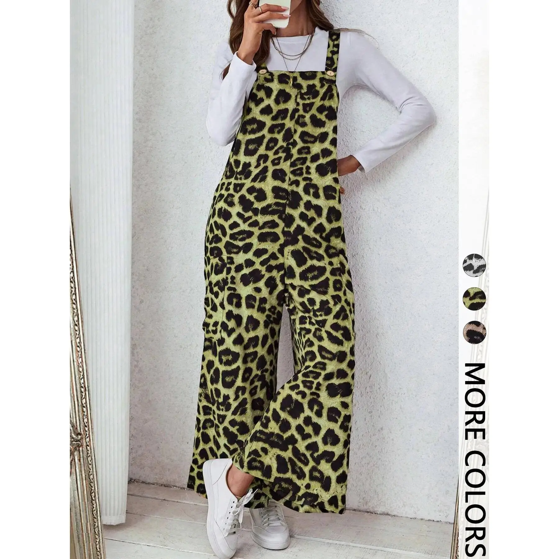 Women's Casual Leopard Print Loose Jumpsuit, Woven Fabric, Moderate Thickness, All Seasons Wear, Fitted Style, Pocket Design, Casual Fashion Jumpsuit