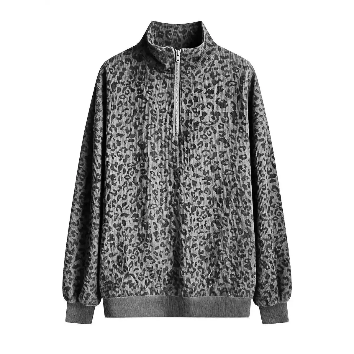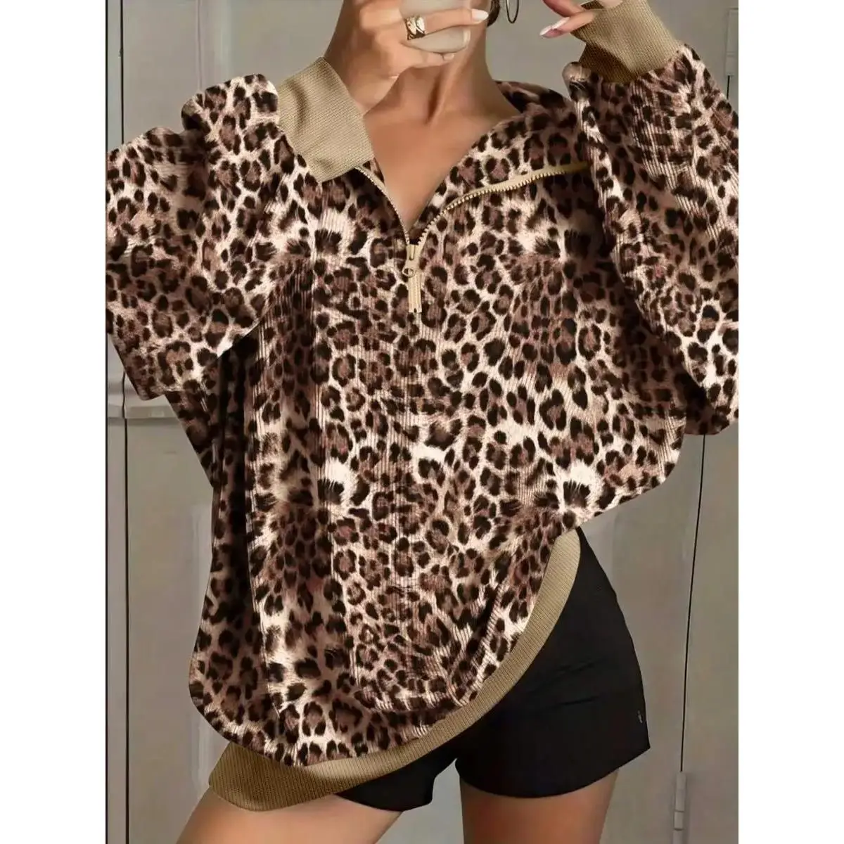 Plus Size Women's Leopard Print Long Sleeve Casual Sweatshirt with a Half-Zip V-Neck and Bishop Sleeves, Perfect for Y2K Grunge or Laid-Back Vibes, Soft Knit Fabric with Contrast Trim
