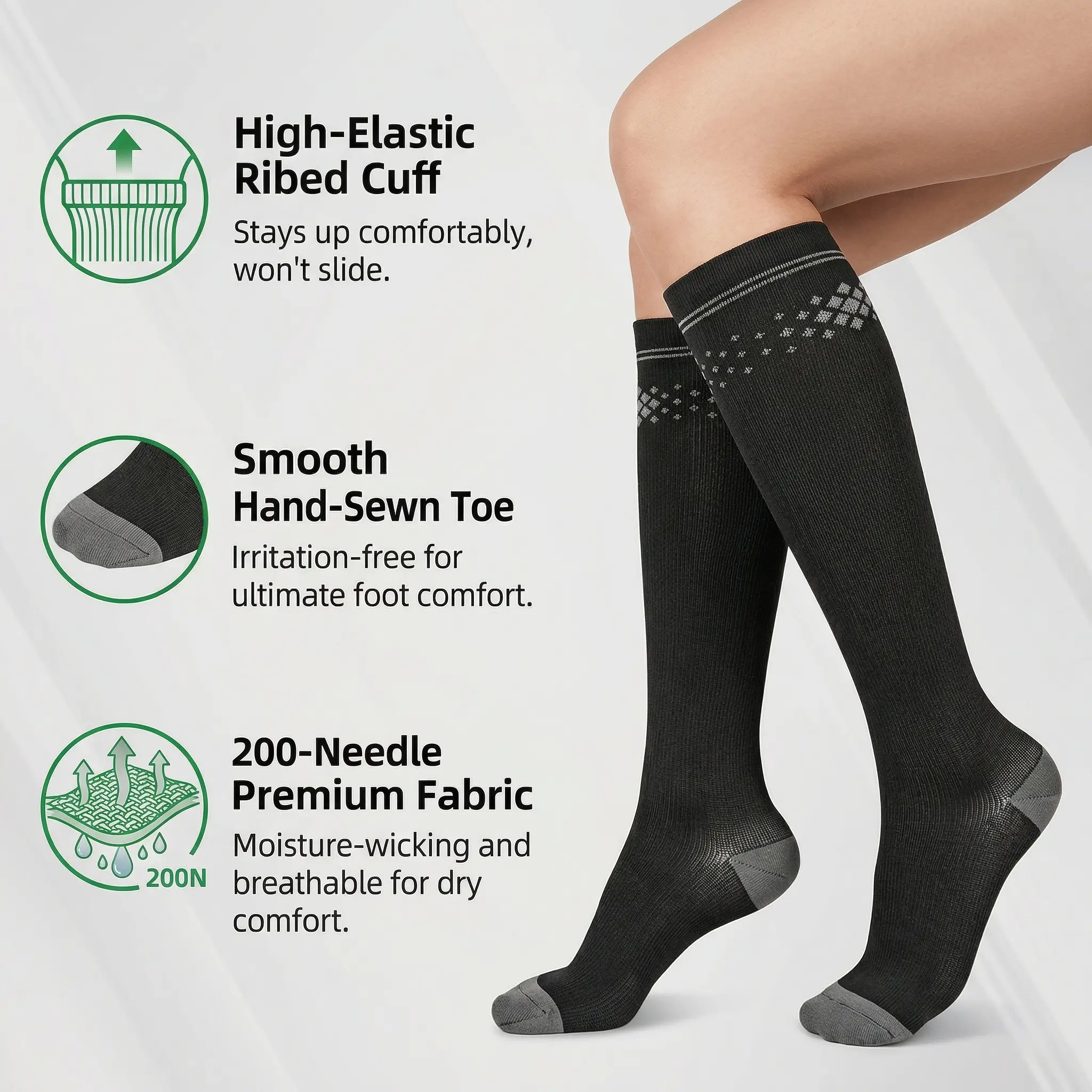 【High-quality】Our socks are crafted from high-density Siro-spun combed cotton using advanced 200-needle knitting technology. They offer a remarkably soft, skin-friendly touch with excellent moisture-wicking and quick-drying properties, keeping your legs cool, dry, and fresh even during intense workouts.
