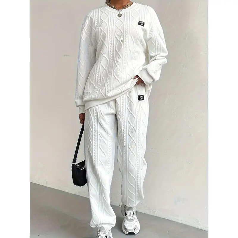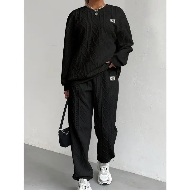 This 2025Women's Cozy Textured Pants Set includes a soft long sleeve crew neck sweatshirt and comfortable jogger sweatpants.Perfect for casual wear in daily life, this outfit is made of 100% polyester.The solid color design and micro elasticity ensure a comfortable fit.Ideal for fall/winter, this set is easy to care for with hand washing.