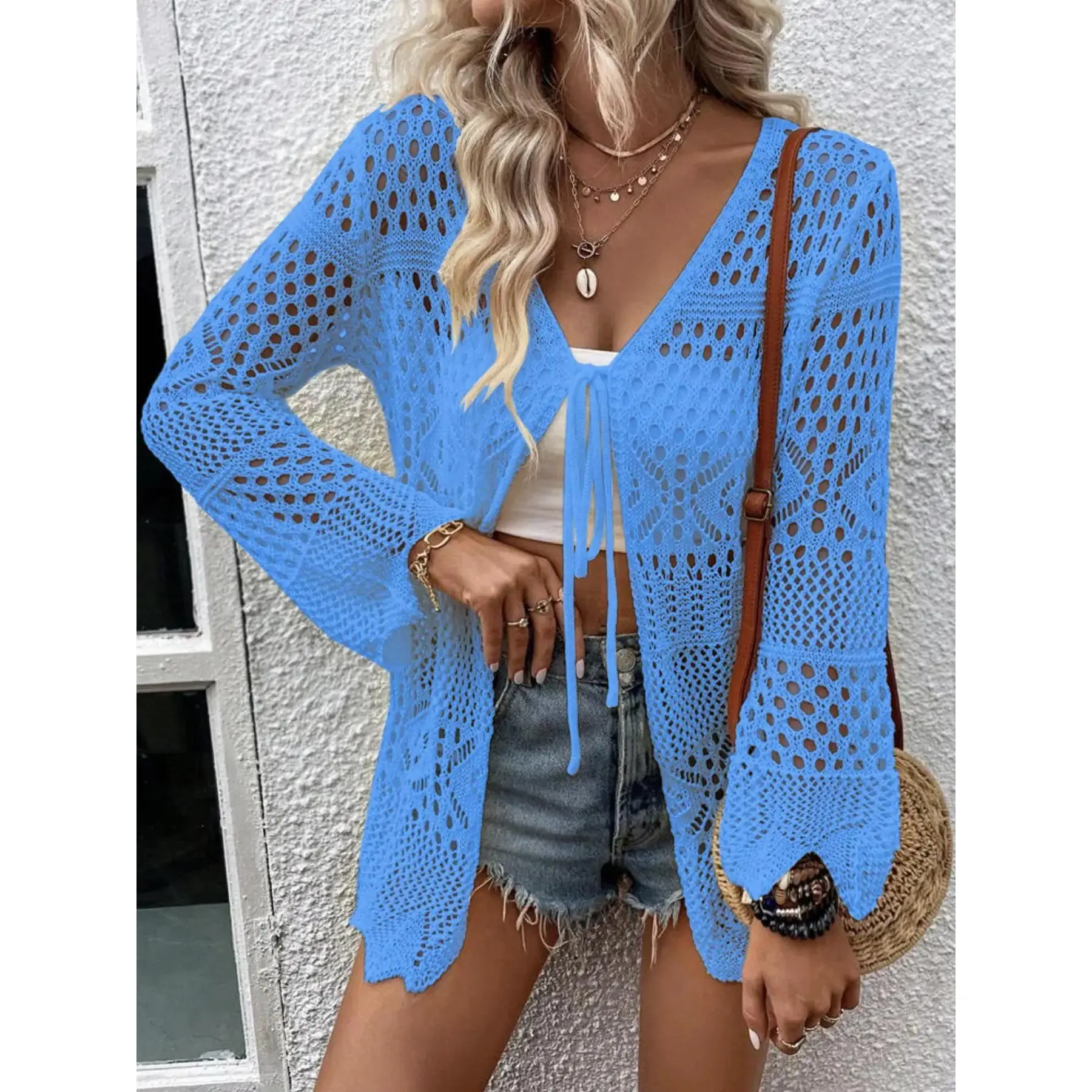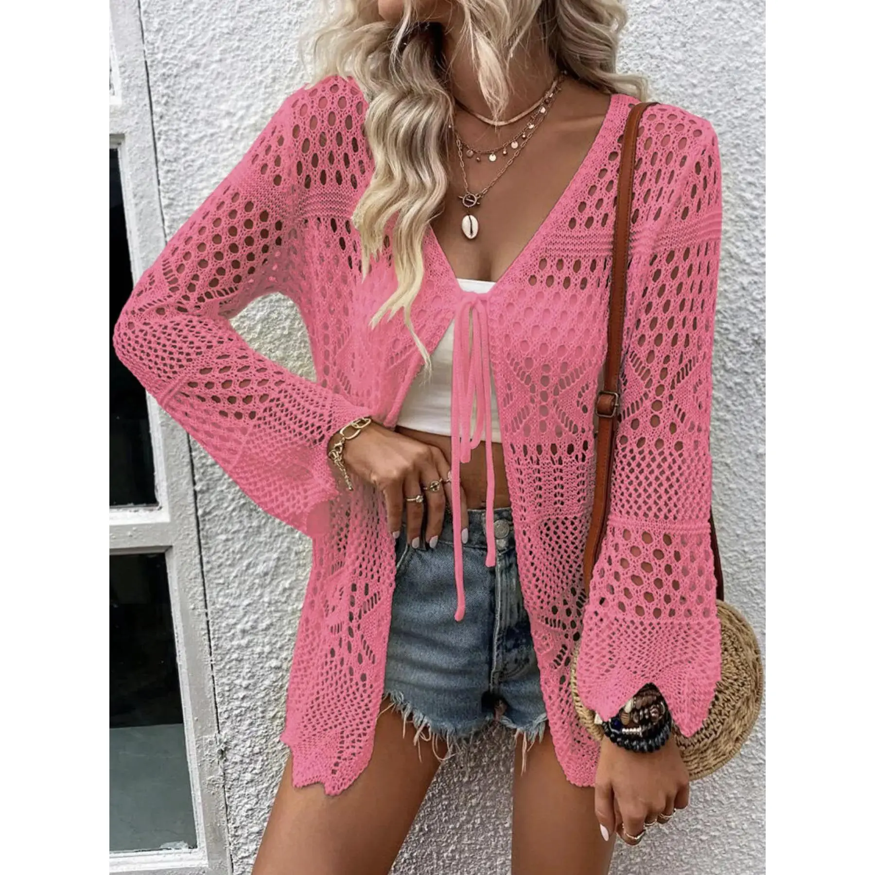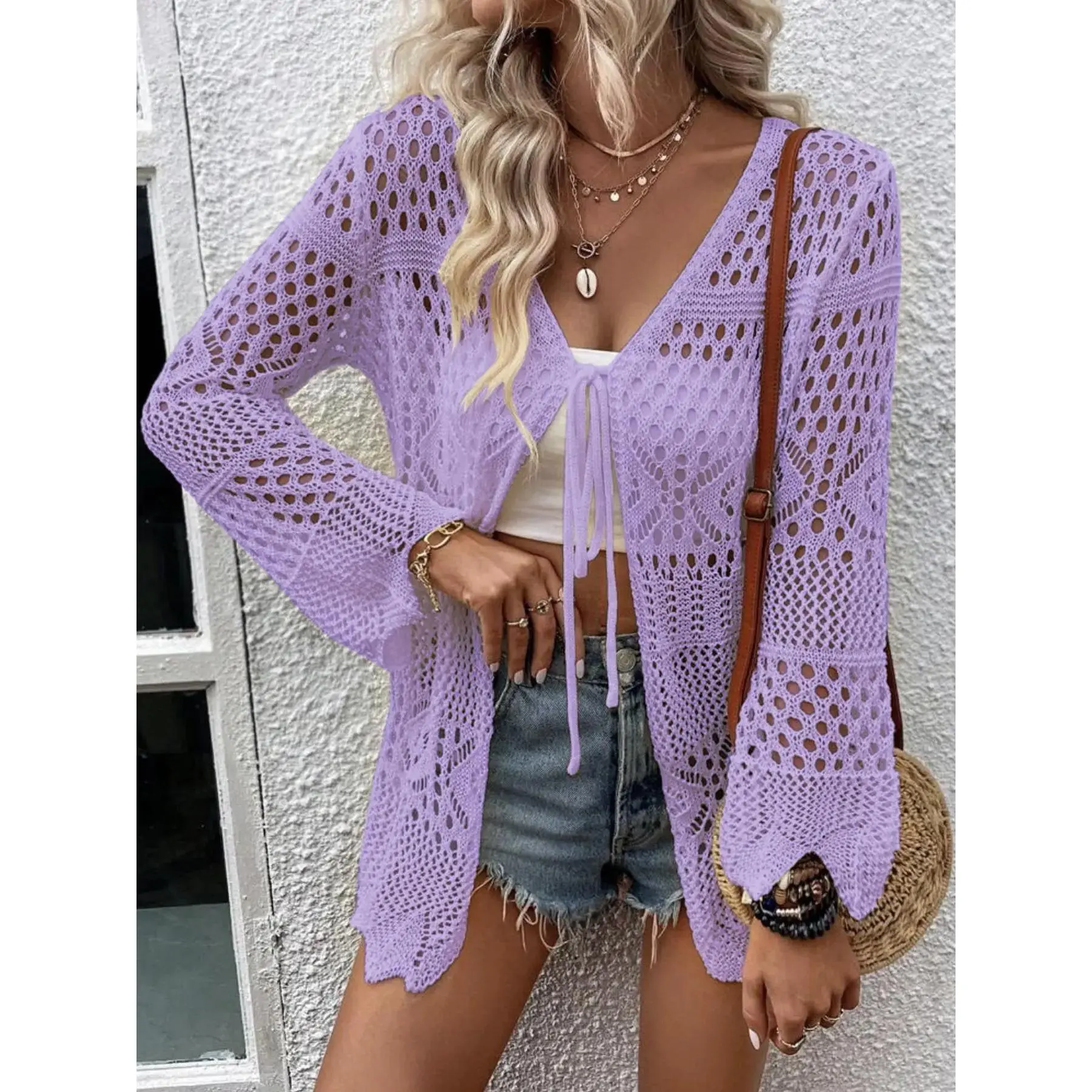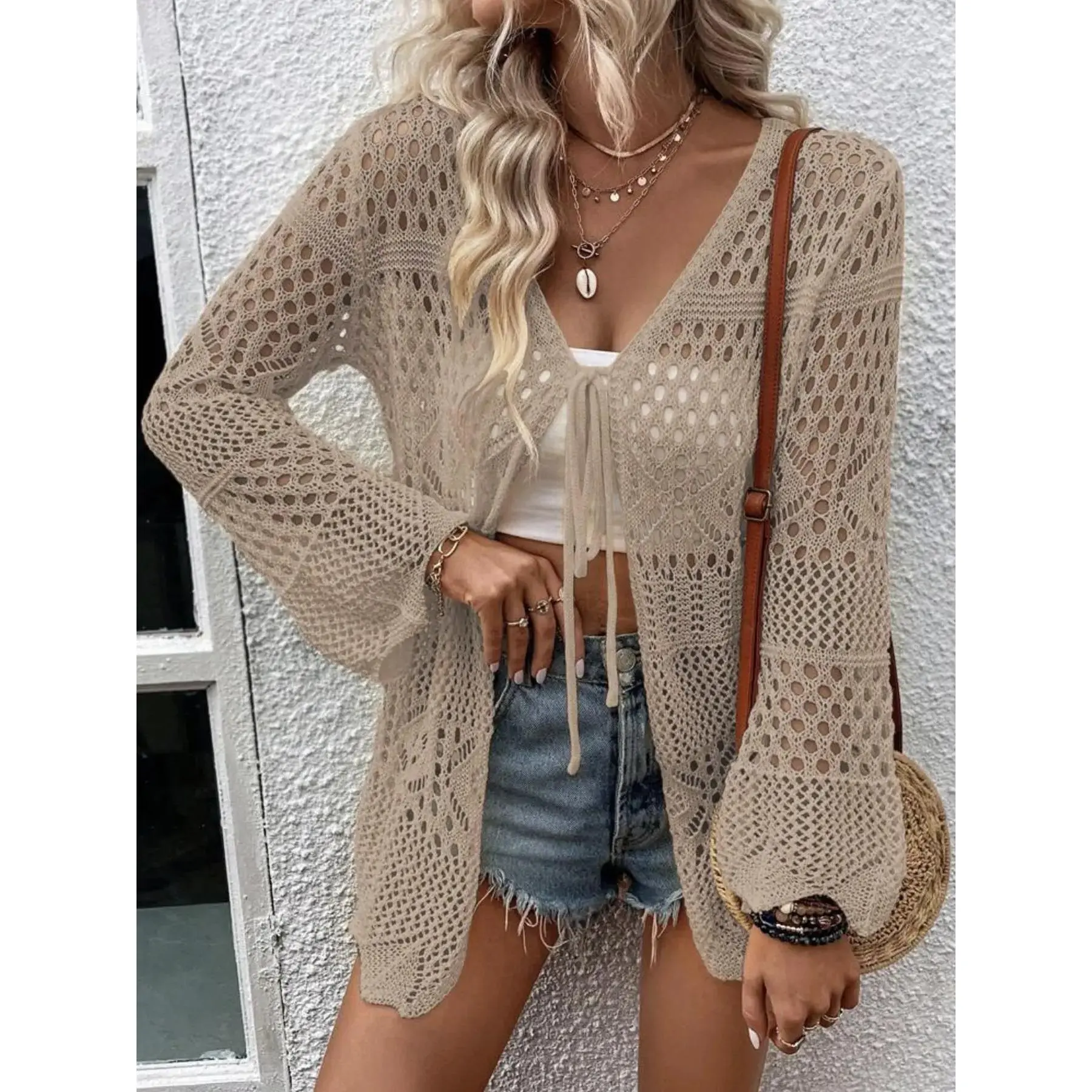 Women's Solid Color Hollow Out Tie Front Crochet Cardigan, Casual Long Sleeve Knitwear for Summer, Fashion Women's Knit Clothing for Daily Wear, Knitting