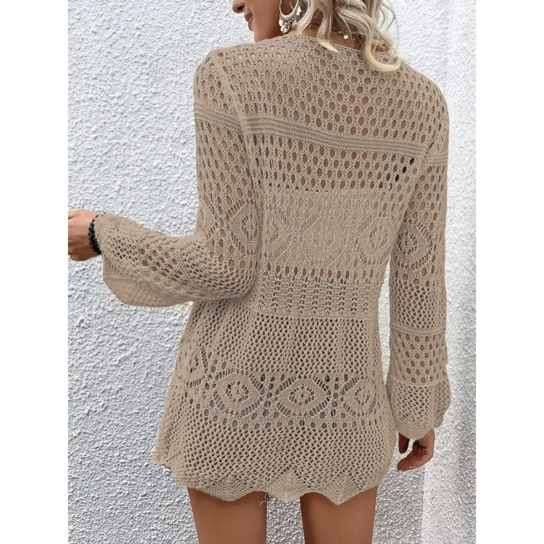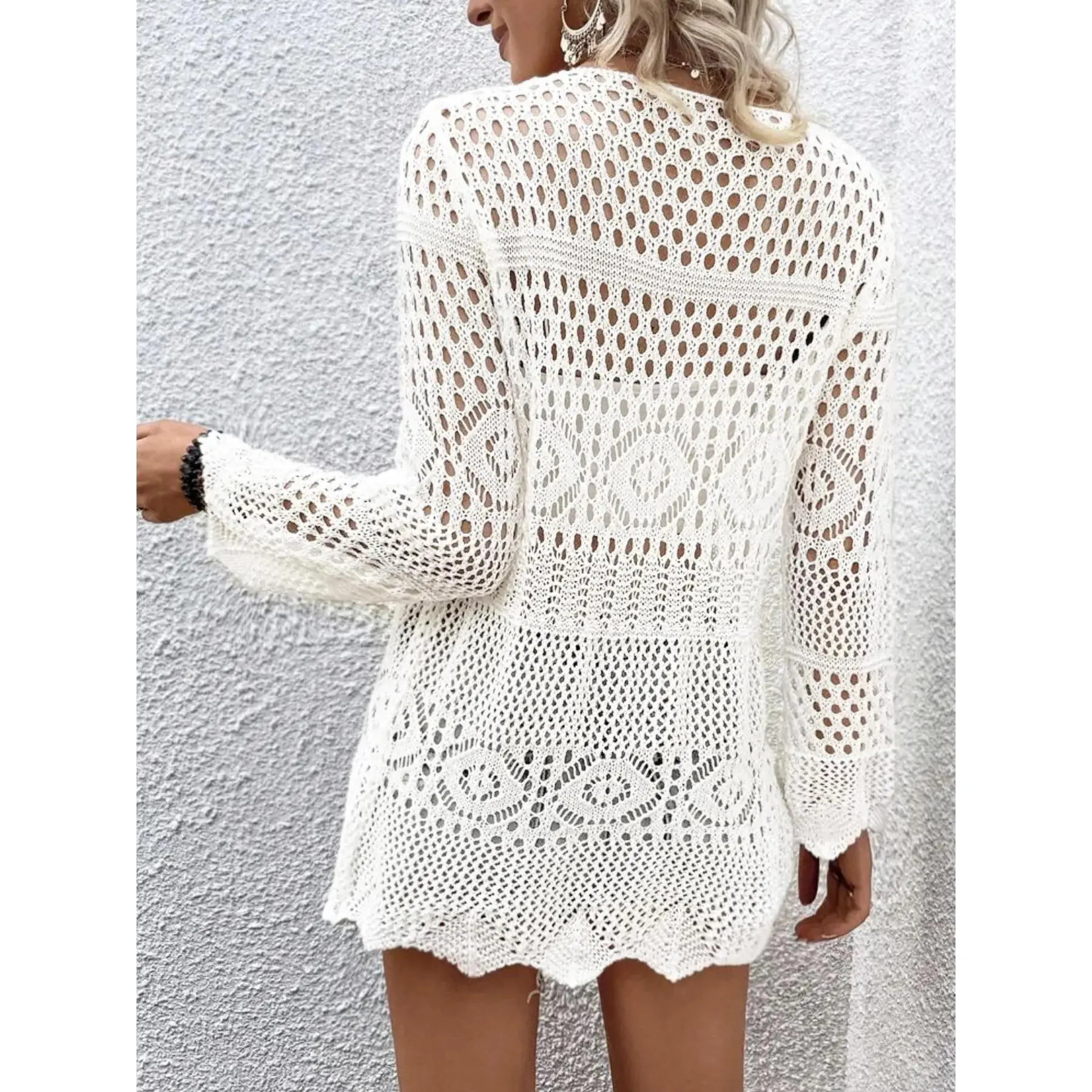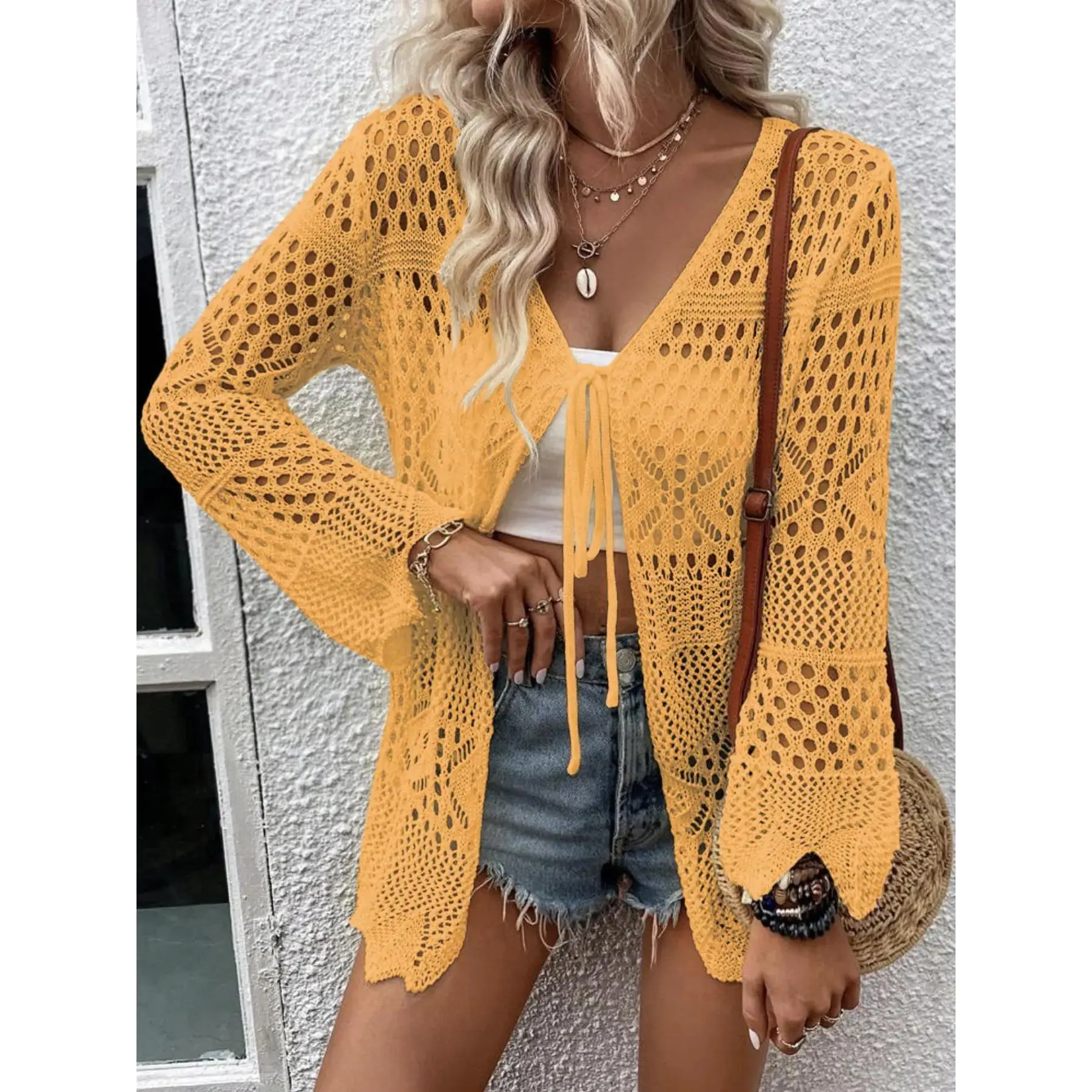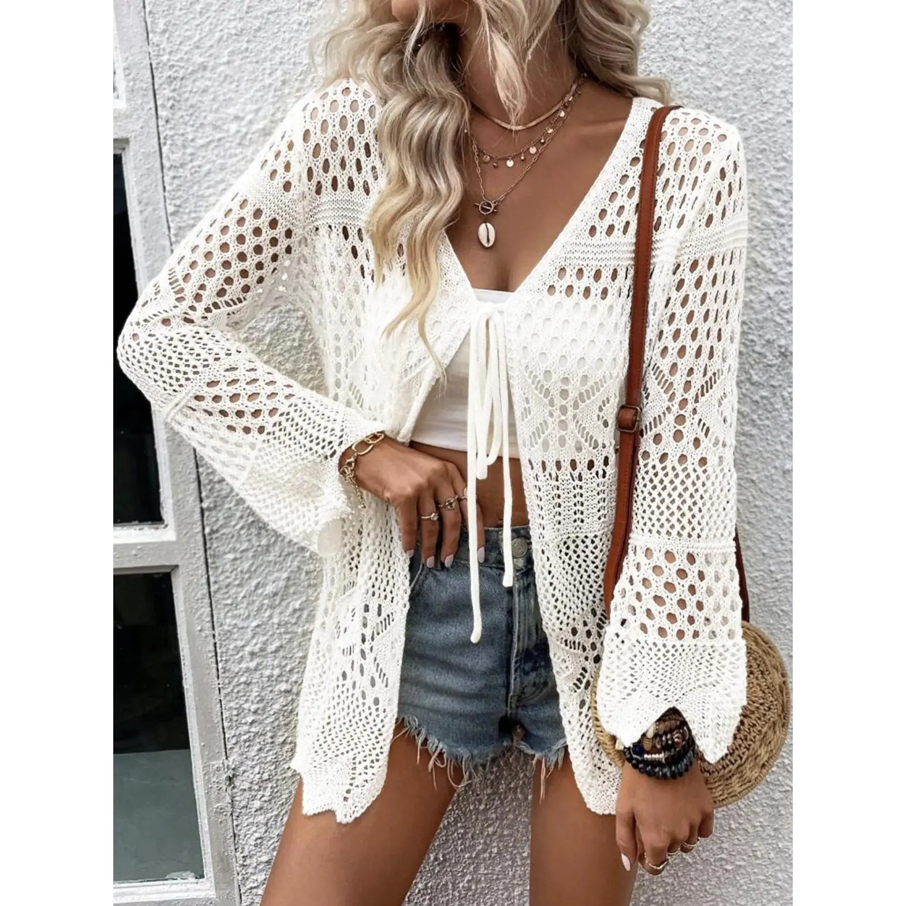 Women's Solid Color Hollow Out Tie Front Crochet Cardigan, Casual Long Sleeve Knitwear for Summer, Fashion Women's Knit Clothing for Daily Wear, Knitting
