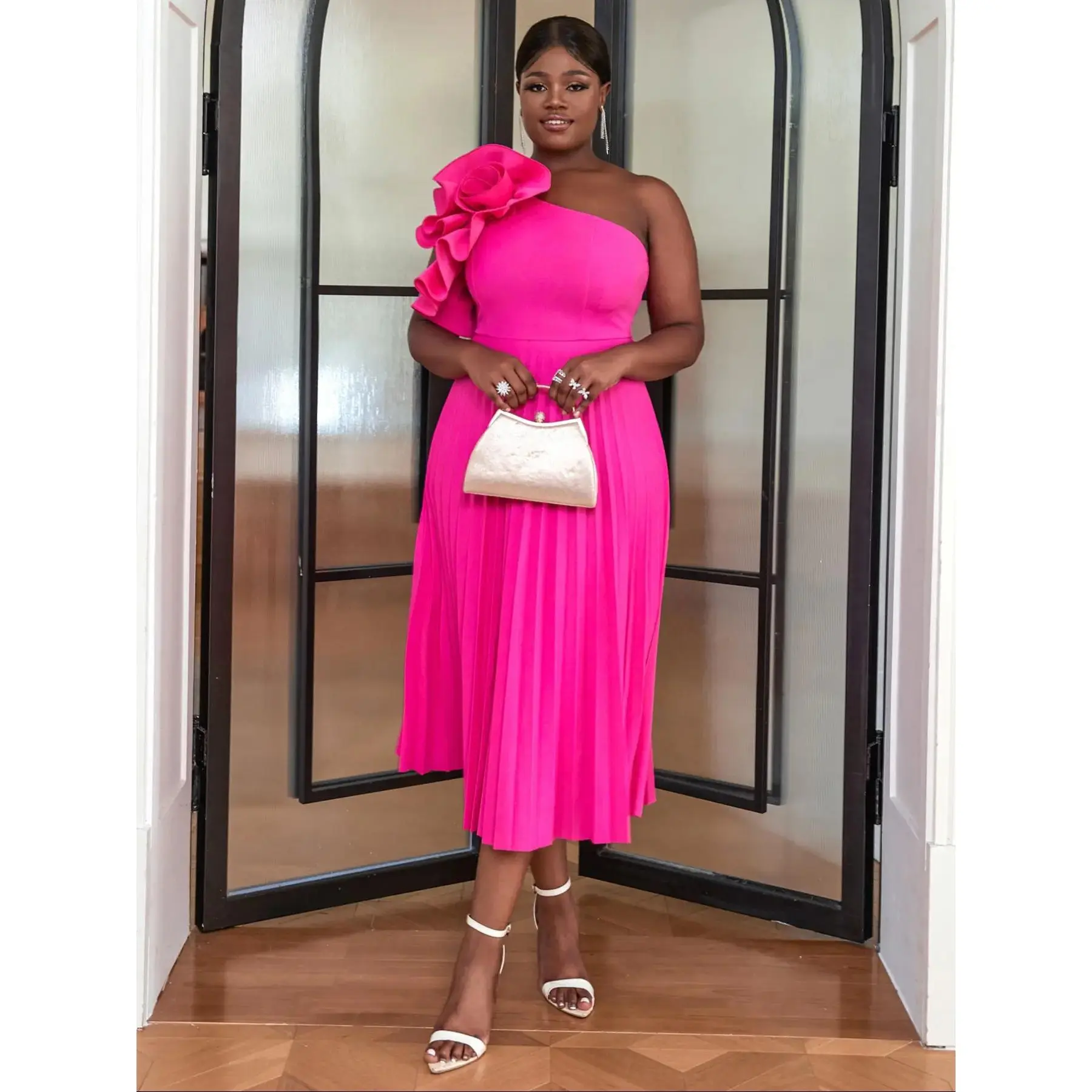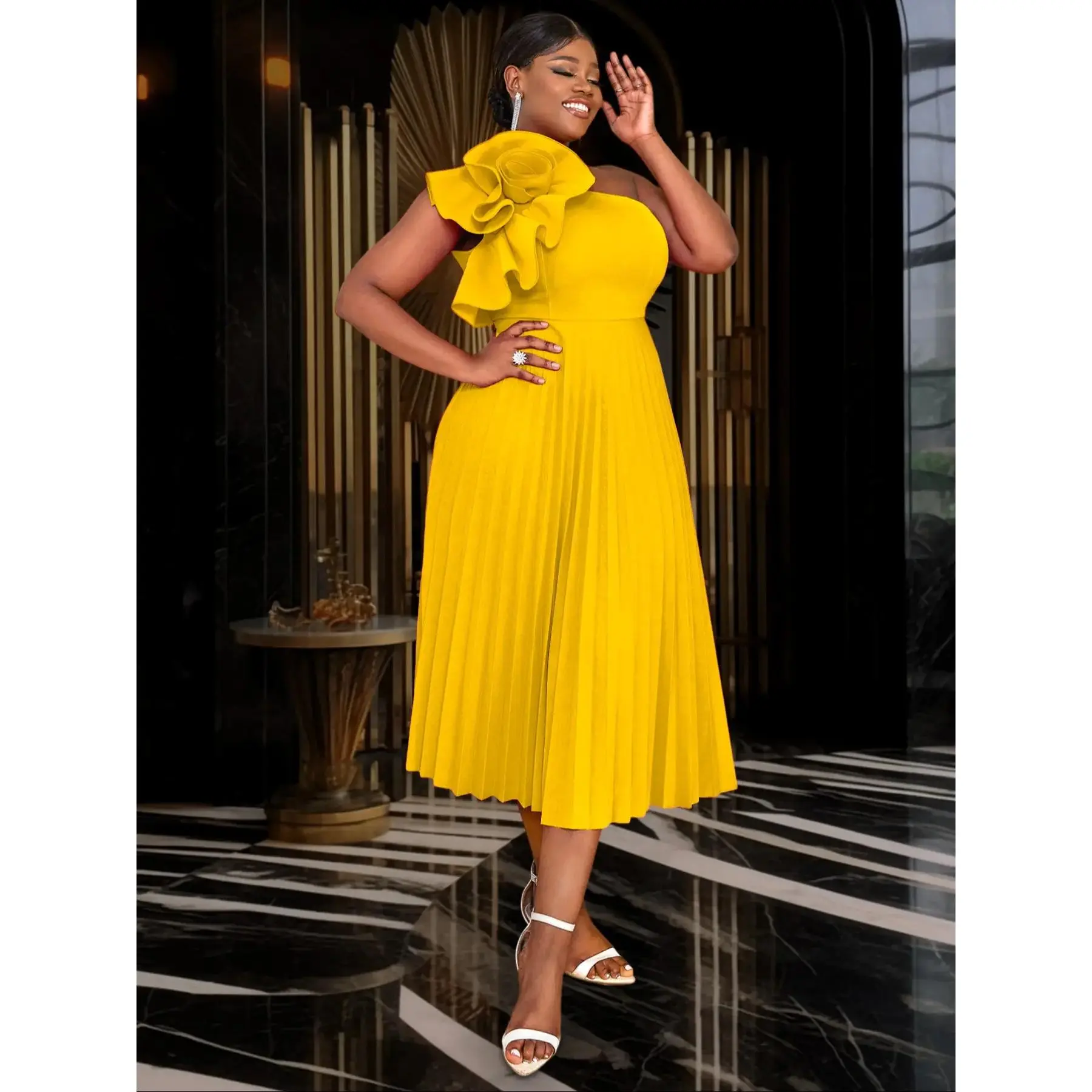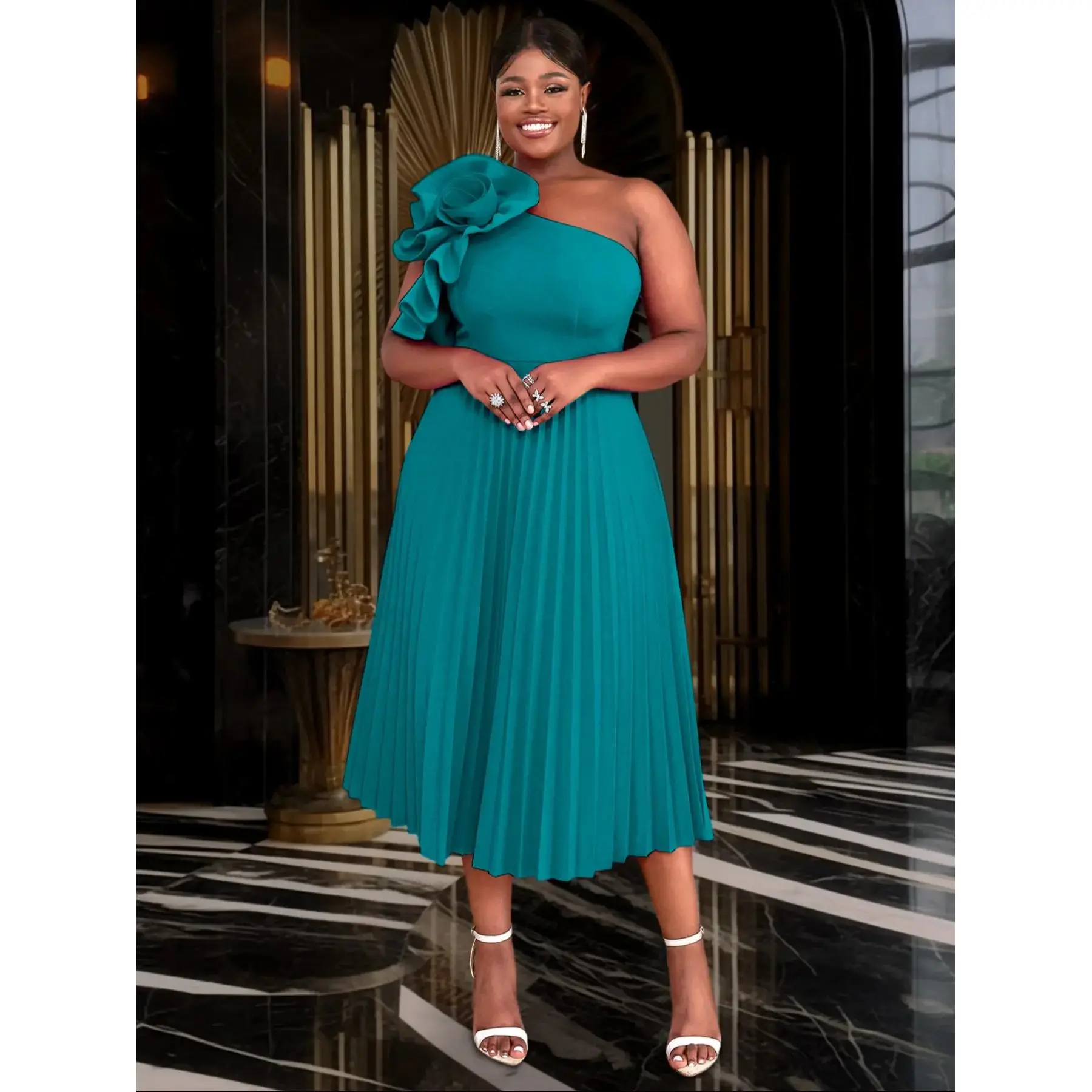 [Plus Size] Floral Design One Shoulder Bubble Sleeve Bustle Dress, Elegant Fashion Casual Ruffle Trim Evening Party Gown, Women Plus Clothing for All Seasons
