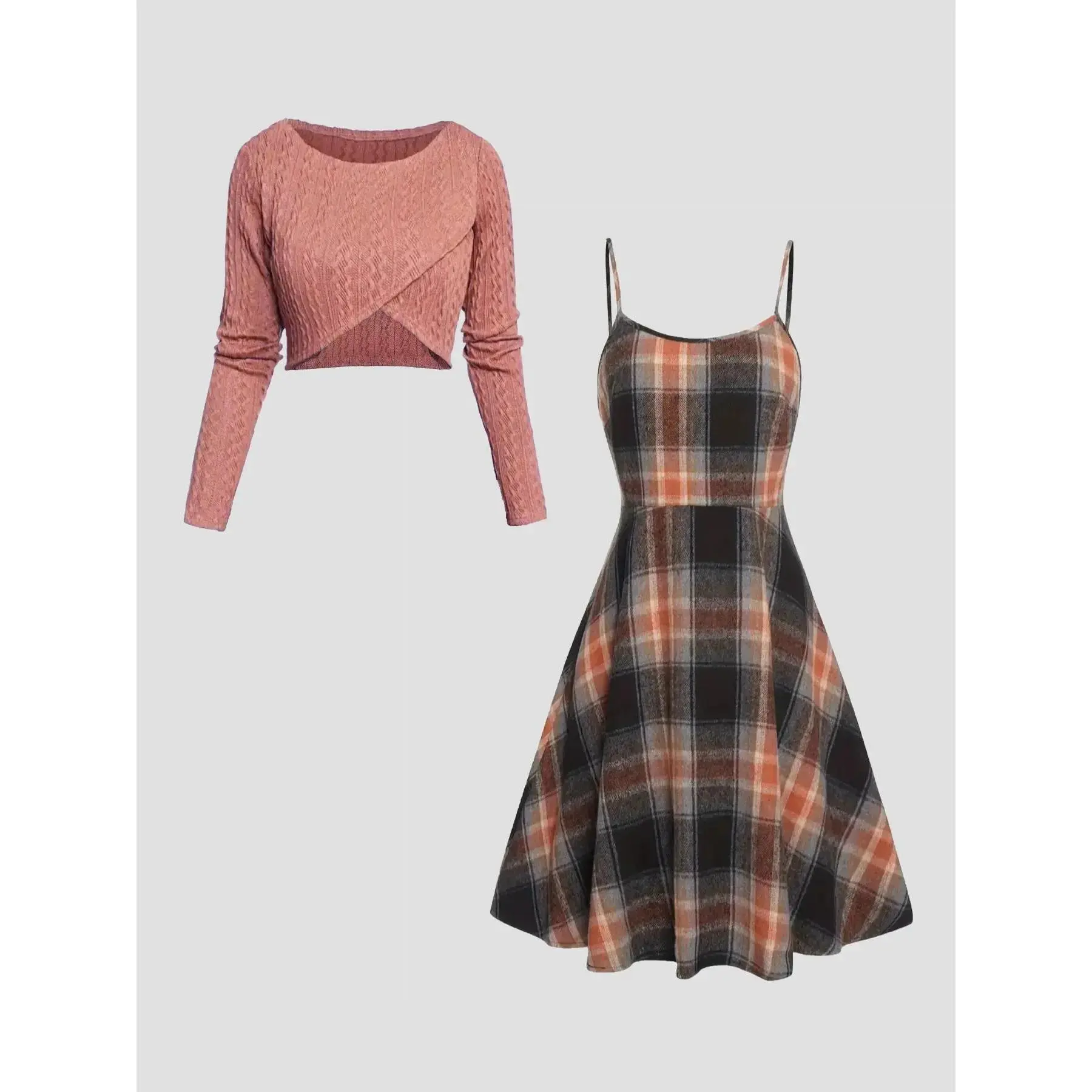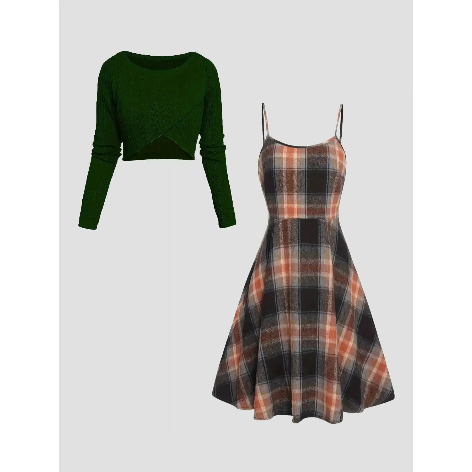 Women's Solid Wrap Hem Round Neck Textured Long Sleeve Crop Top & Plaid Print A-Line Dress Set, Preppy Casual Fashion Cozy Skirt Set for Daily School Outdoor Wear, Women's Clothing for Spring Fall