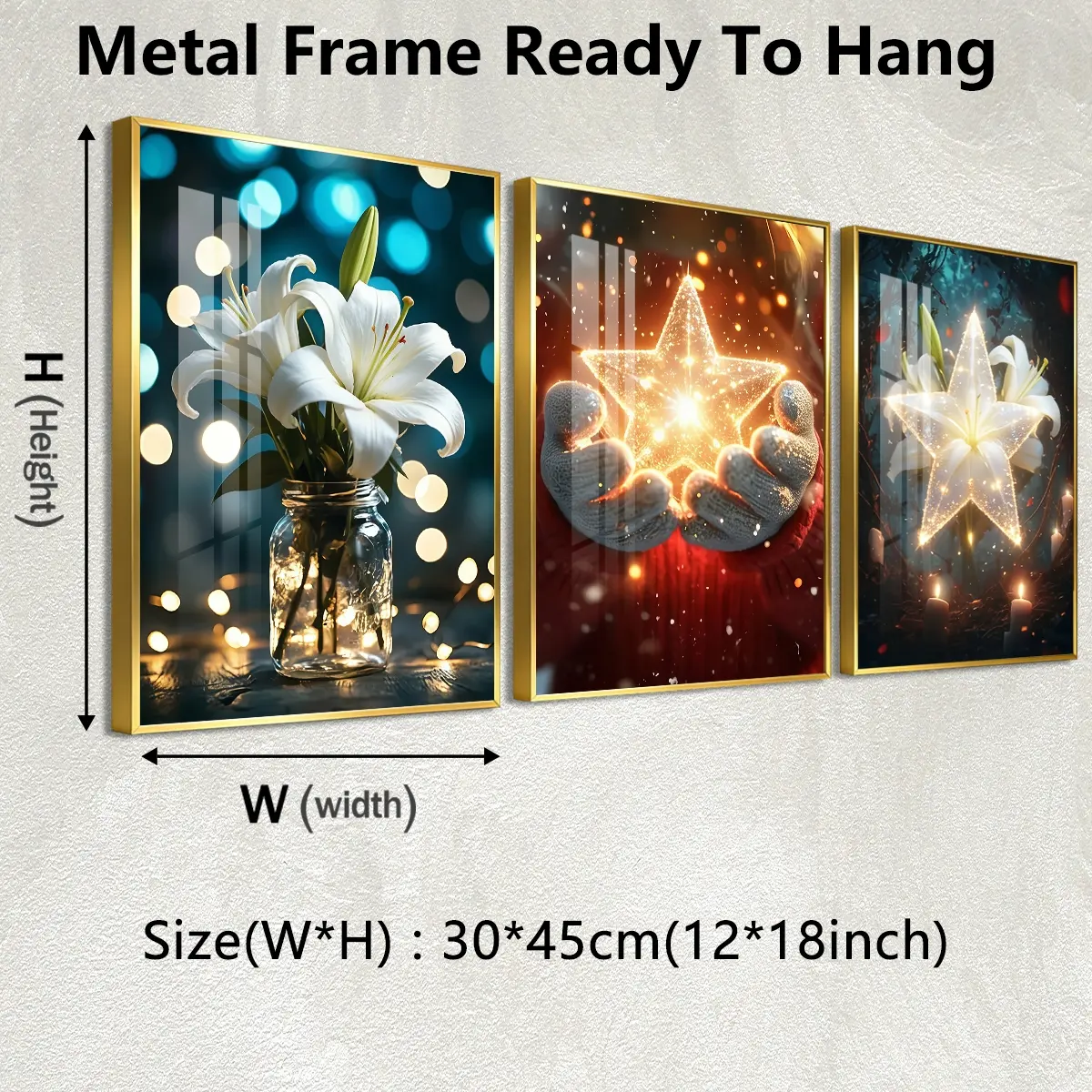 3 Counts Aluminum Alloy Framed Painting, White Lily And Glowing Star Art Pictures, Home Decoration For Living Room, Bedroom, Office, Restaurant, Hallway Wall Decor, Odorless Print Artwork, Luxury Perfect Gift For Friends And Family