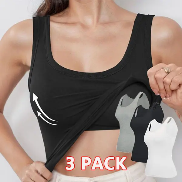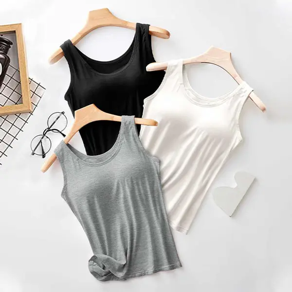 3-Piece Tank Top Set - Solid Color Stretch Knit, Built-in Padded Cups, Round Neck, Breathable Fabric, Women's Casual Sports Bra, Adjustable Strap Spaghetti, Basic Everyday Wear Light Stretchy