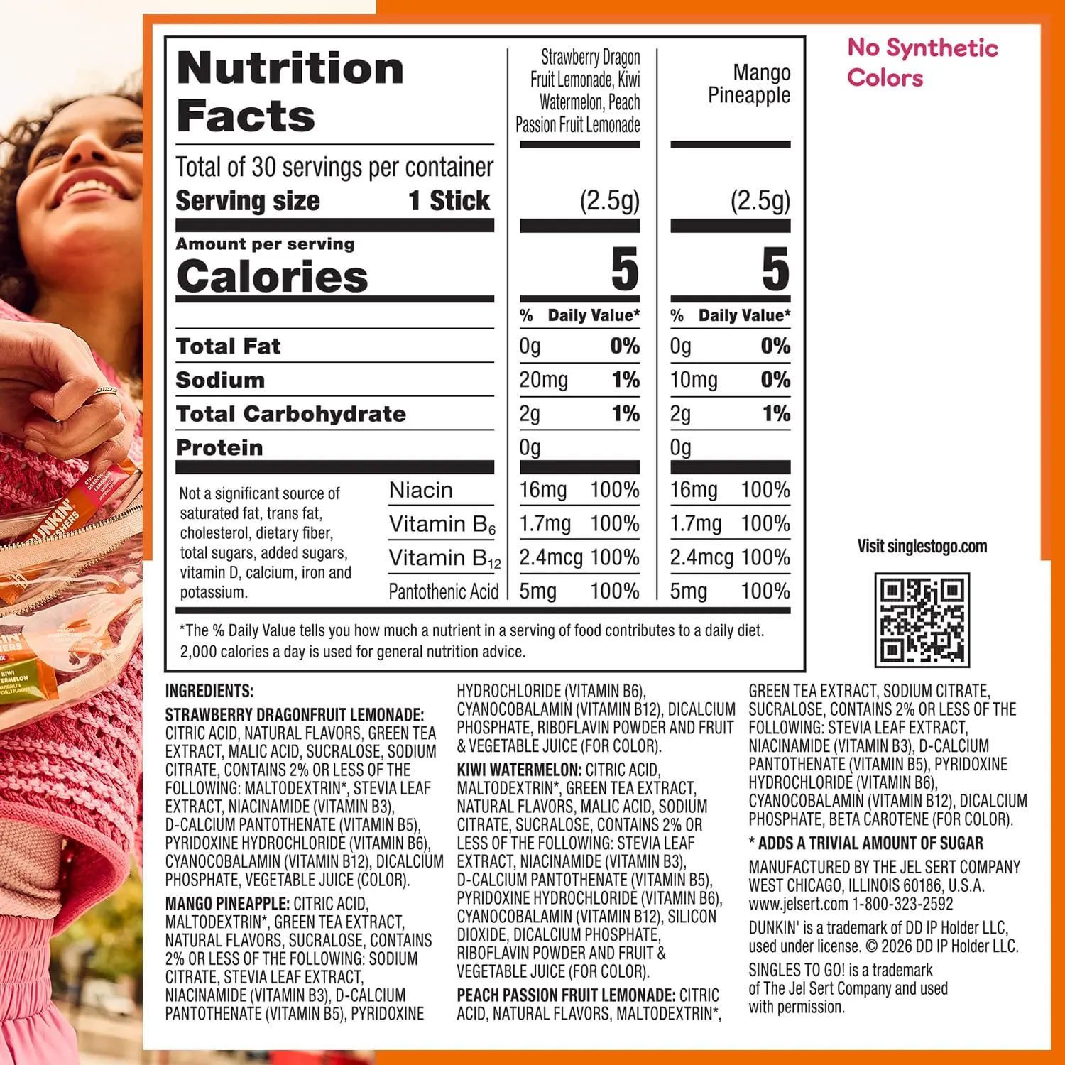 ·Each box comes with 30 individual drink mix sticks of Dunkin’ Refreshers Singles To Go! drink mix, available in 4 delicious flavors. Naturally and artificially flavored drink mix. For best results, mix one stick with 16.9 FL OZ of water.