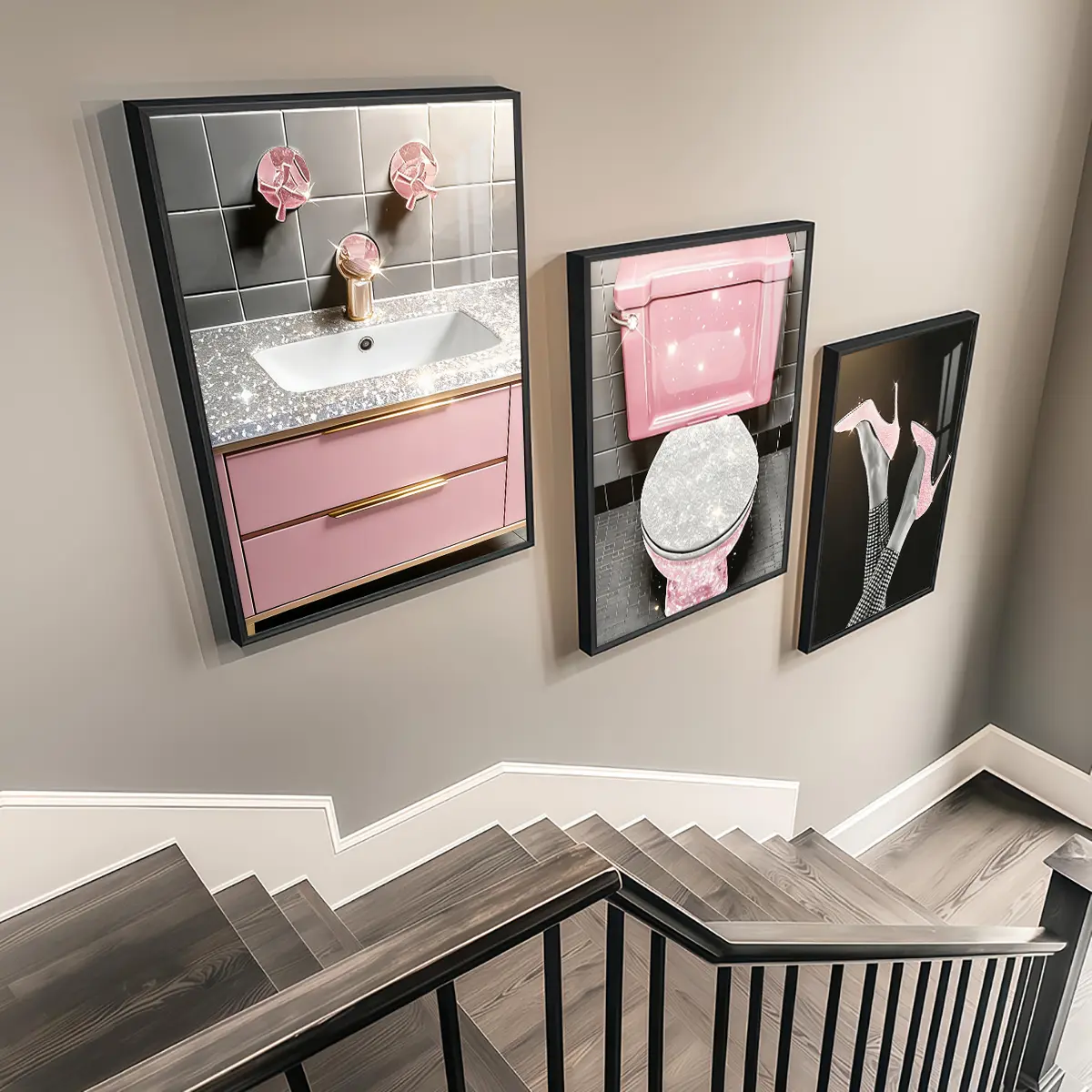 3 Counts Aluminum Alloy Framed Painting, Pink Glam Bathroom And High Heels Art Pictures, Home Decoration For Living Room, Bedroom, Office, Restaurant, Hallway Wall Decor, Odorless Print Artwork, Luxury Perfect Gift For Friends And Family
