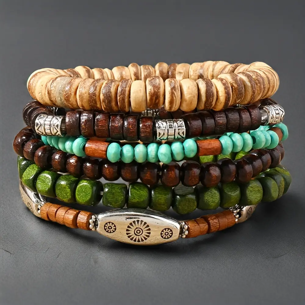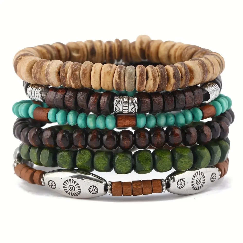 6pcs Set of Coconut Wood Bead Elastic Cord Minimalist Bohemian Style Men's Bracelet Bangle