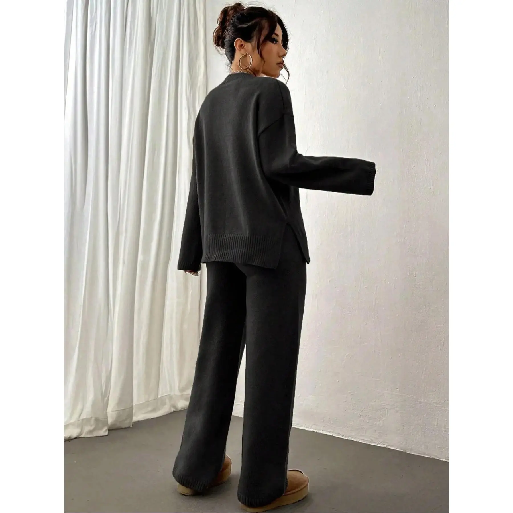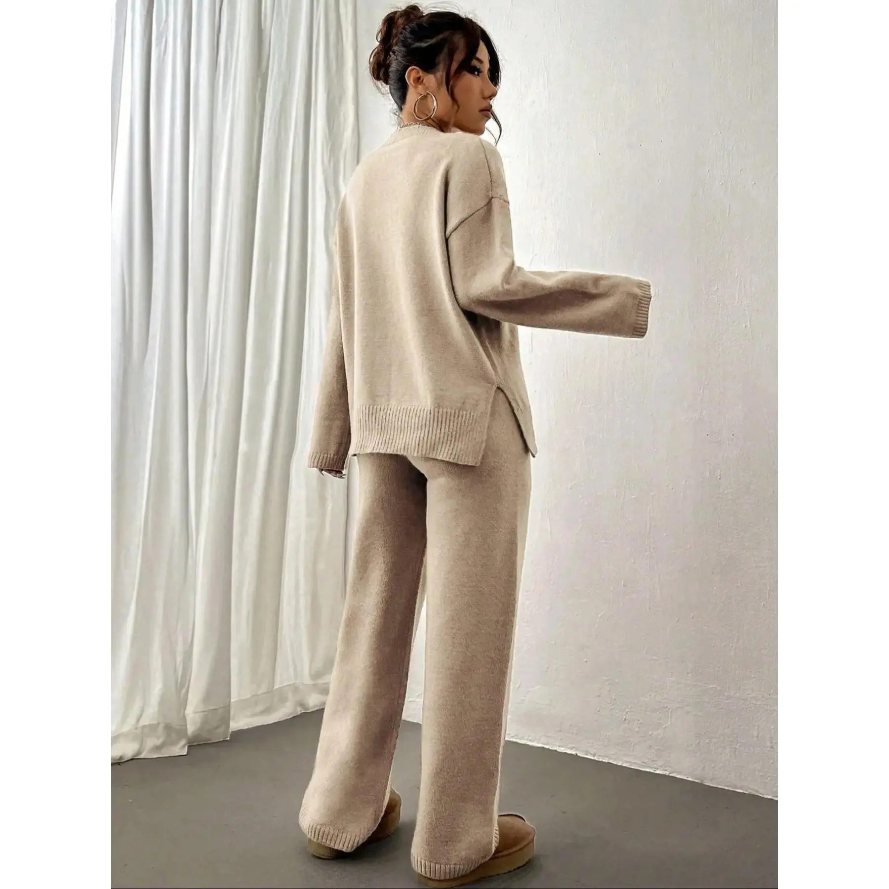 Plus Size Two-Piece Set Solid Mock Neck Drop Shoulder Sleeves Split Hem Sweater & Straight Leg Pants, Casual Fashion Cozy Knitwear Set for Daily Outdoor Wear, Women Clothing for Fall & Winter