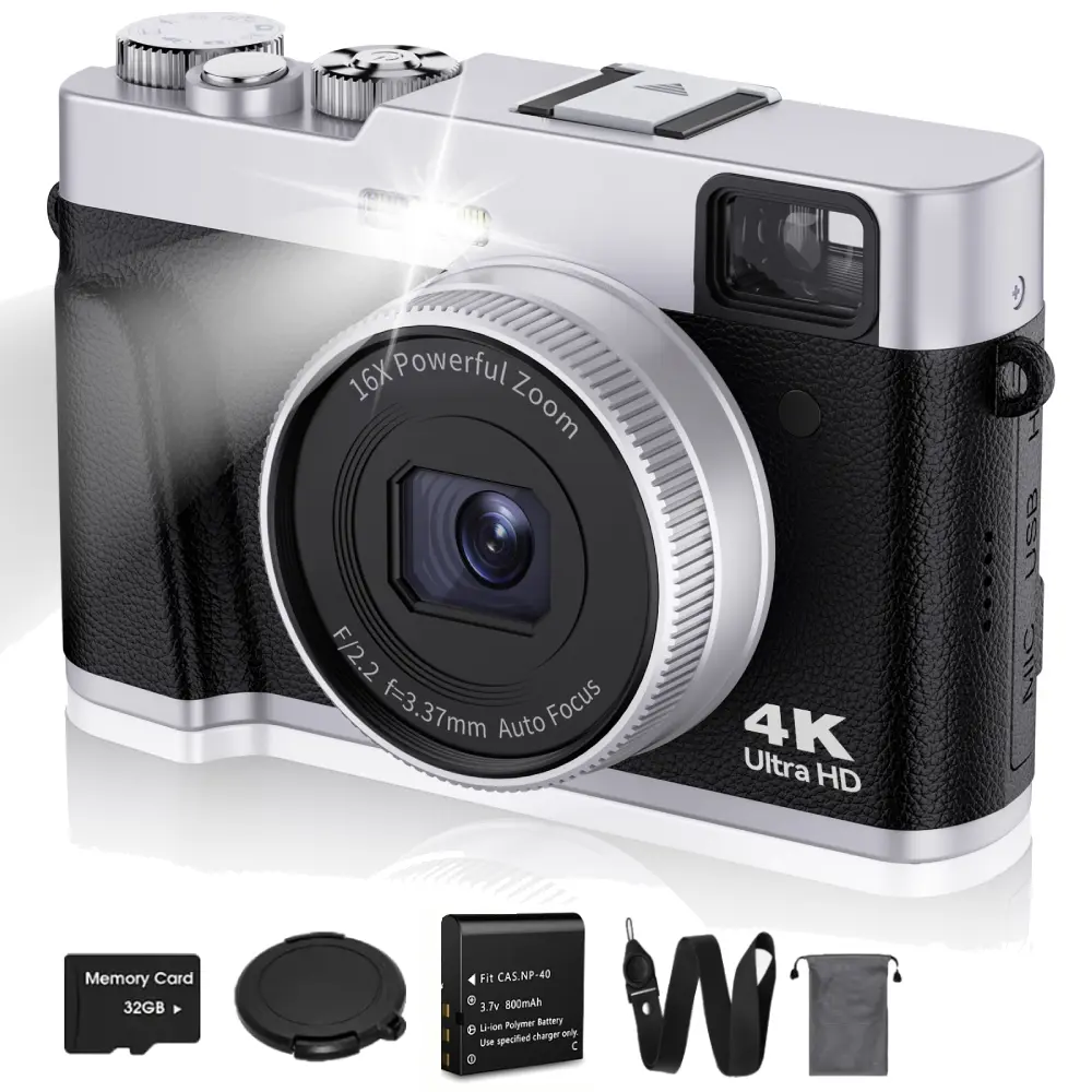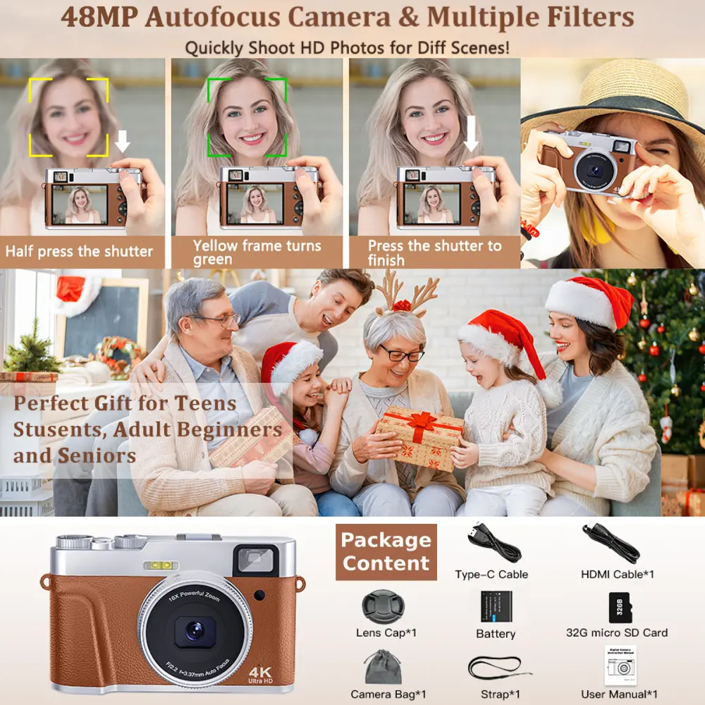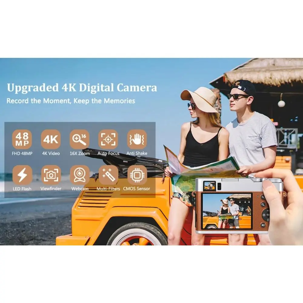 48MP 4K digital camera captures stunning photos and videos. This vlogging camera with viewfinder reduces the impact of solid lights for summer shooting and helps beginners achieve professional compositions! The video camera with flash allows you to record cultural landscapes with exceptional clarity even in the darker. And the CMOS true-color technology ensures that every shoot is captured with fine & authentic texture.