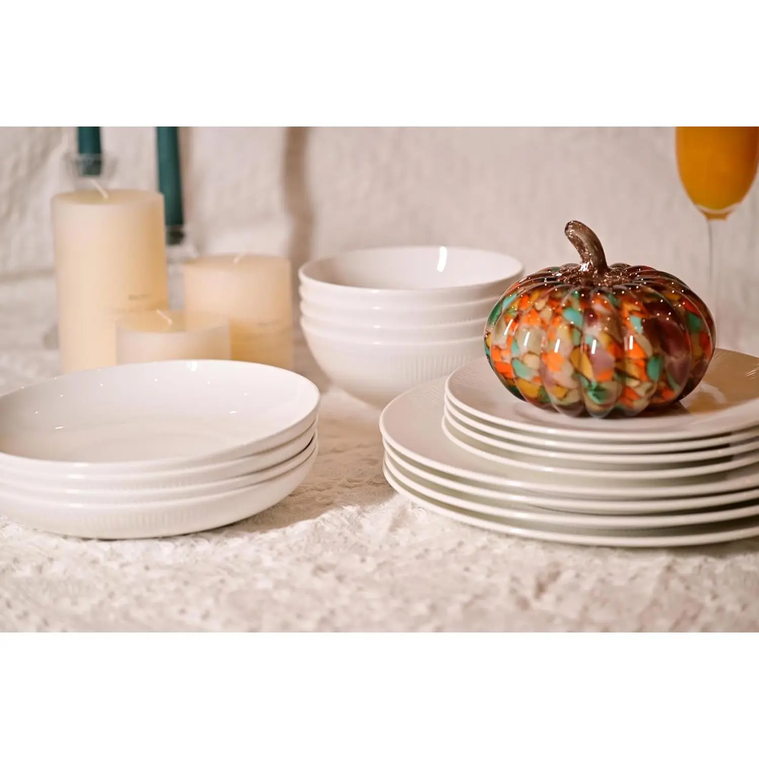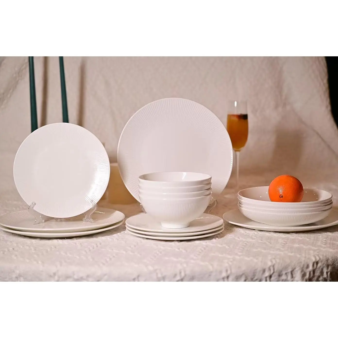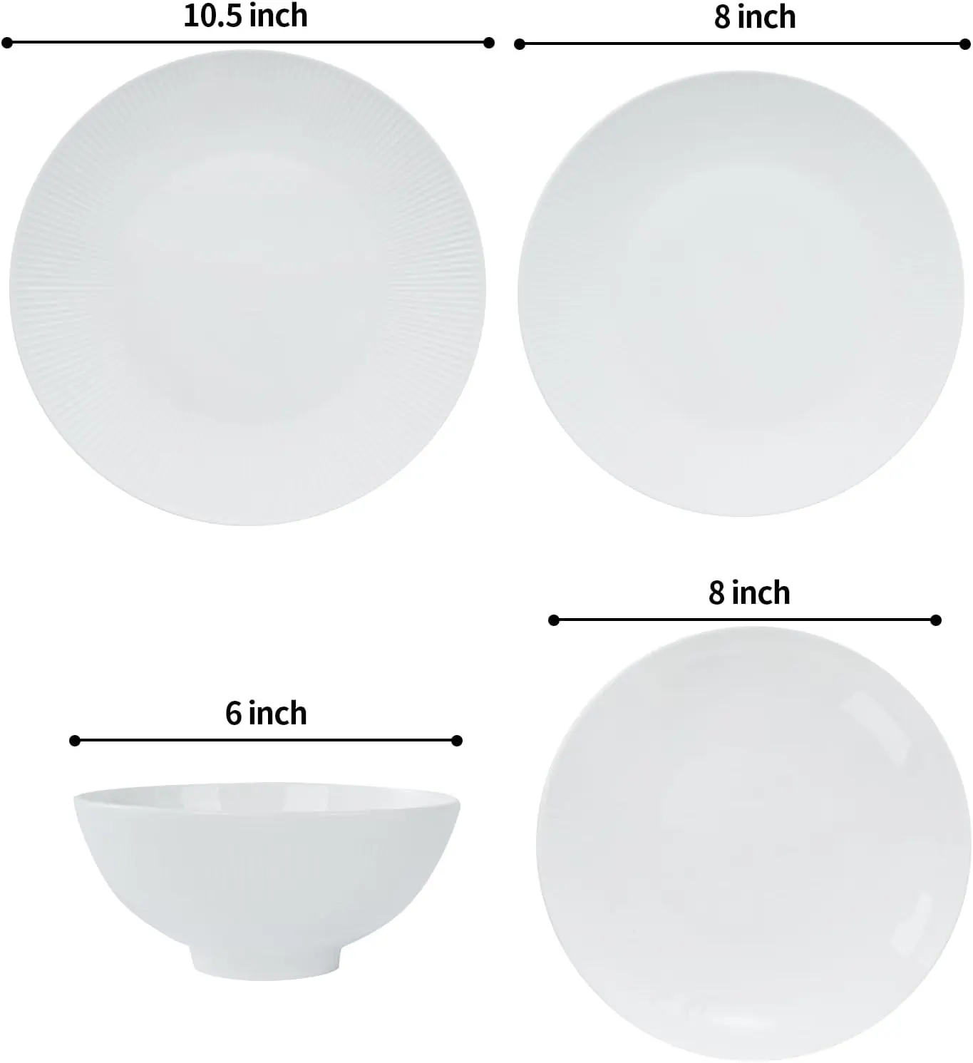 Dandilion Bone China Dinnerware Set, 16 Pieces, Service For 4, Plates, Dishes, Bowls Set, Microwave And Dishwasher Safe, Ivory White With Radial Lines