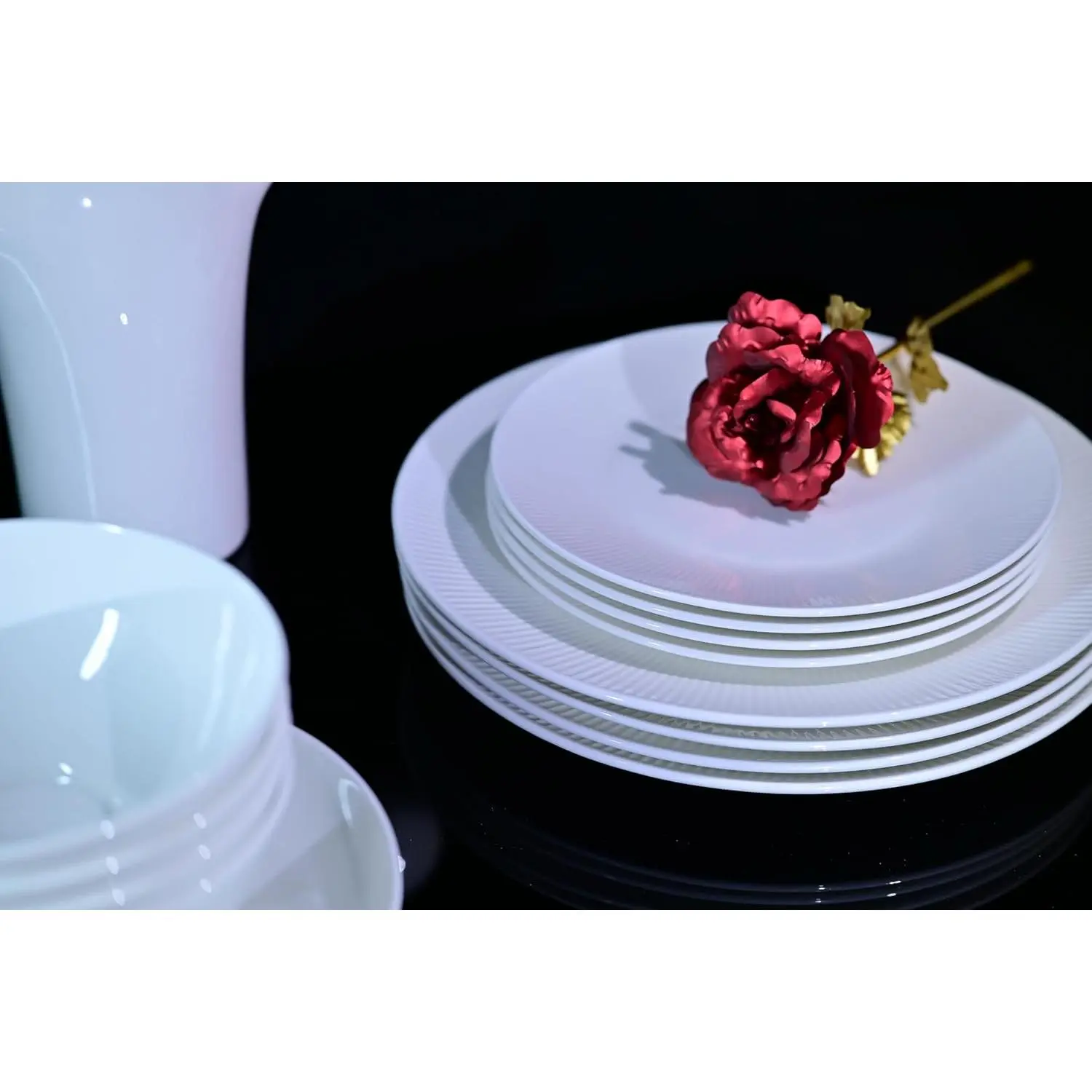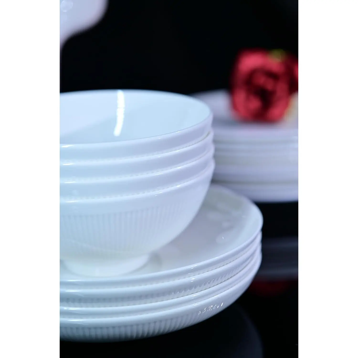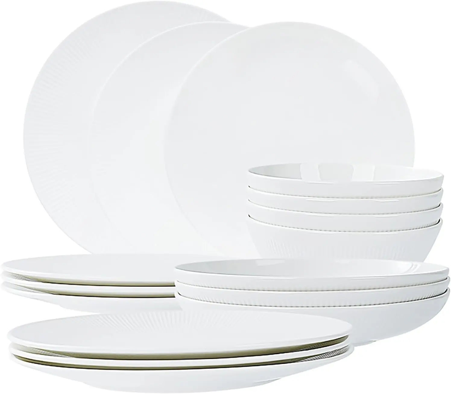 Dandilion Bone China Dinnerware Set, 16 Pieces, Service For 4, Plates, Dishes, Bowls Set, Microwave And Dishwasher Safe, Ivory White With Radial Lines