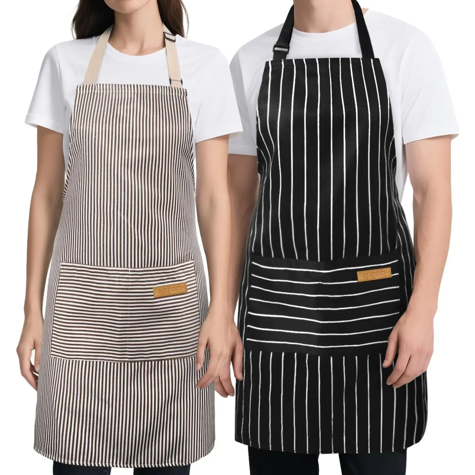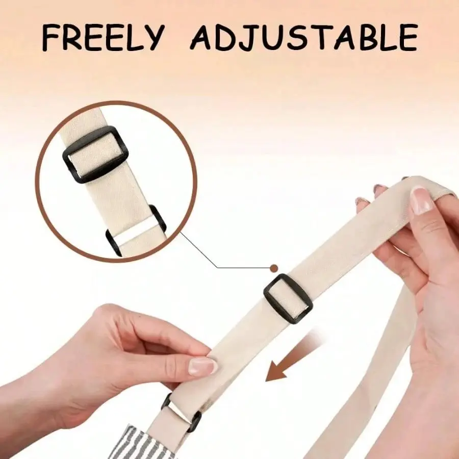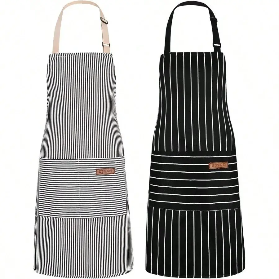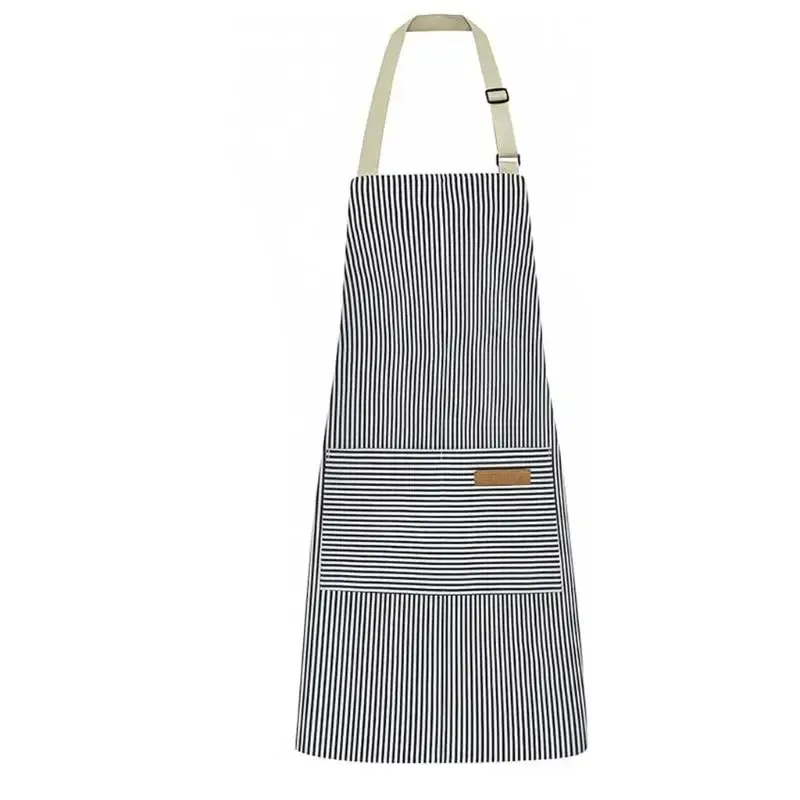Adjustable neck strap apron with classical striped design offers a comfortable, customizes fit for various body type, perfect for kitchen, gardening, or restaurant use.