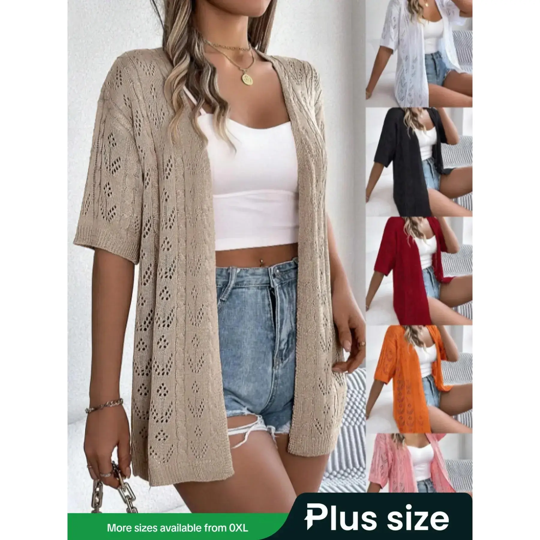 [Plus Size] Solid Lace Hole Design Cardigan, Casual Open Front Short Sleeve Knitwear for Daily Wear, Women's Plus Clothing for All Seasons, Tops, Knitting Sweater Cardigan