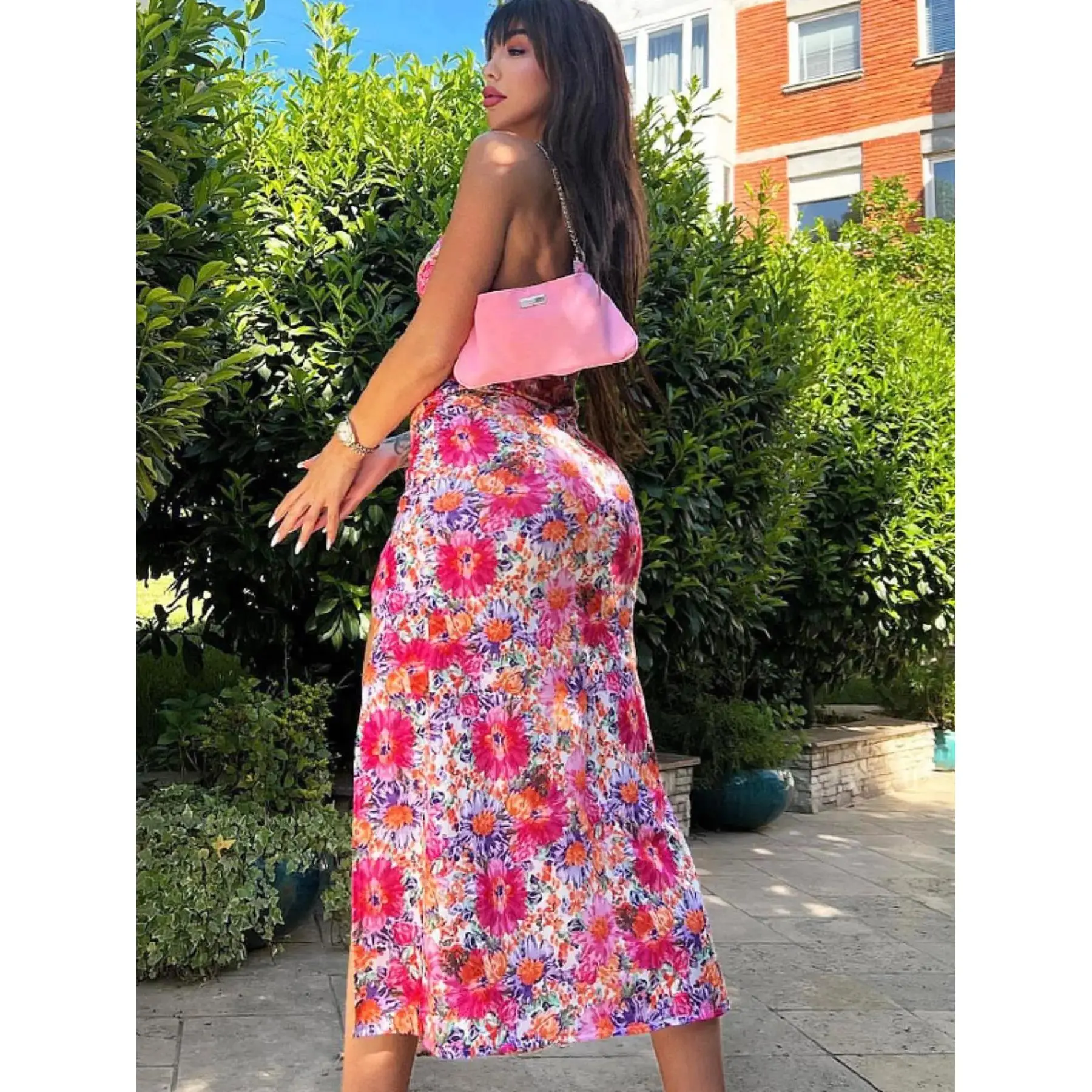 Multi Colors, Sexy V-neck Suspender, Mid Length Skirt, Split Suspender, Casual Dress, Suitable for Daily Wear, Resort Beach Party, Sisters Dress, Flower Watercolor Printing