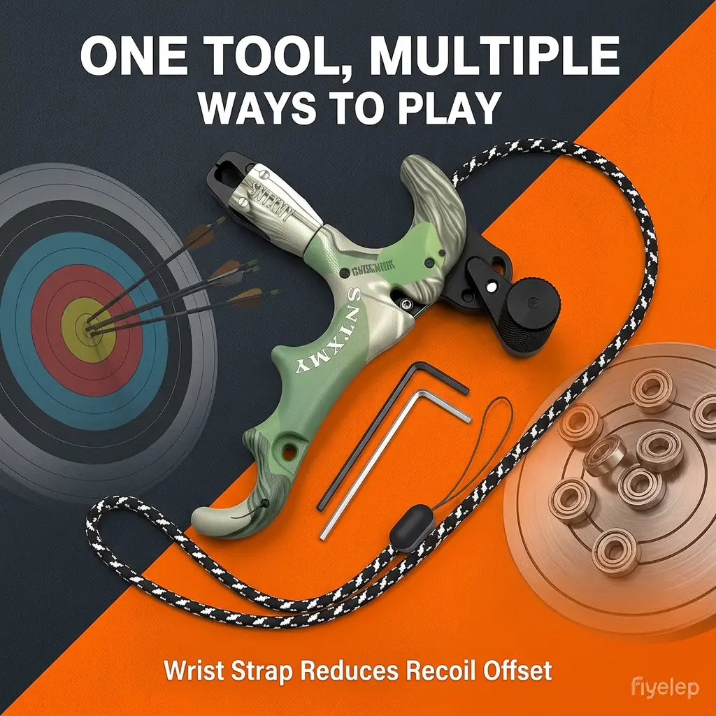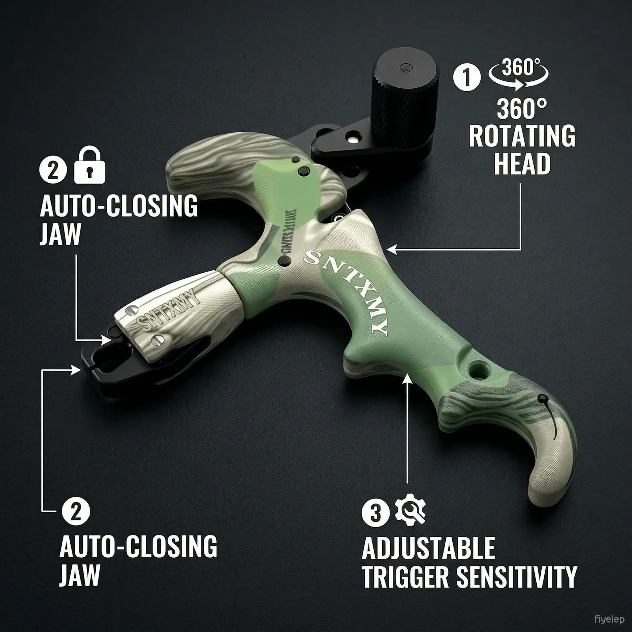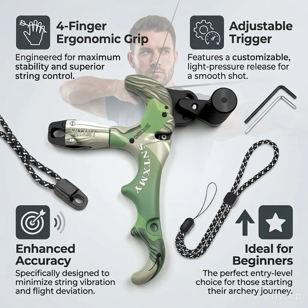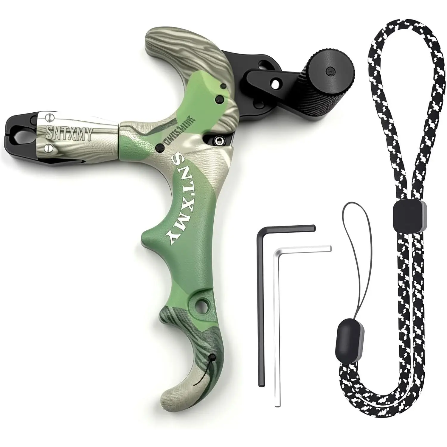 Camouflage 4-Finger Compound Bow Release Aid 360 ° Rotating Auto-Close Jaw Aluminum Head Adjustable Trigger Sensitivity Smooth Release for Hunting Archery Target Practice Outdoor Shooting Bow Accessories Must-Have Gear for Archers Improve Accuracy Consi