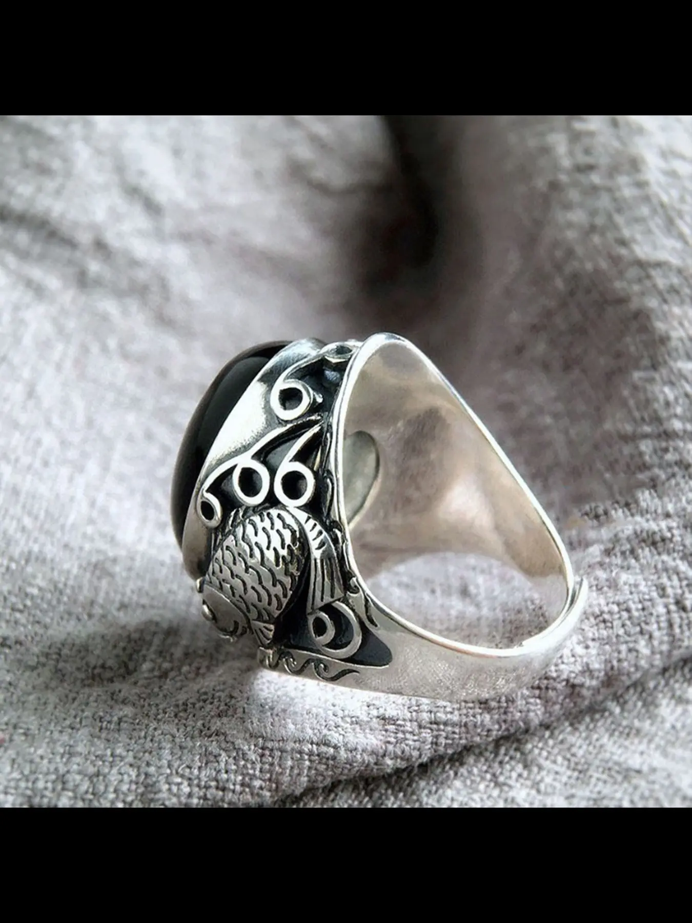 Vintage Obsidian Ring for Men, Koi Fish Ethnic Pattern, Adjustable Copper Chain, Casual Style, All Seasons Jewelry
