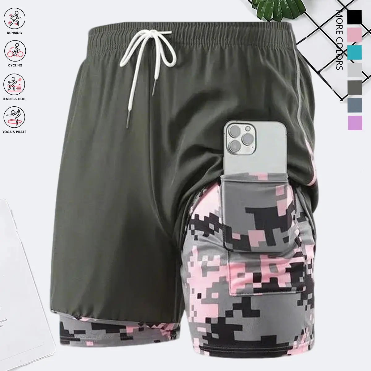 Women’s summer shorts: double-layer faux two-piece mid-length shorts; camouflage women’s shorts; polyester–spandex knit fabric shorts; breathable, quick-drying compression base layer shorts; elastic waistband with drawstring; side mesh pockets; suitable f