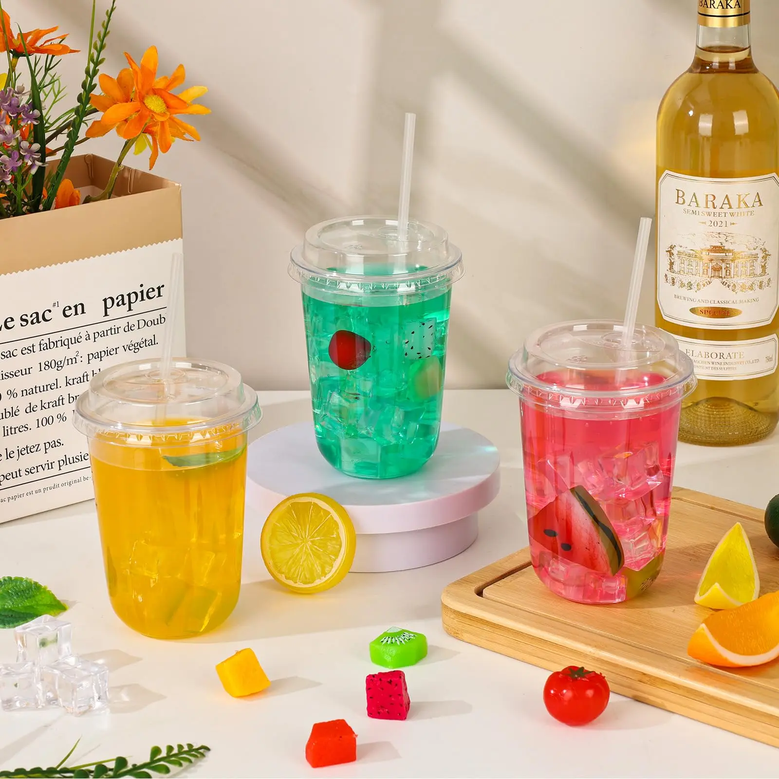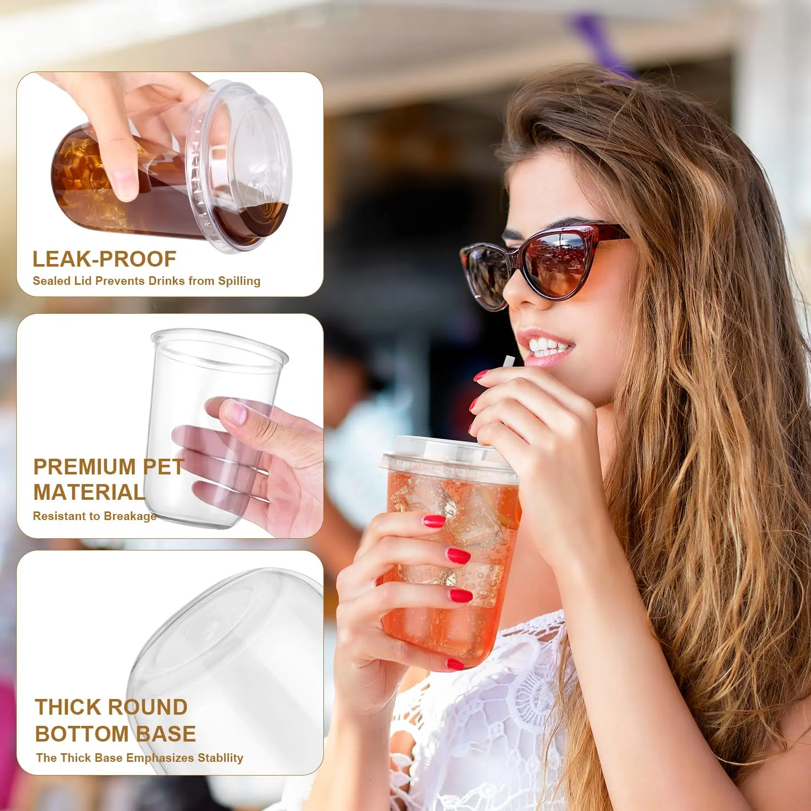 Premium Material: Our round bottom plastic cups with lids are crafted from thickened PET plastic material, which is no BPA, shatter-resistant, long-lasting, odorless, and meet food-grade standards.Whether for personal household use or commercial settings like coffee shops and restaurants, you can confidently use them to serve various beverages and savor every delightful moment