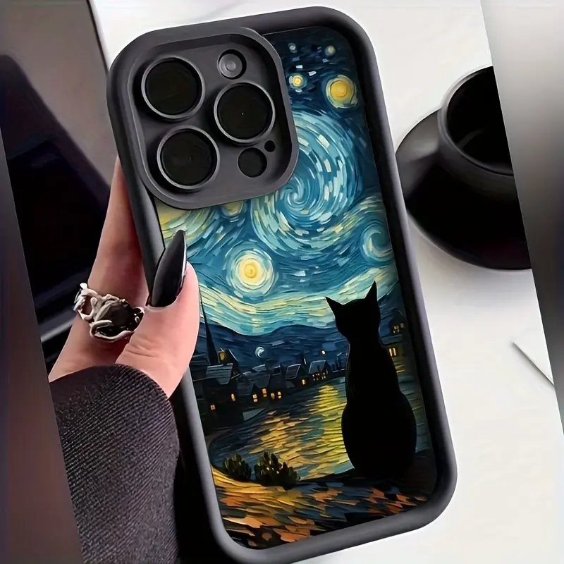 Phone Case: Suitable for iPhone 17 E Air Pro ProMax iPhone16 15 14 Plus 13 12 Mini 11 X XS XR, Black, Featuring a Cat Looking at the Stars from Among Tall Bamboos