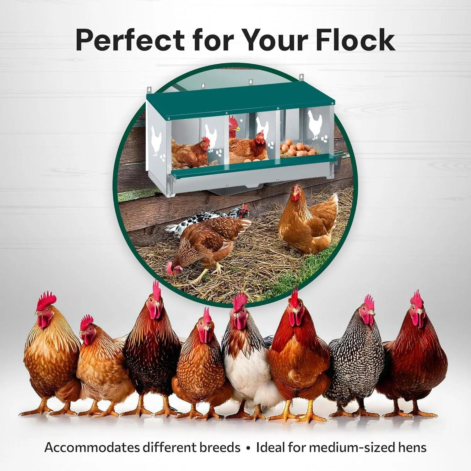 [LARGE & COMFORTABLE NESTING SPACE] - Each nesting compartment measures a roomy 11.2 inches, giving larger hens plenty of space to move comfortably and lay stress-free. Comes with 4 fake eggs that encourage hens to lay naturally and 10 soft nest pads    that keep the nesting area warm, dry, and inviting.